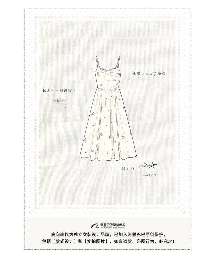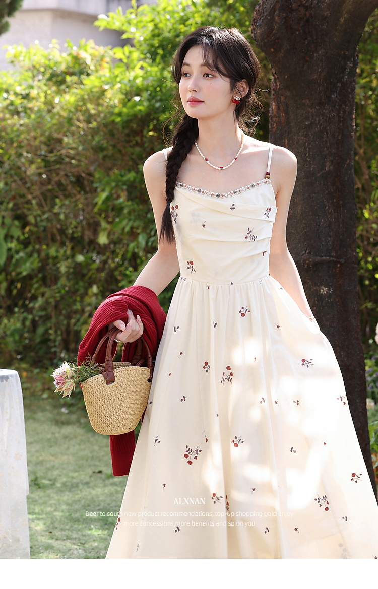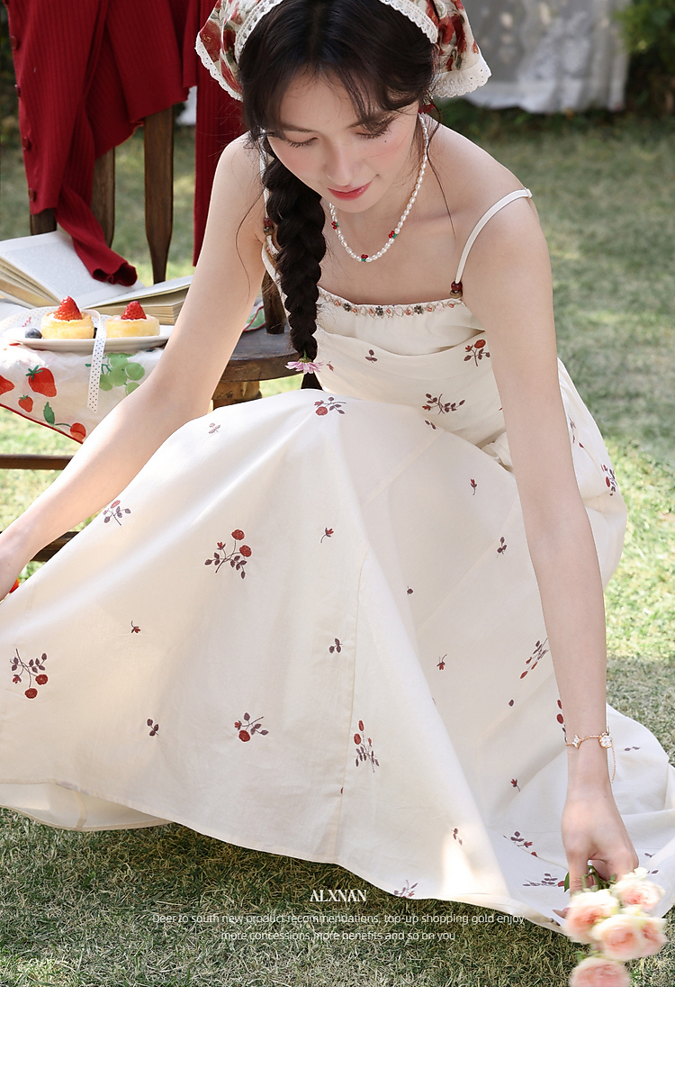 鹿向南「田园」杏色法式气质刺绣碎花连衣裙女春夏收腰长款吊带裙