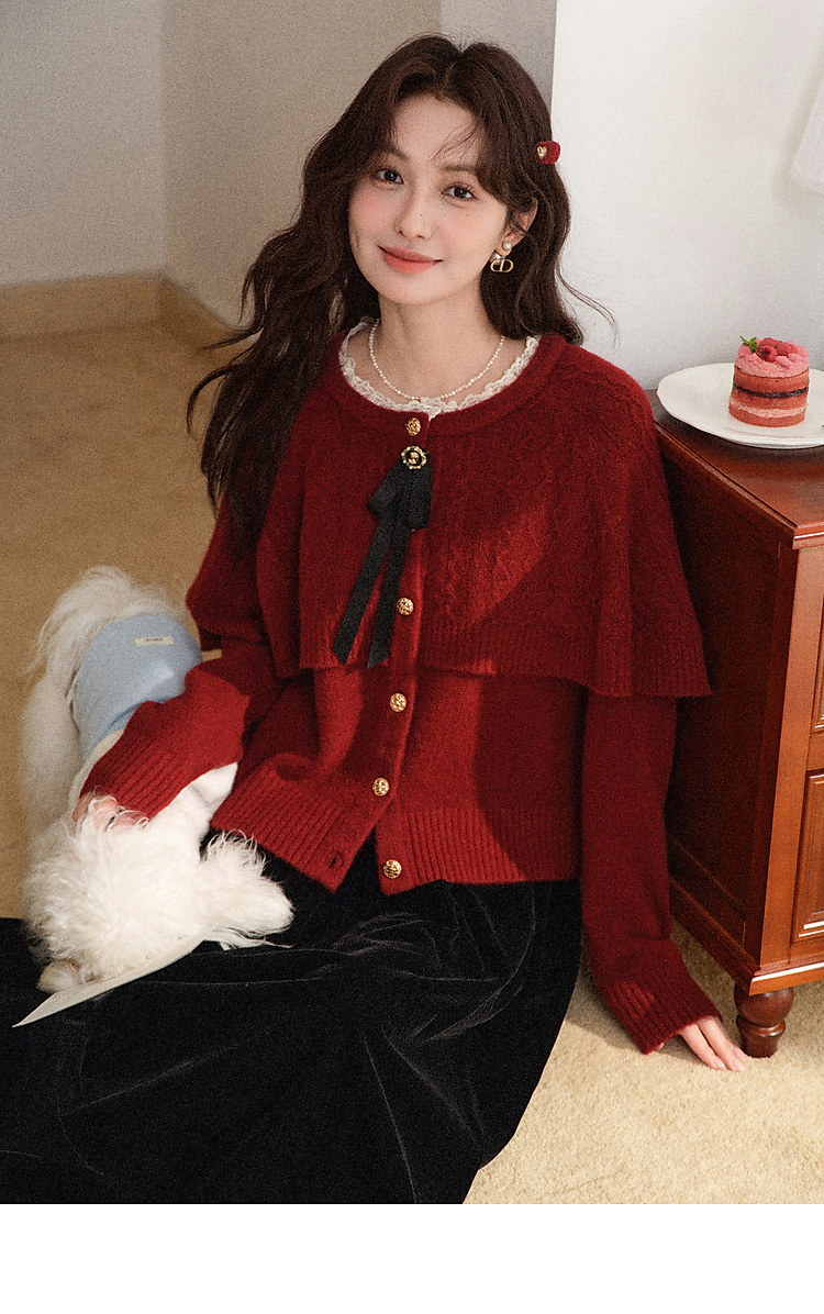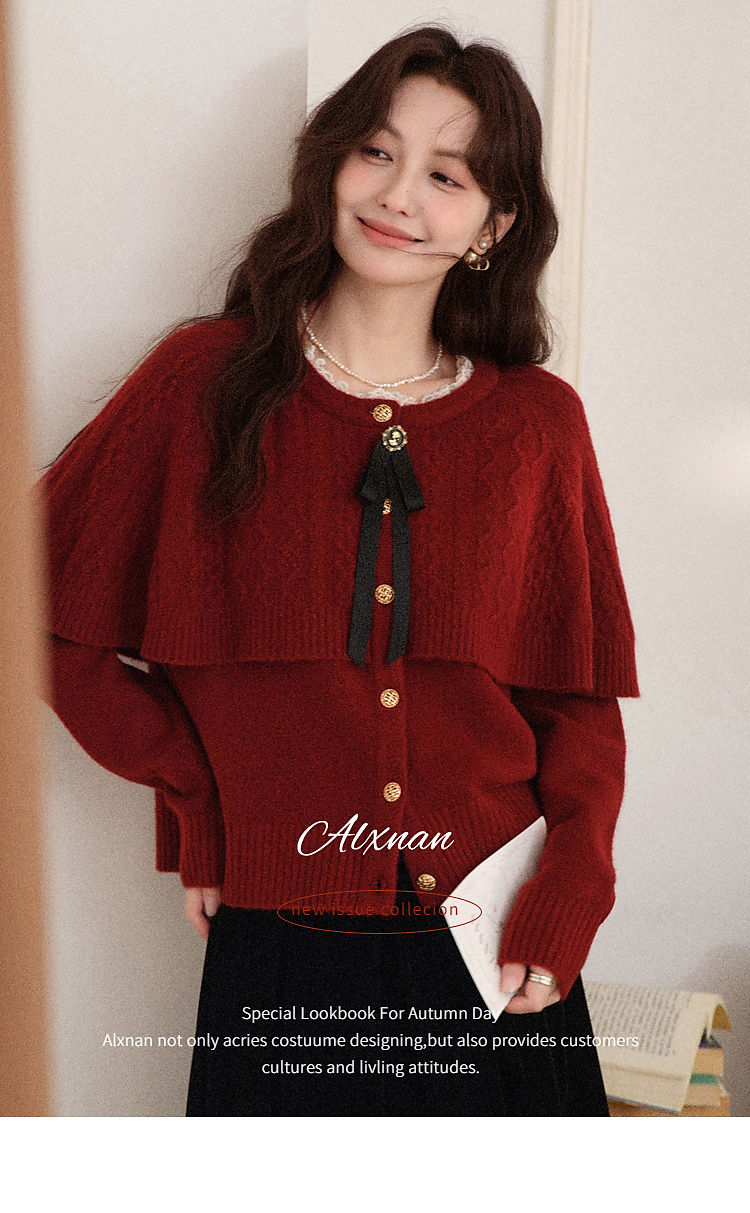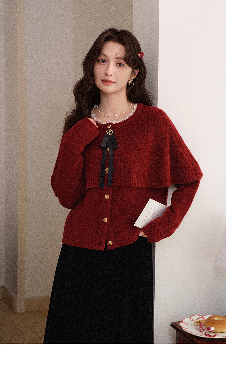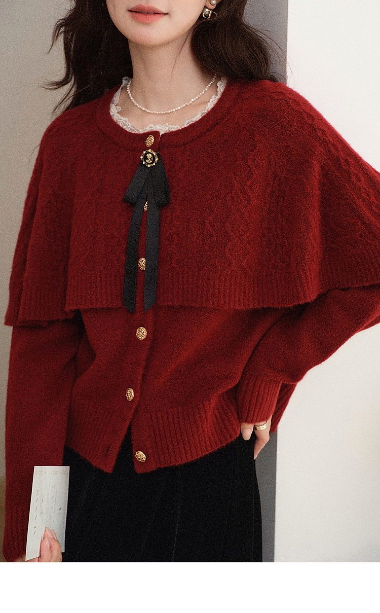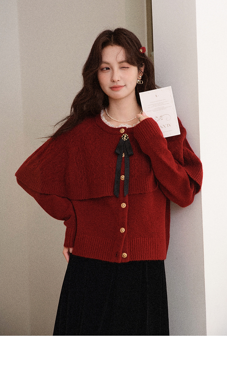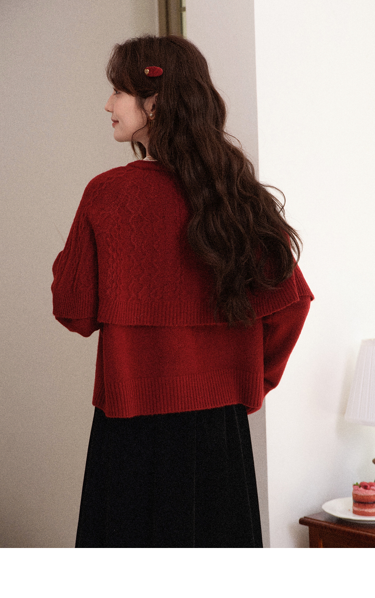 鹿向南「巴黎晨曦」设计感复古气质红色假两件斗篷针织毛衣女秋冬