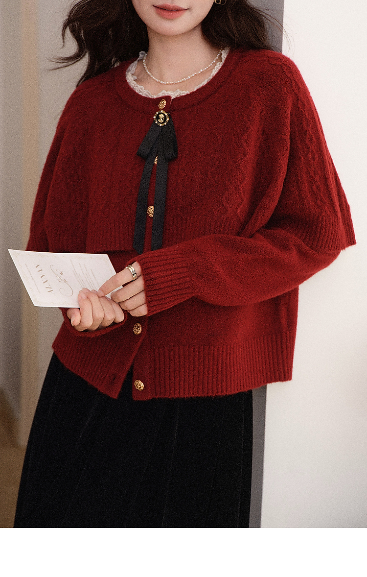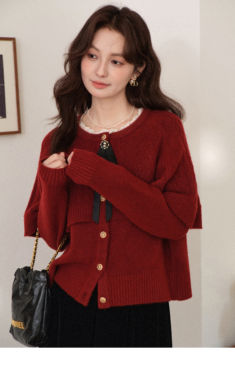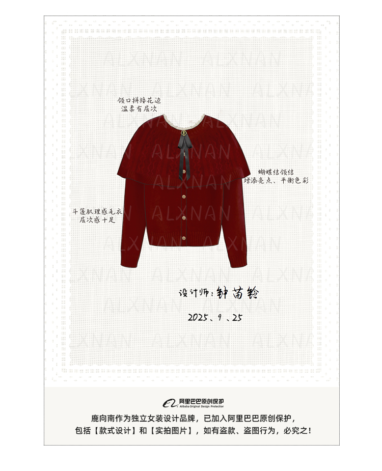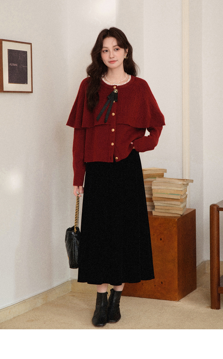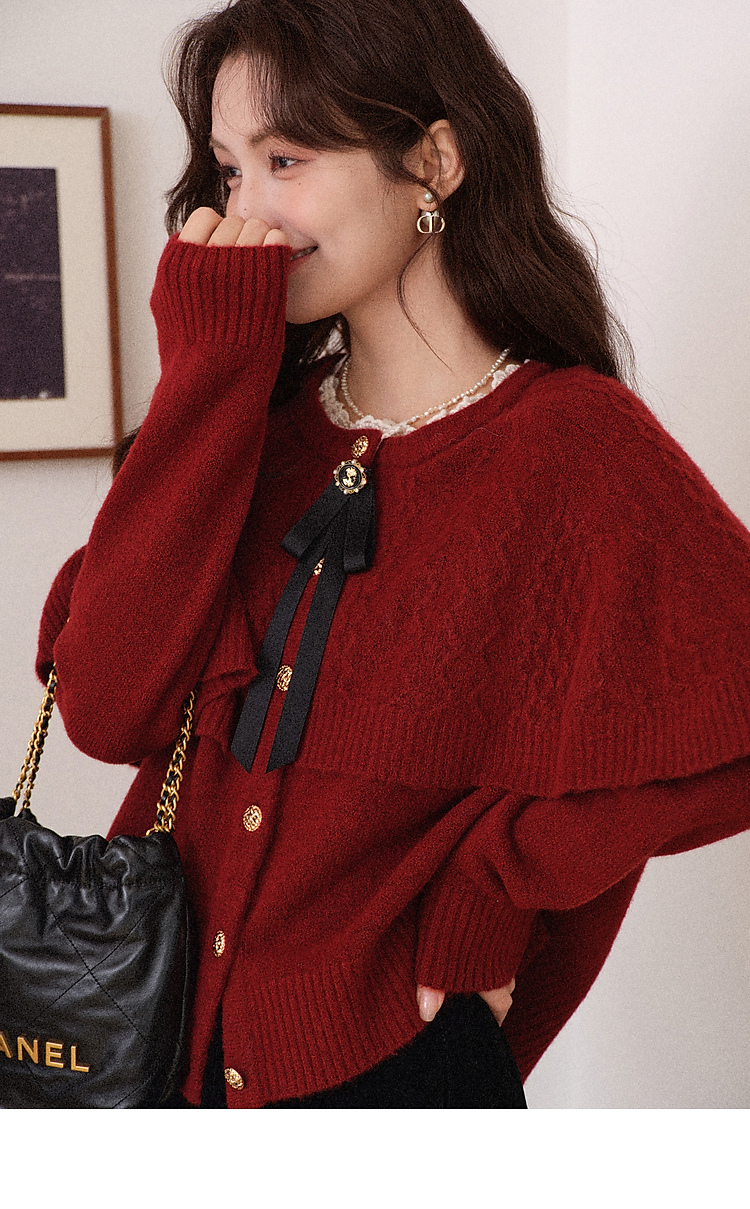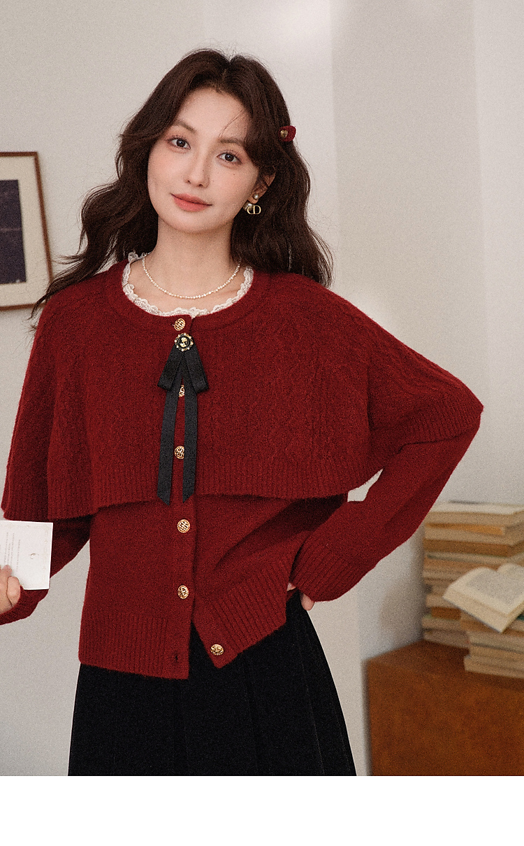 鹿向南「巴黎晨曦」设计感复古气质红色假两件斗篷针织毛衣女秋冬