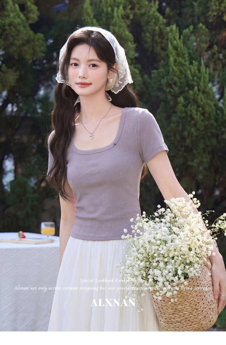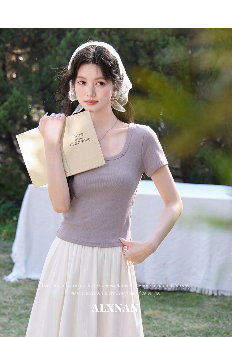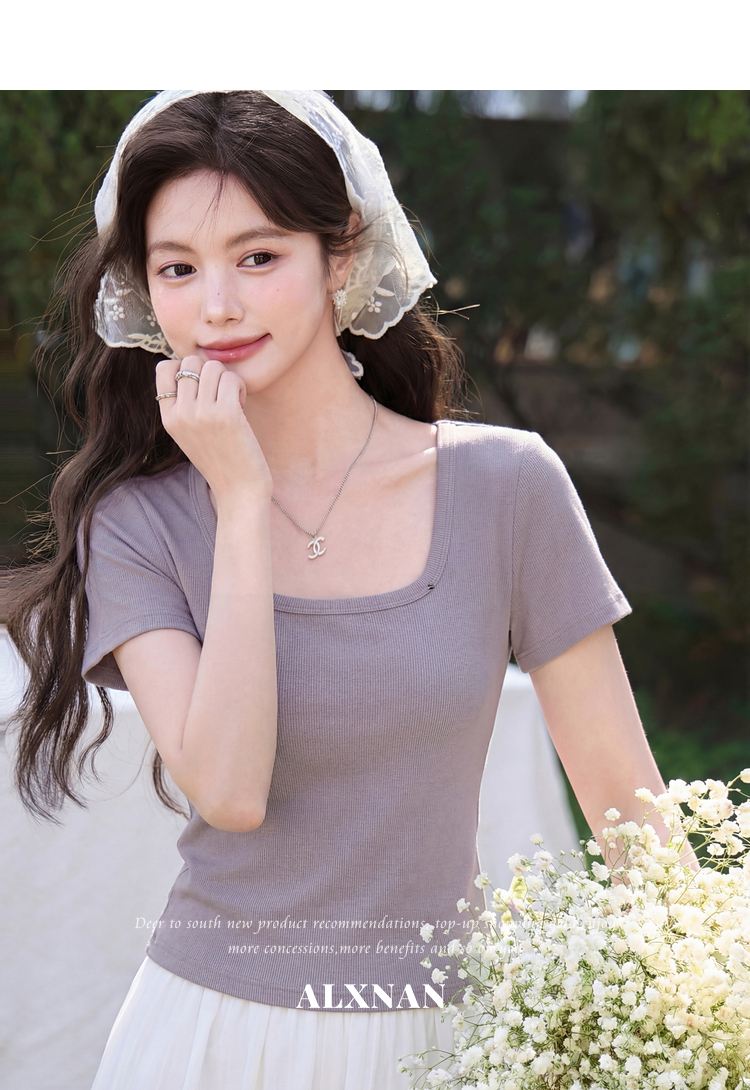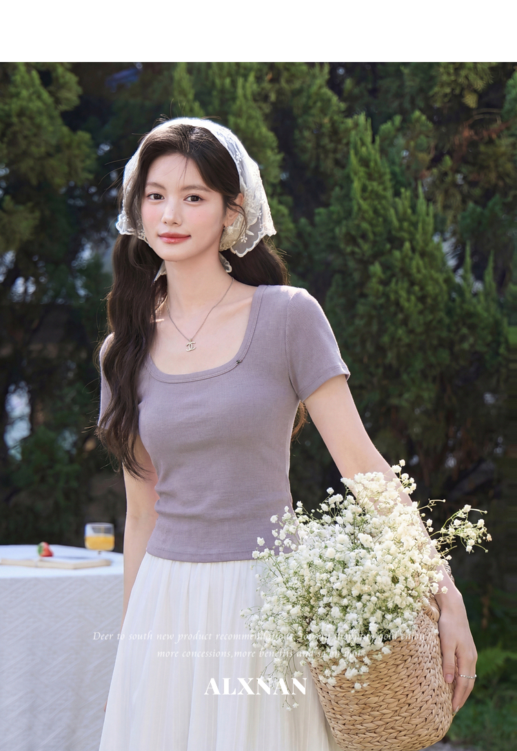 鹿向南「紫霞轻染」法式方领紫色短袖T恤女夏季新款修身显瘦上衣