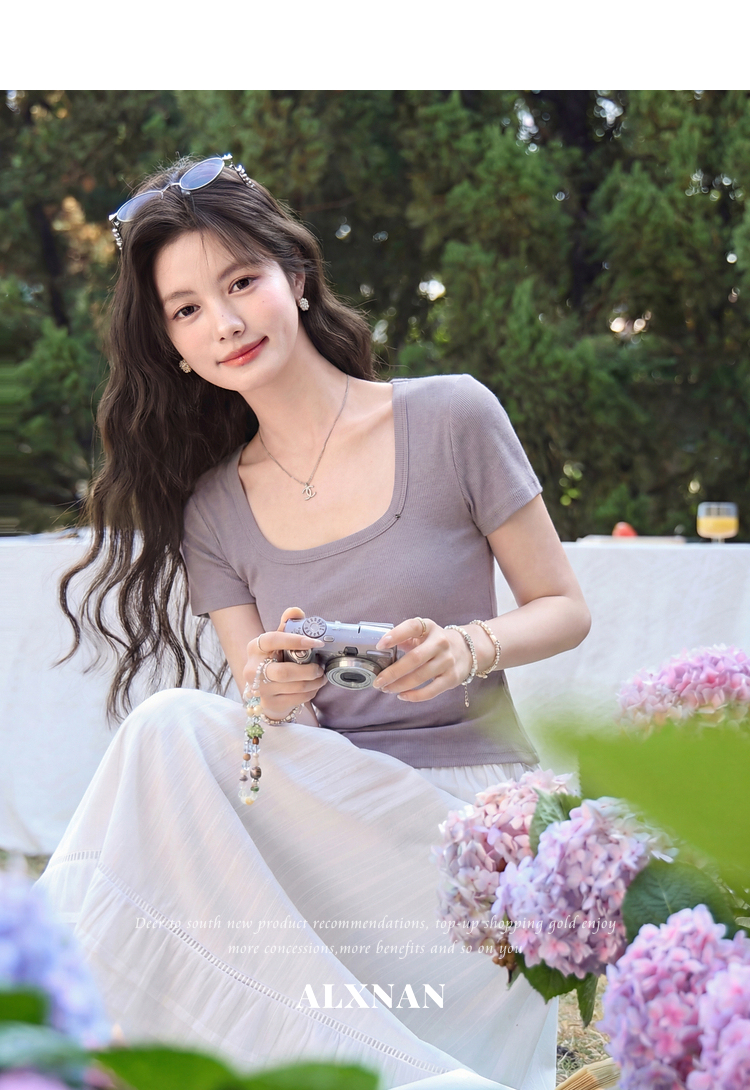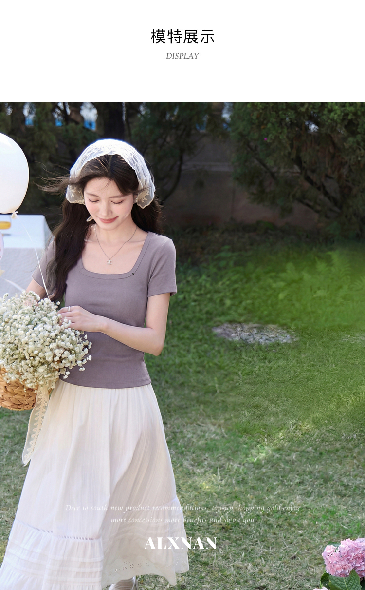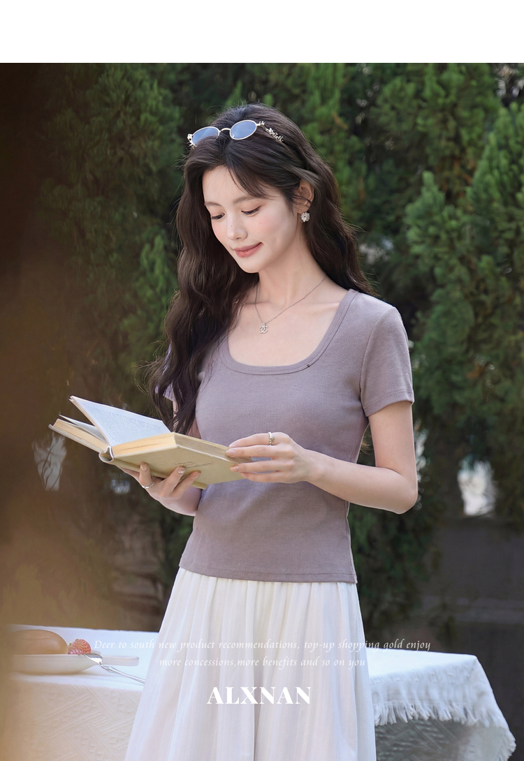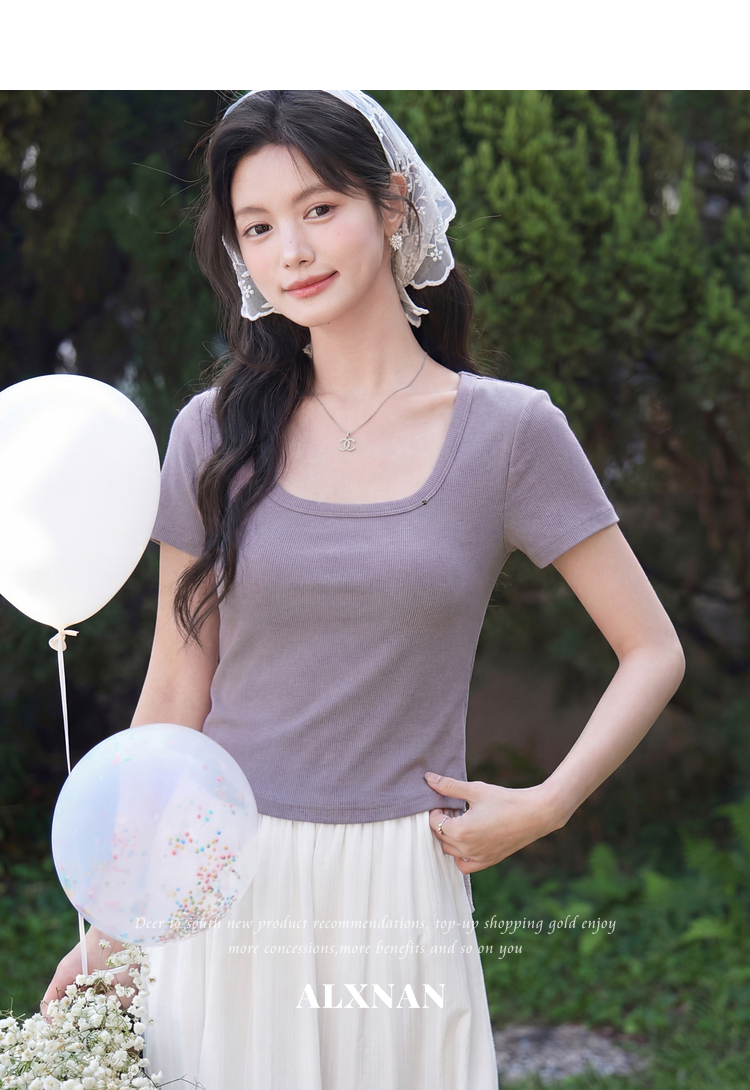 鹿向南「紫霞轻染」法式方领紫色短袖T恤女夏季新款修身显瘦上衣