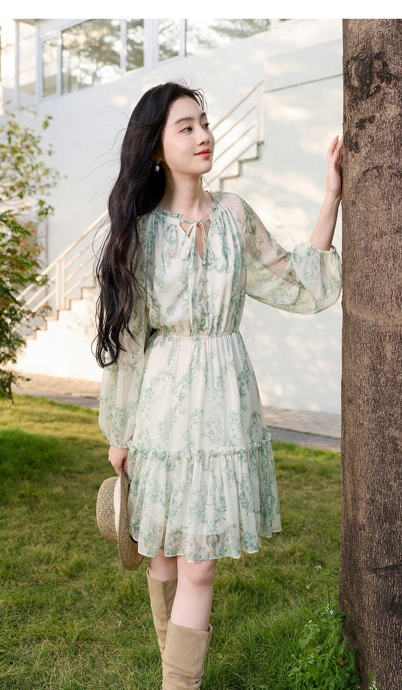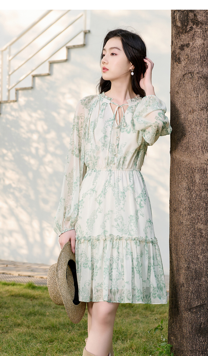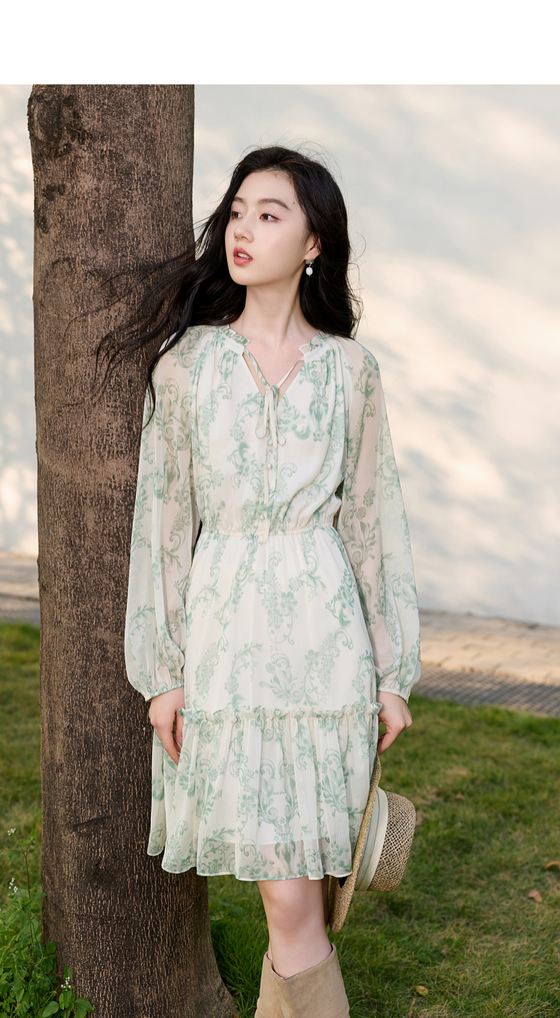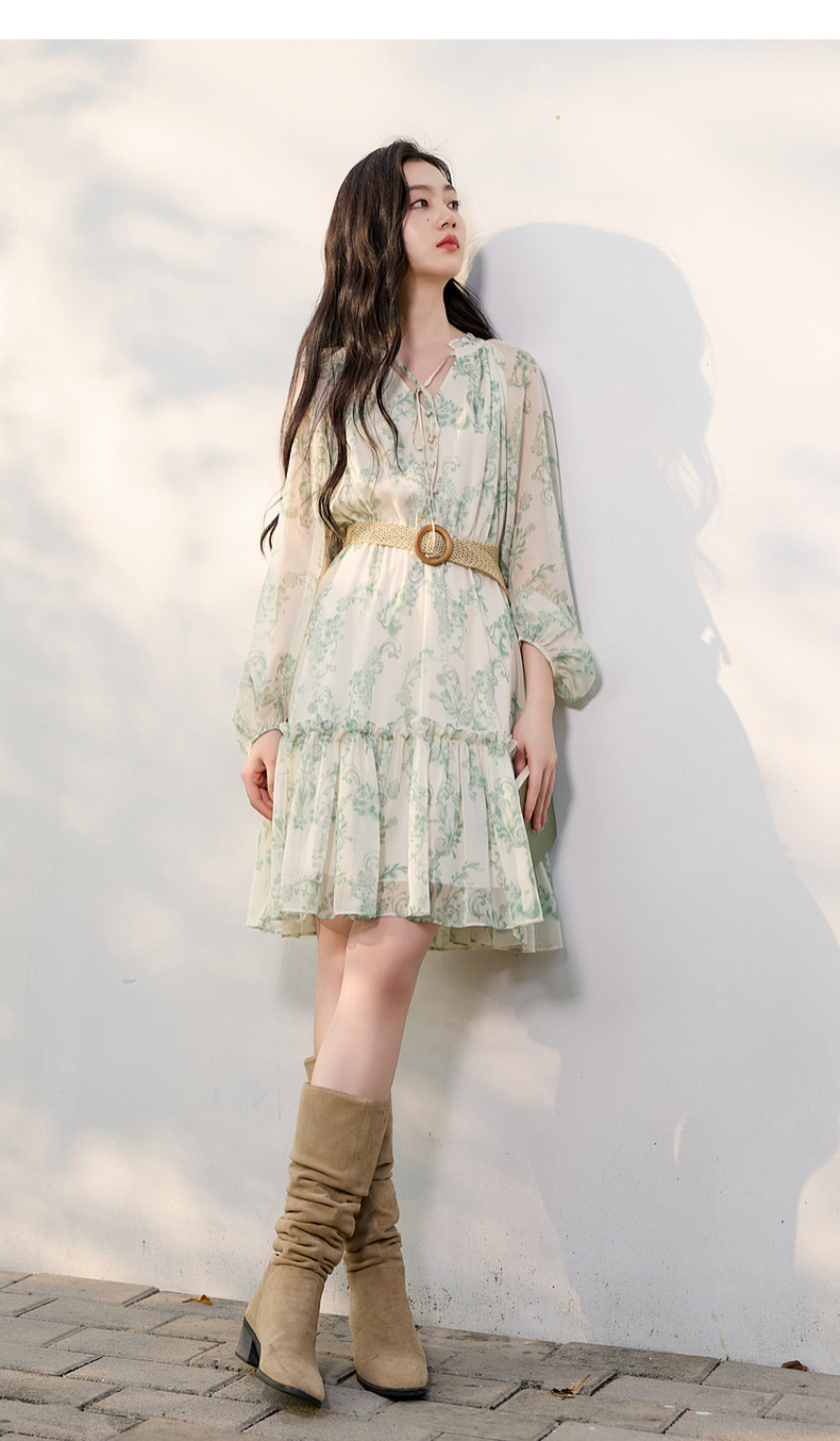 三彩2026春季新款系带V领碎花雪纺裙法式连衣裙A字裙大摆裙S