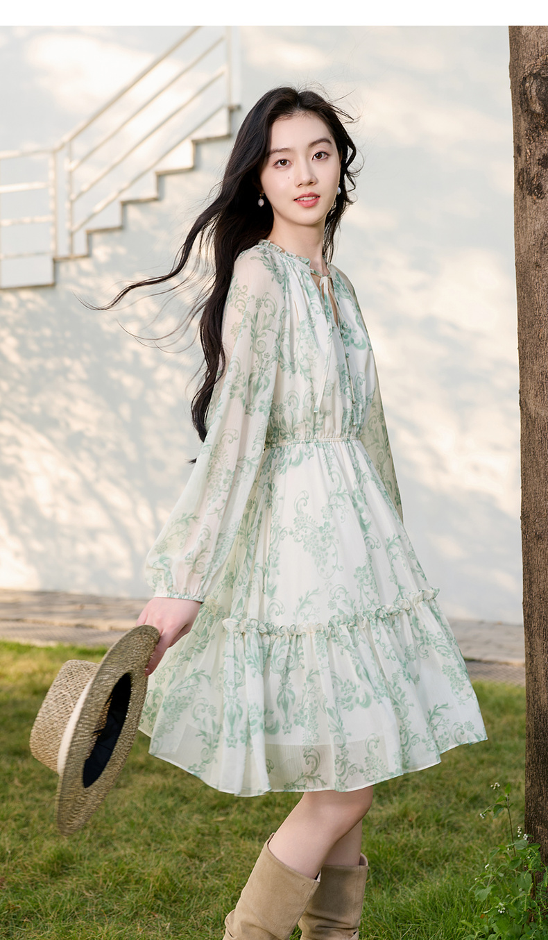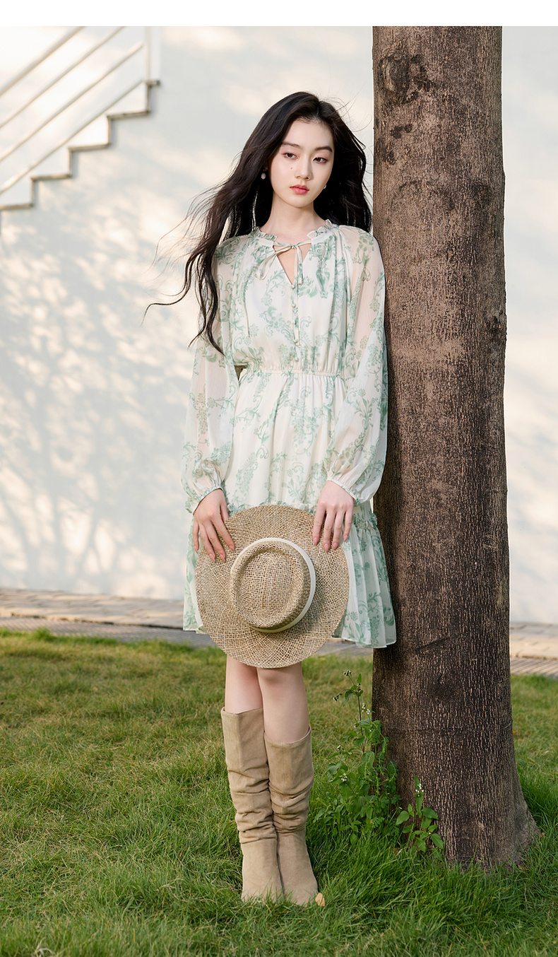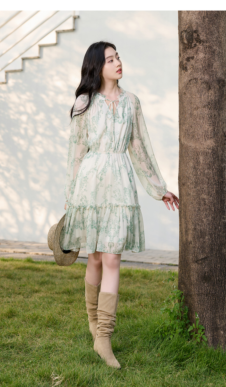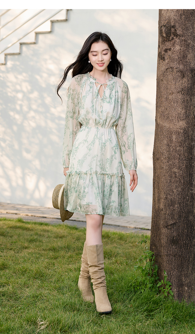 三彩2026春季新款系带V领碎花雪纺裙法式连衣裙A字裙大摆裙S