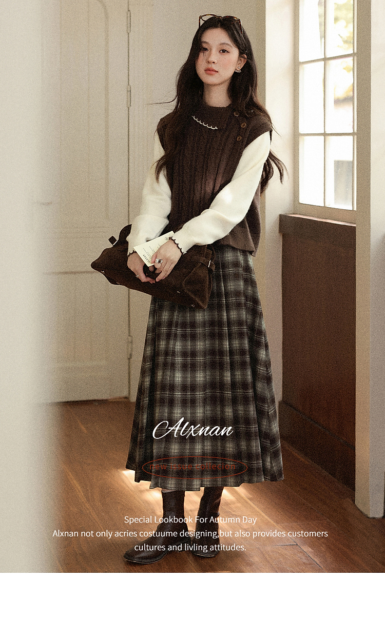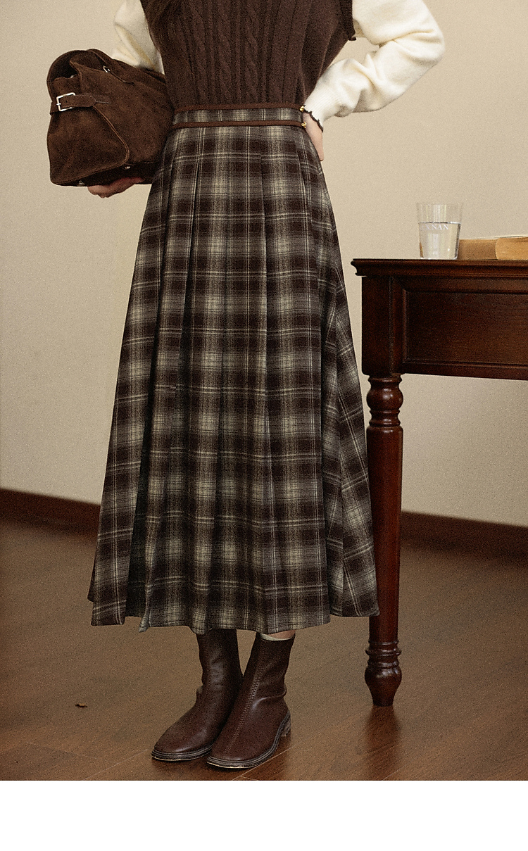 鹿向南「薄暮之时」气质咖色格子半身裙女秋高腰宽松显瘦A字裙子