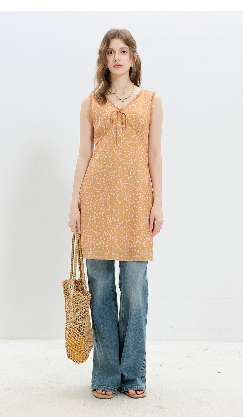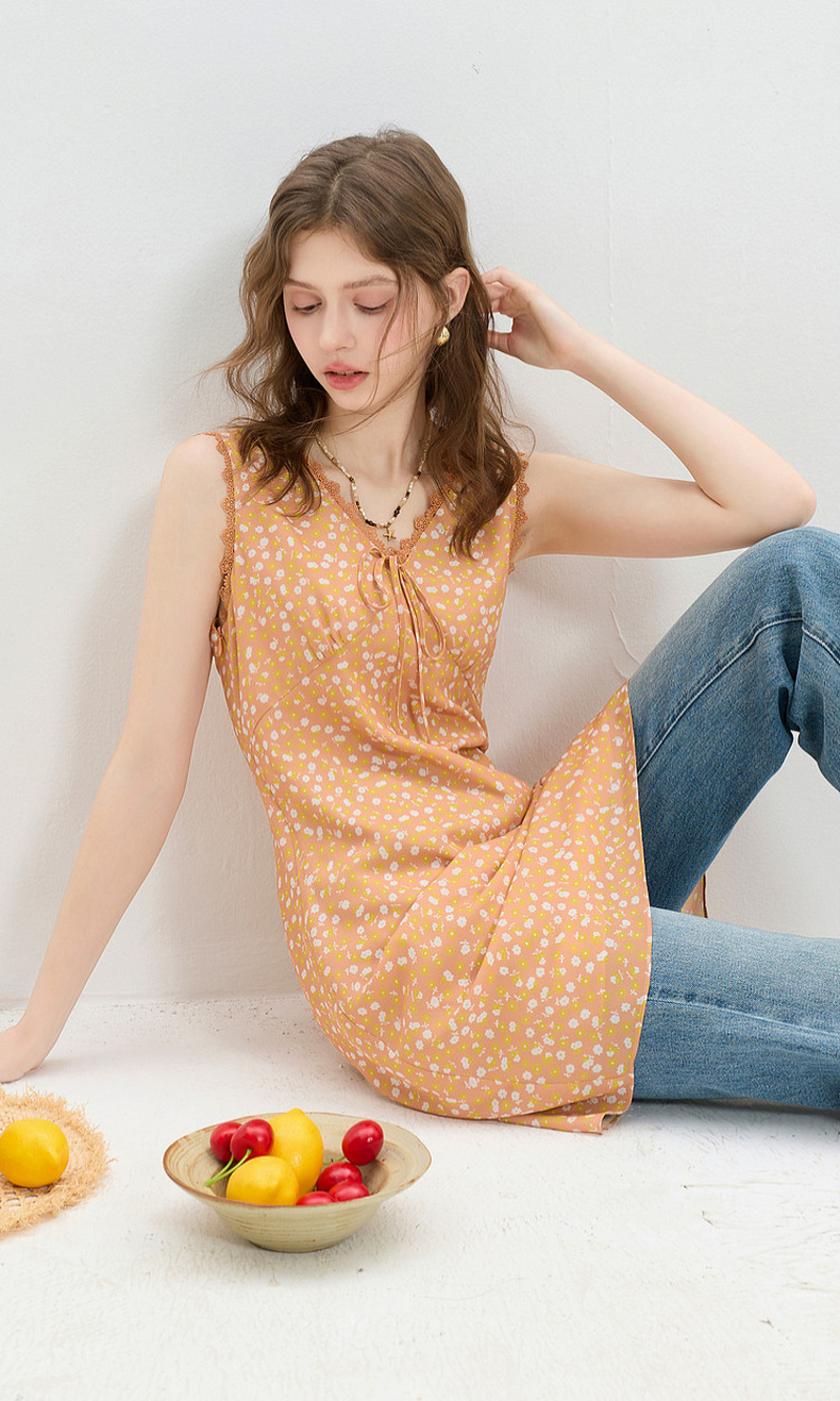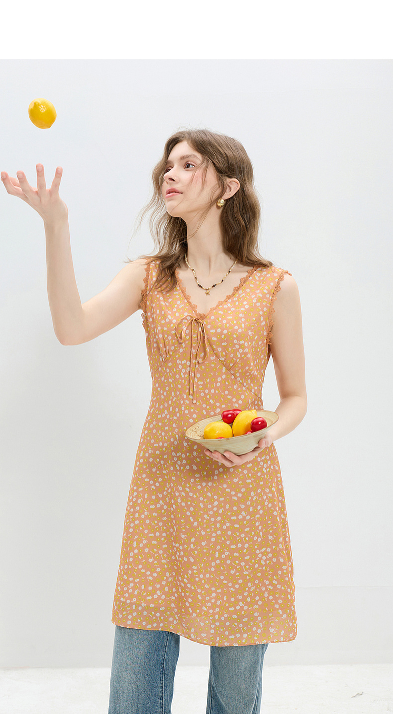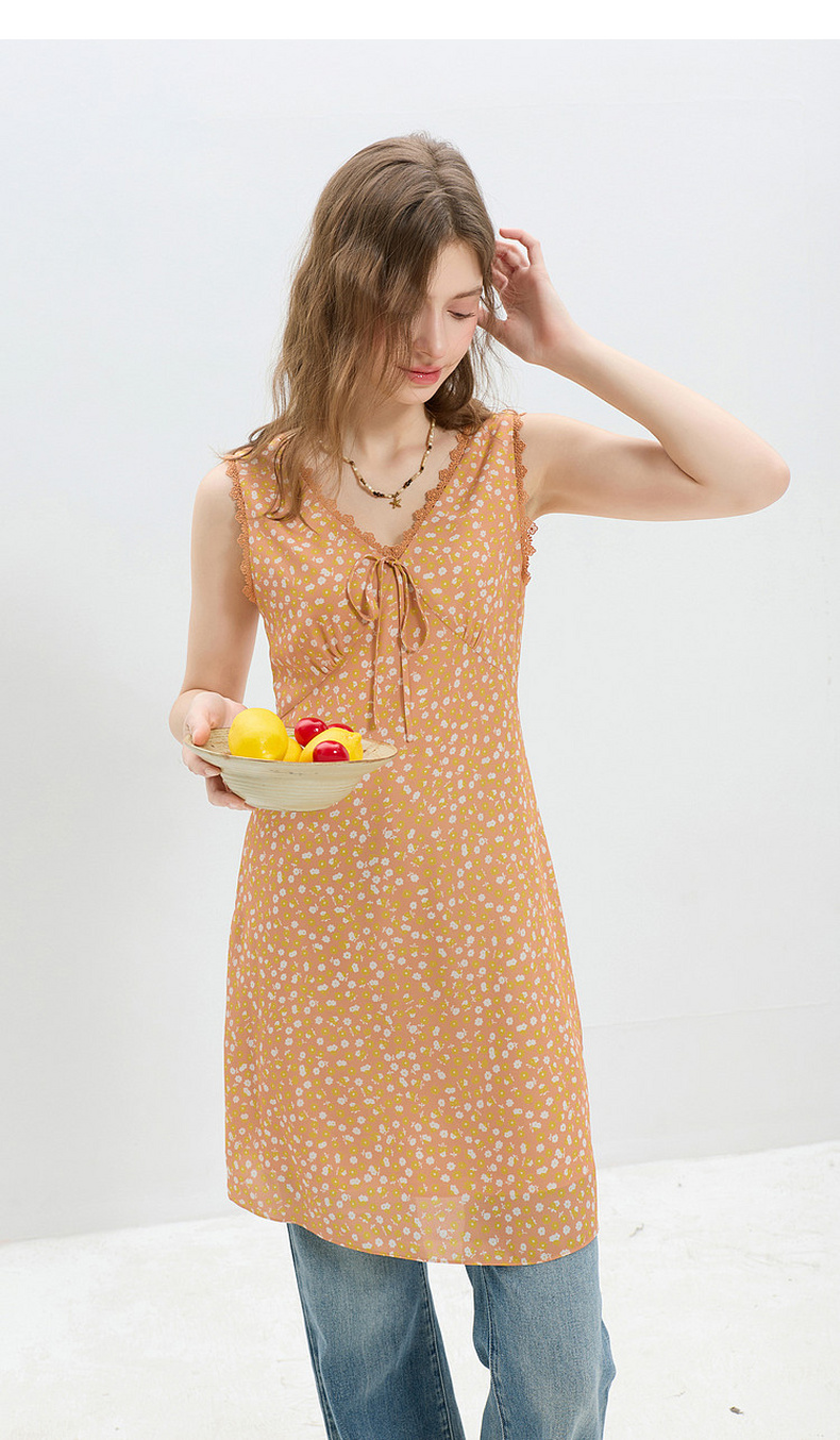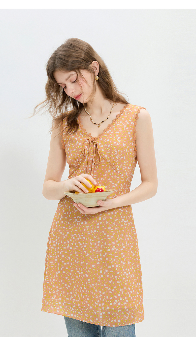 三彩2026夏季新款碎花连衣裙无袖A字裙v领叠穿短裙M