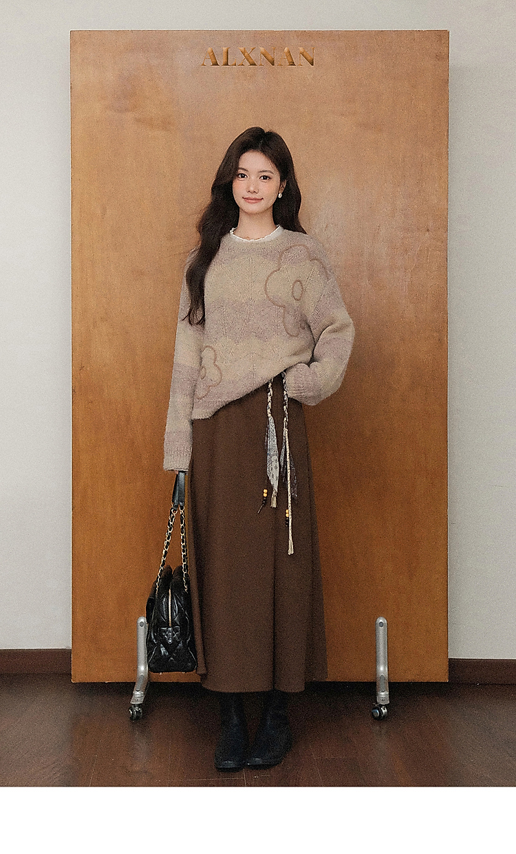 鹿向南「柔雾皖梦」宽松慵懒风花咖圆领毛衣女2025秋冬季长袖上衣