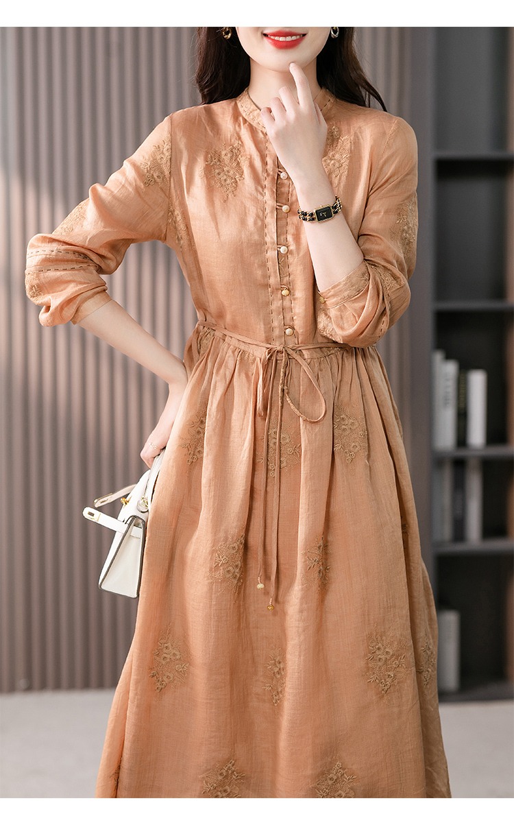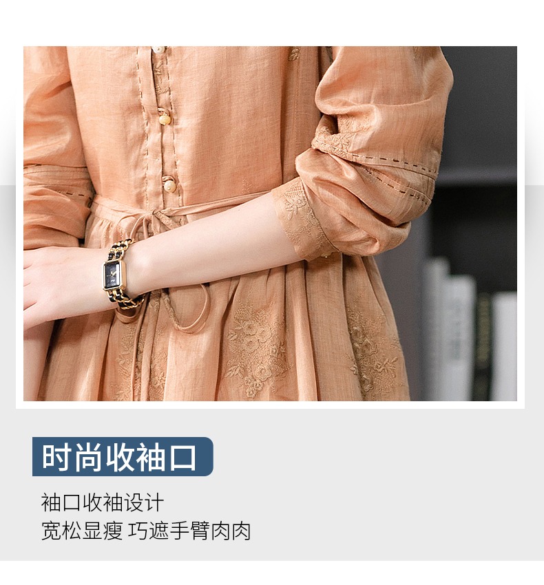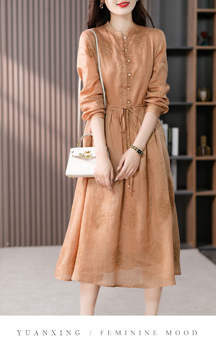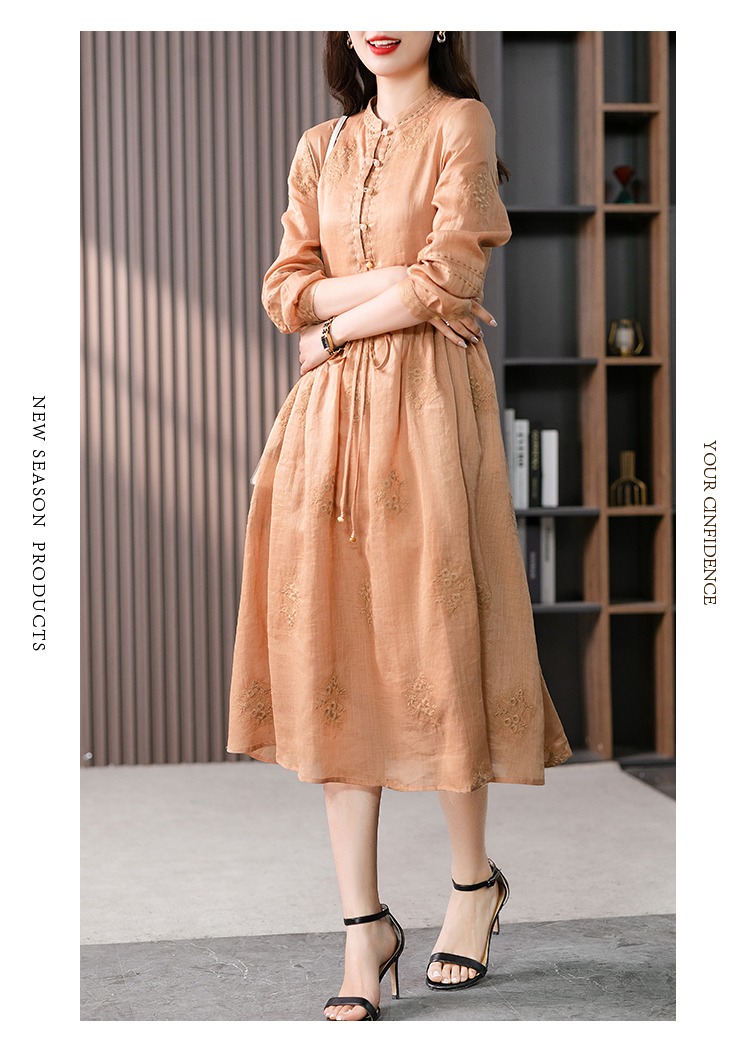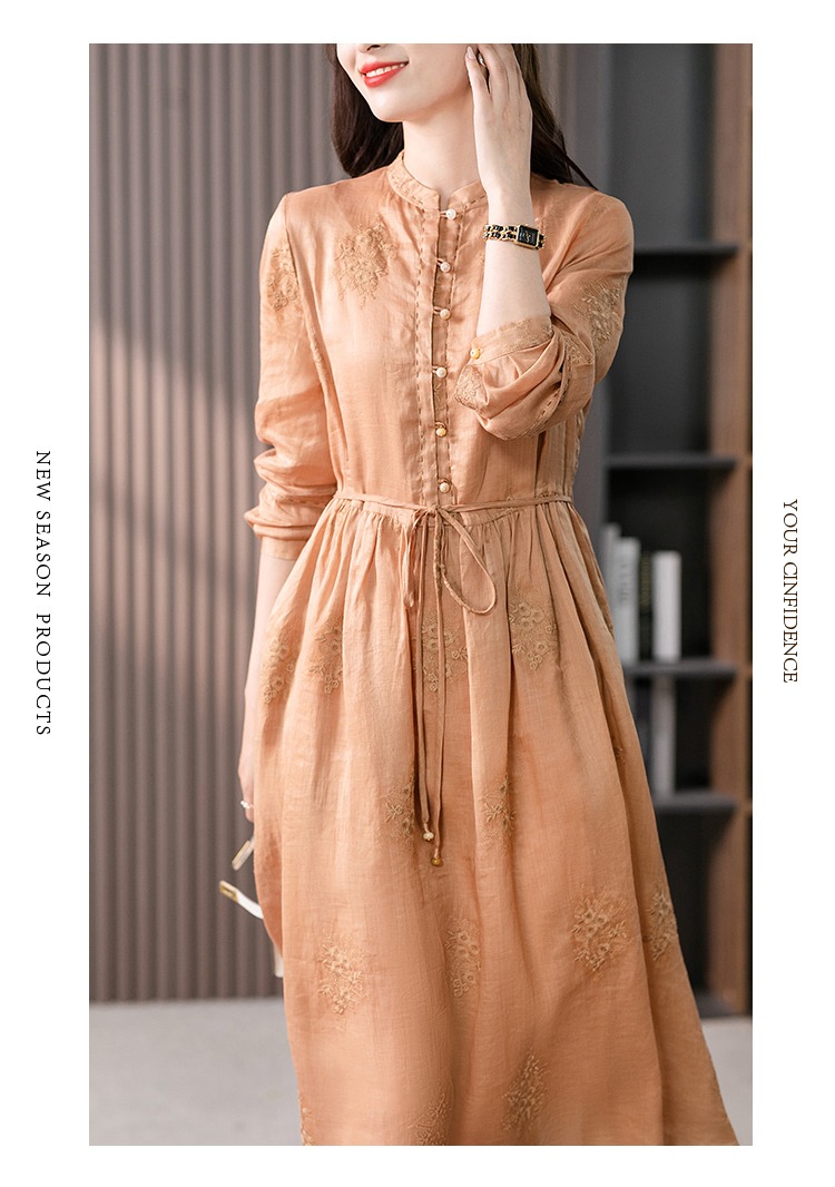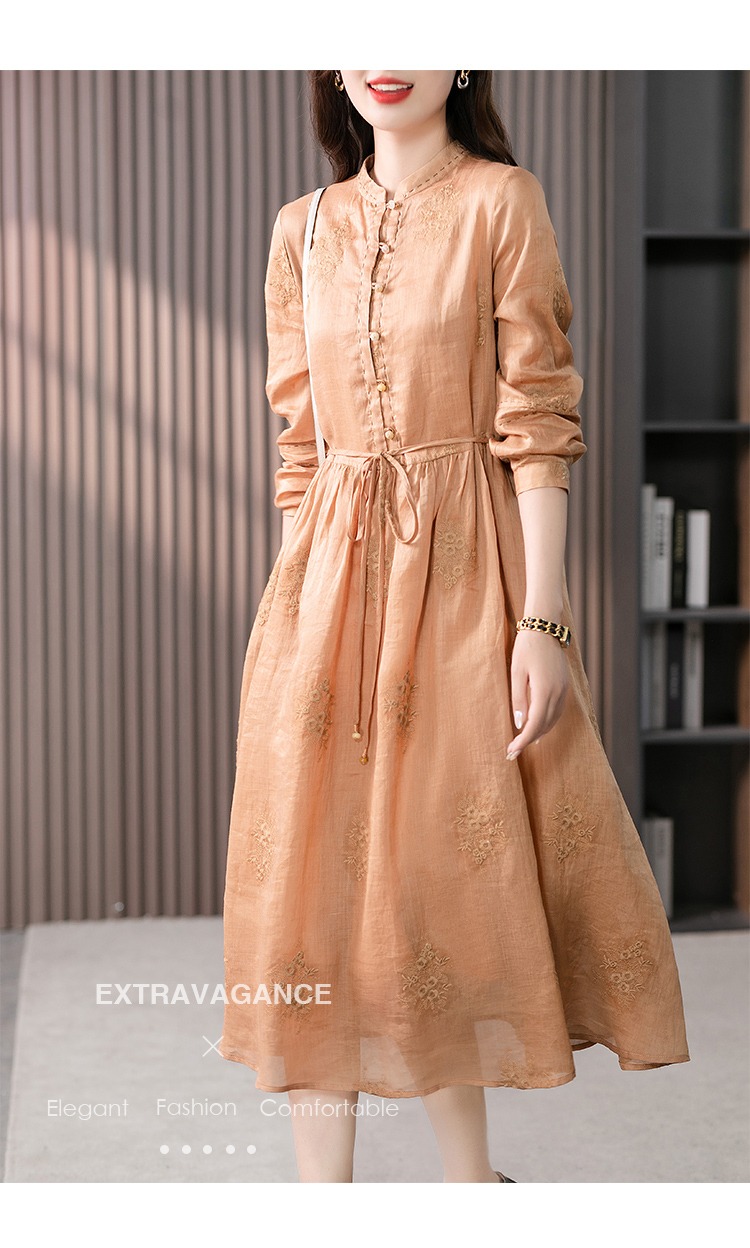 YX【现货7天】设计感新中式苎麻连衣裙女2024夏季新款时尚绣花显瘦长裙子