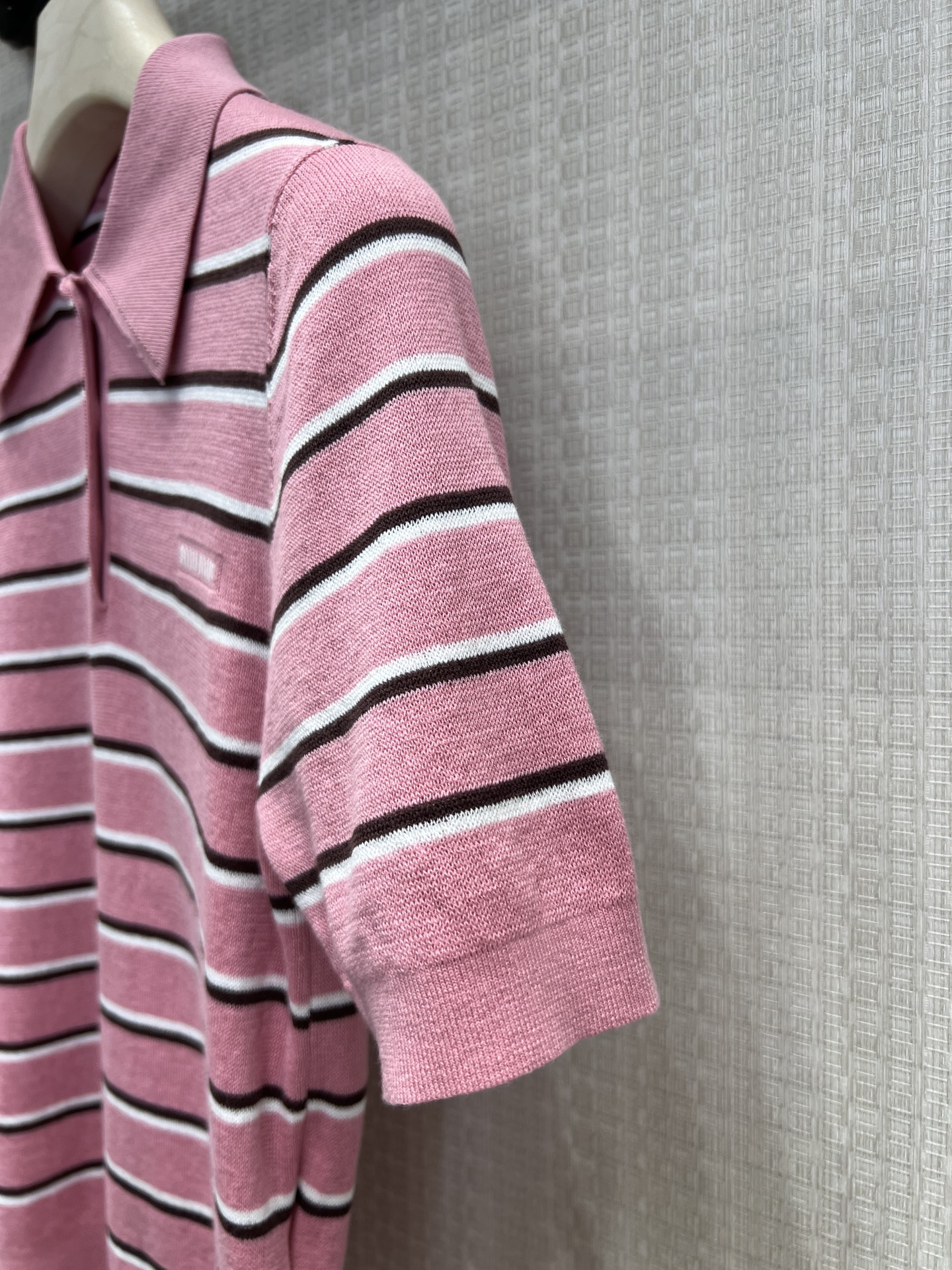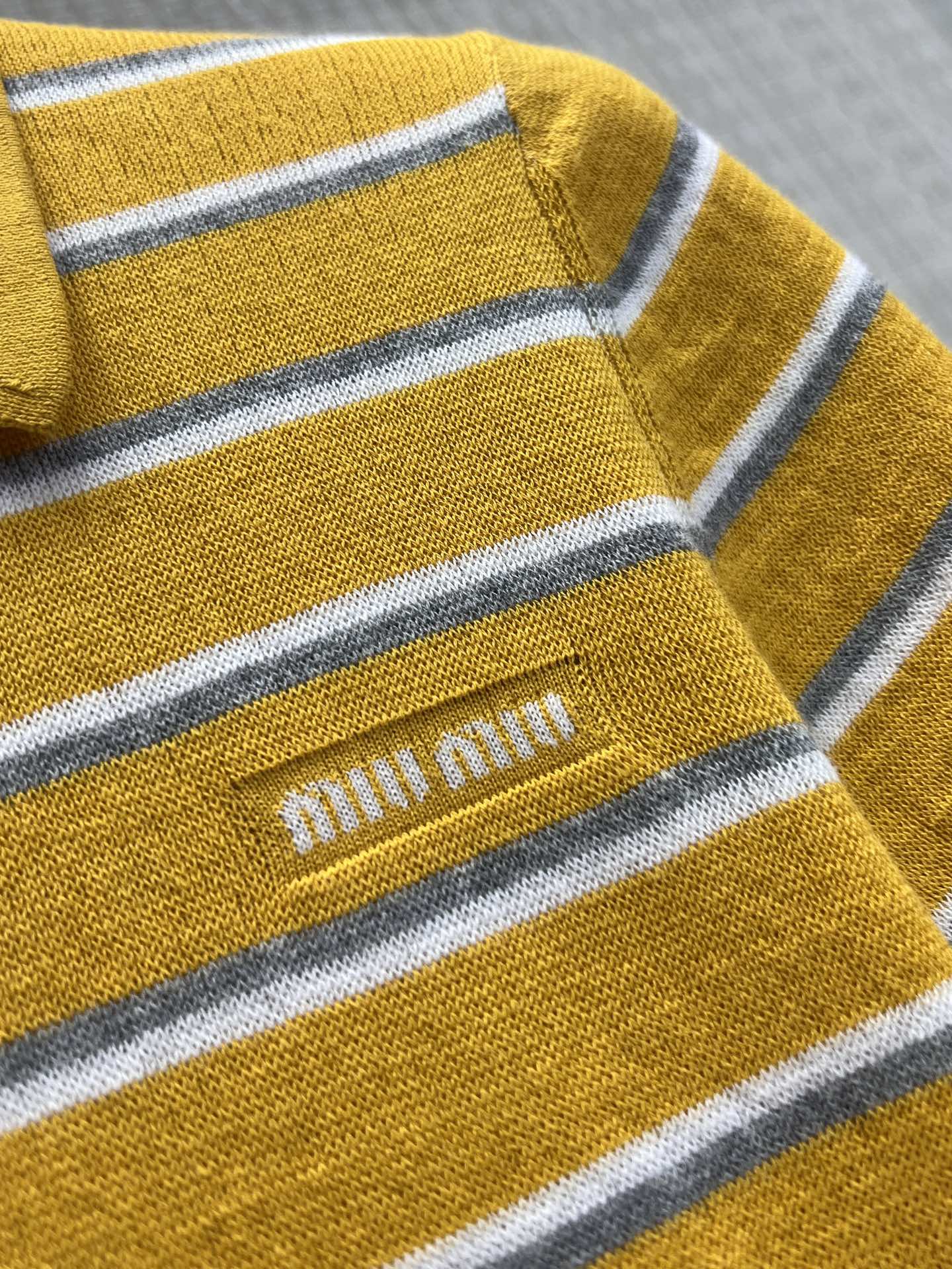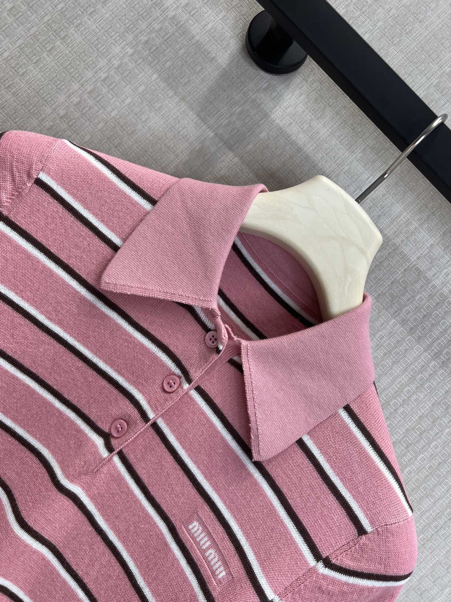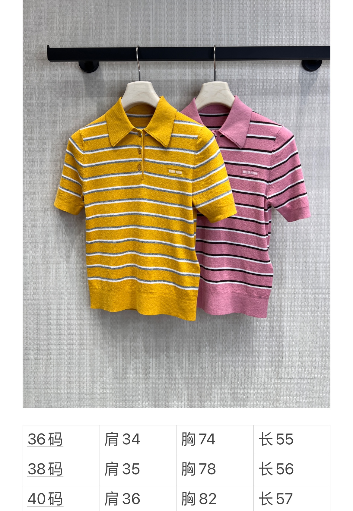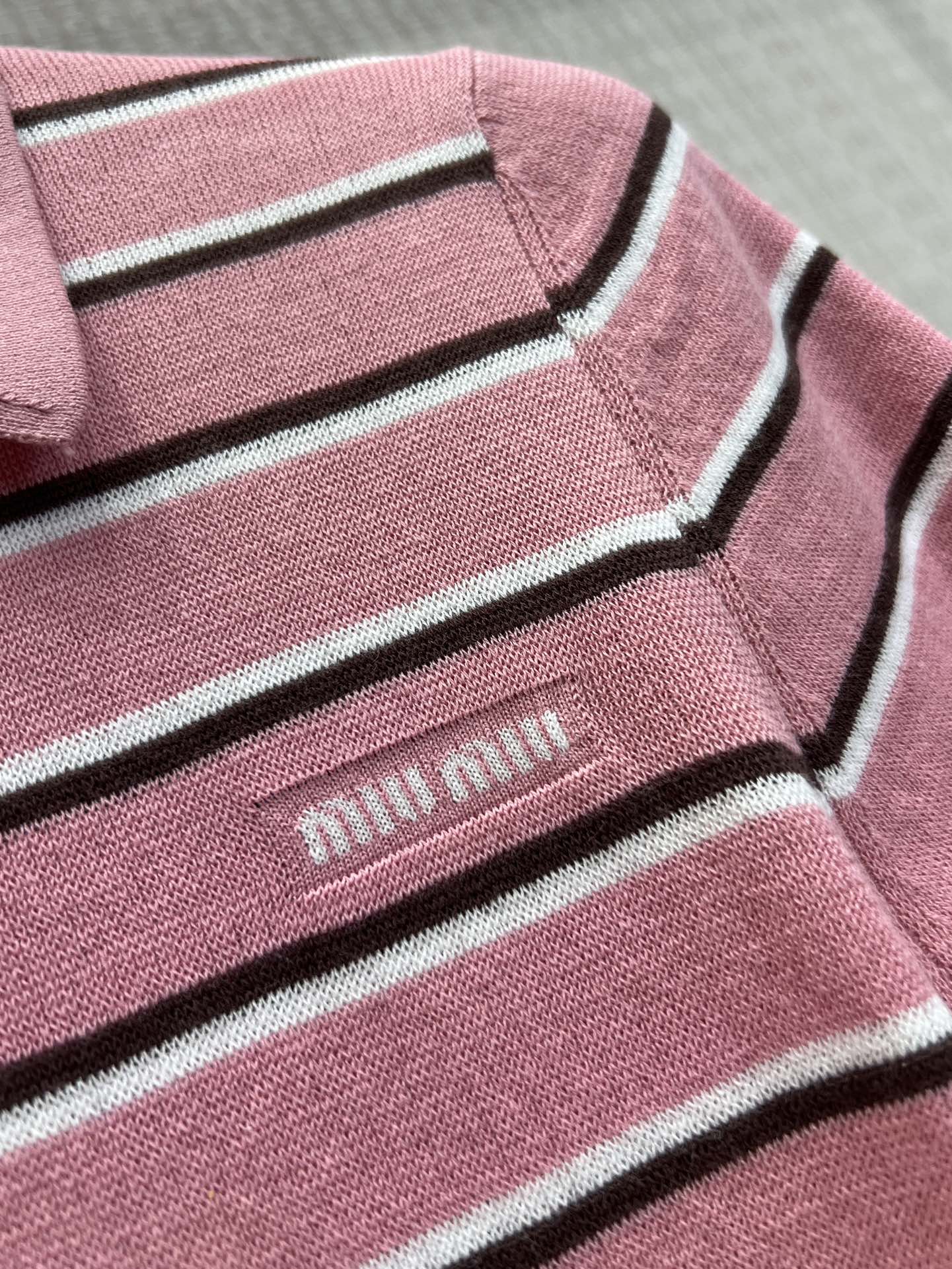 Miu* 26Ss春夏新款 撞色条纹棉质Polo短袖针织衫丨⚠独家yb开发!顶级高版出品!面料选用透气棉质针织材质,软糯亲肤,垂坠感十足,经典Polo翻领+半开扣设计,巧妙修饰脖颈线条,拉长比例,利落又显精神;衣身采用撞色条纹设计,清新配色自带春日滤镜,视觉上显瘦又减龄,对各种身材都友好。微收腰的修身版型,贴合身形却不紧绷,凸显腰线,轻松打造三七分比例。现货发售S/M/L