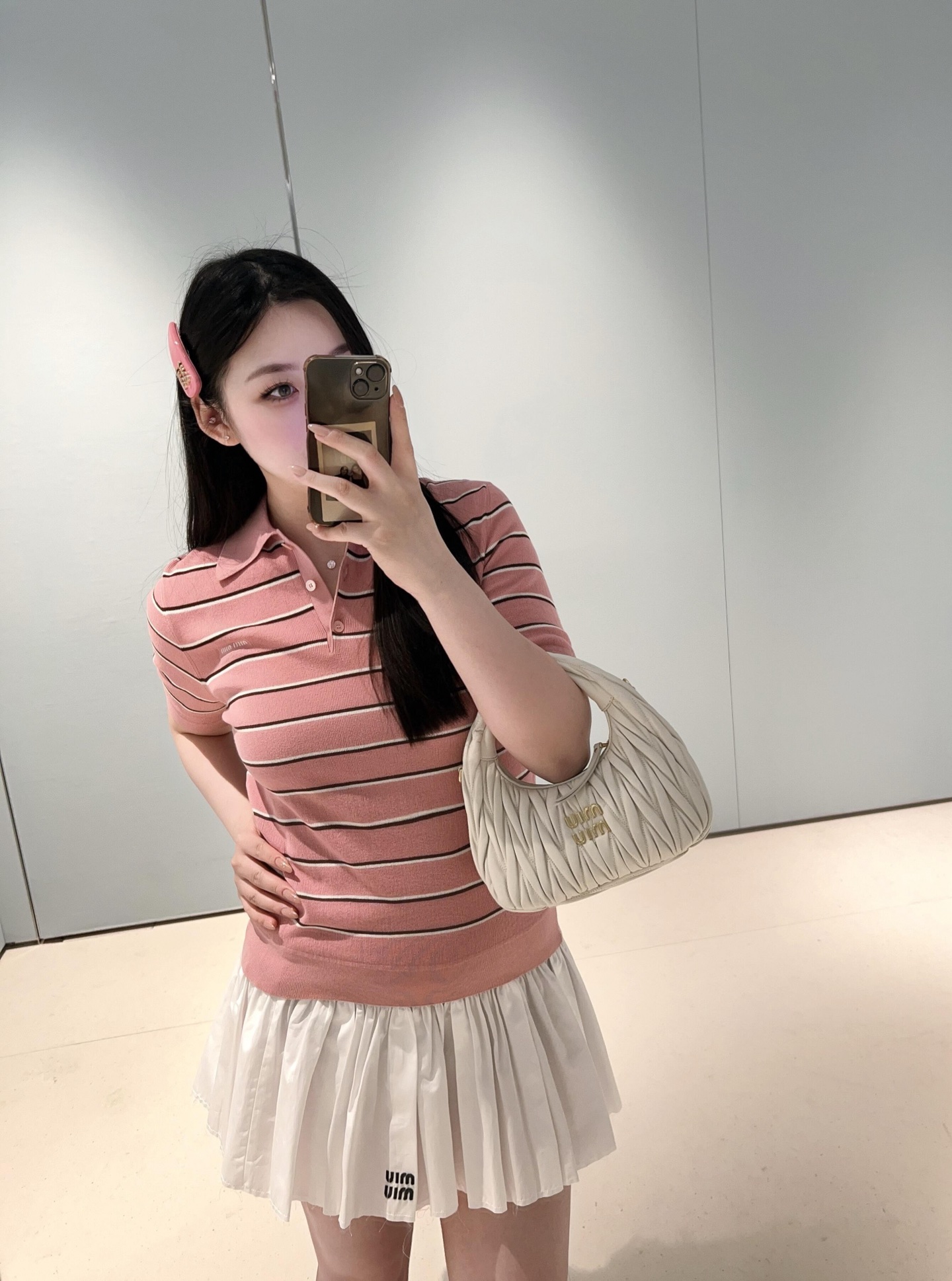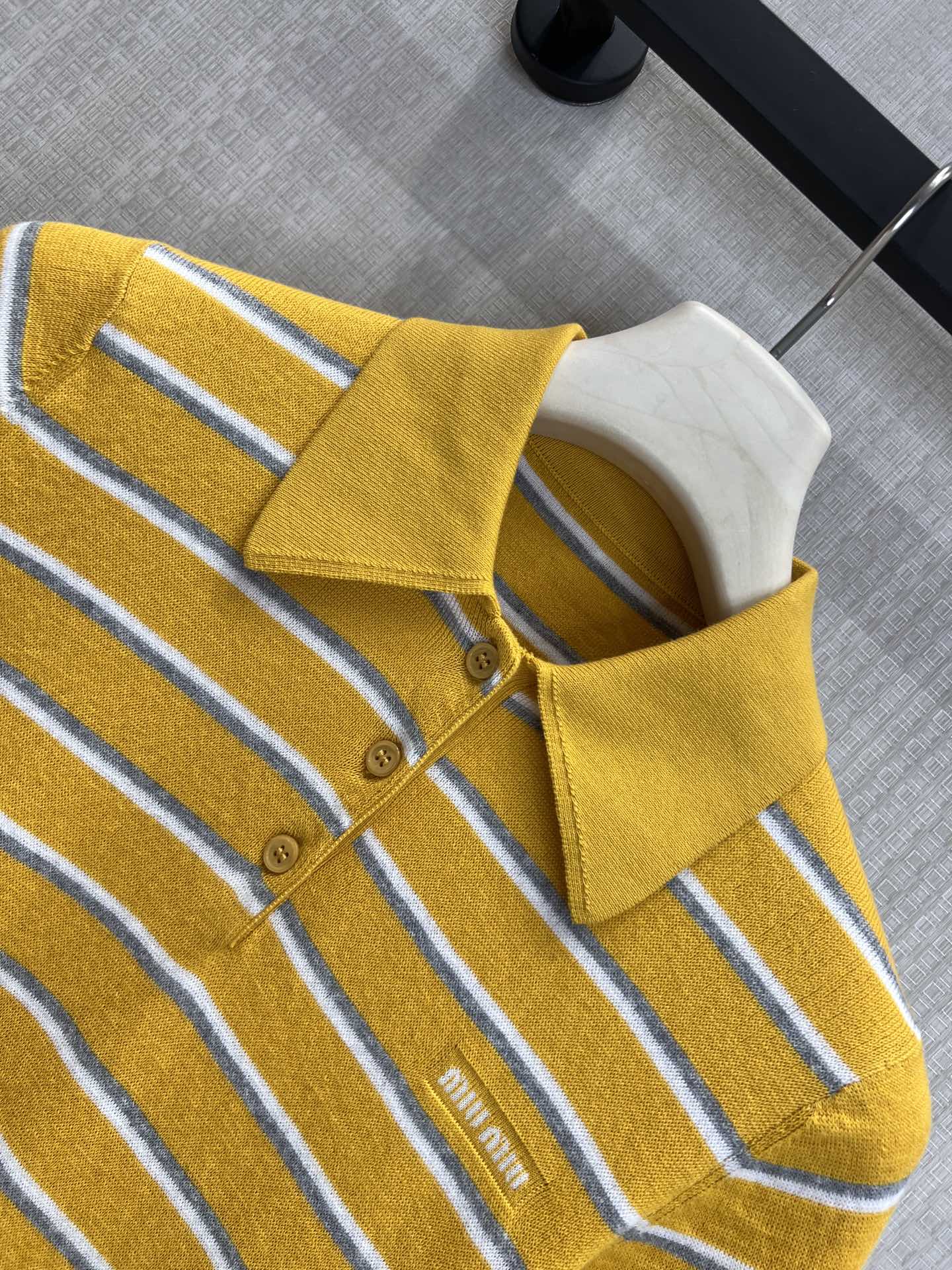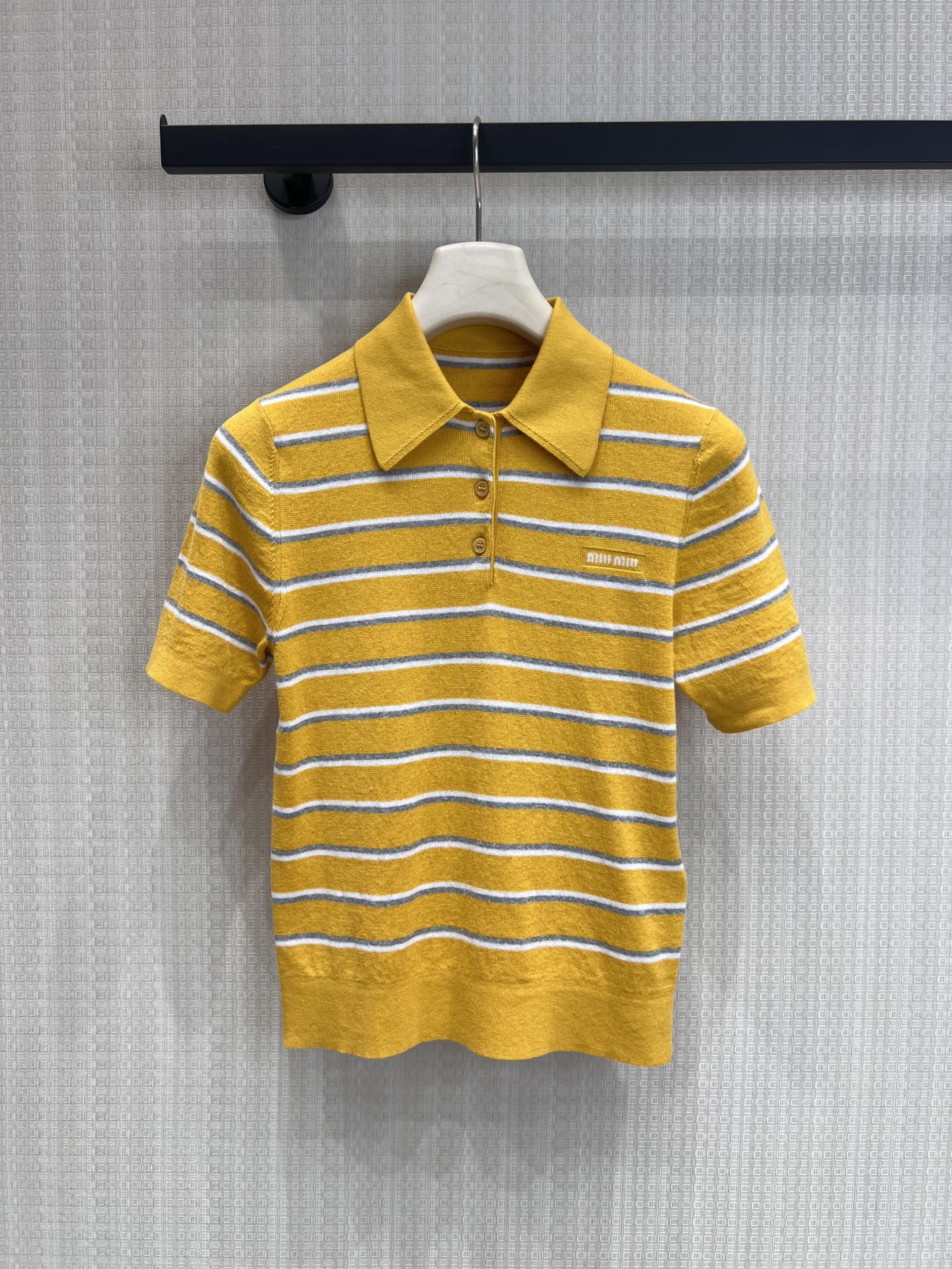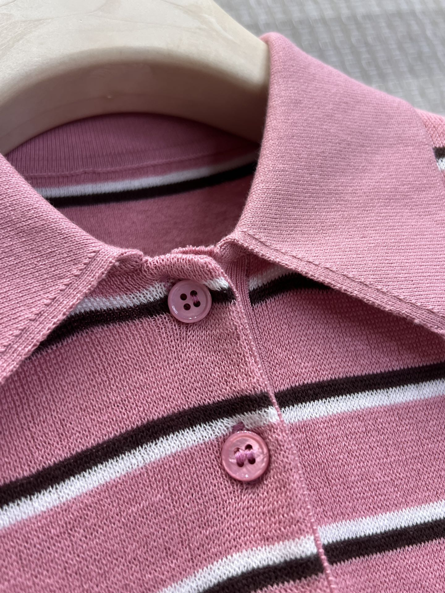 Miu* 26Ss春夏新款 撞色条纹棉质Polo短袖针织衫丨⚠独家yb开发!顶级高版出品!面料选用透气棉质针织材质,软糯亲肤,垂坠感十足,经典Polo翻领+半开扣设计,巧妙修饰脖颈线条,拉长比例,利落又显精神;衣身采用撞色条纹设计,清新配色自带春日滤镜,视觉上显瘦又减龄,对各种身材都友好。微收腰的修身版型,贴合身形却不紧绷,凸显腰线,轻松打造三七分比例。现货发售S/M/L