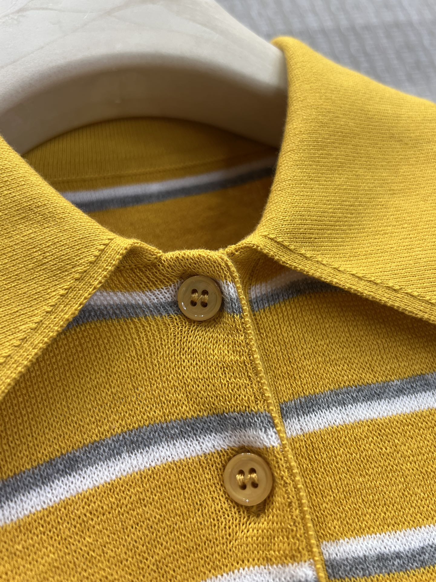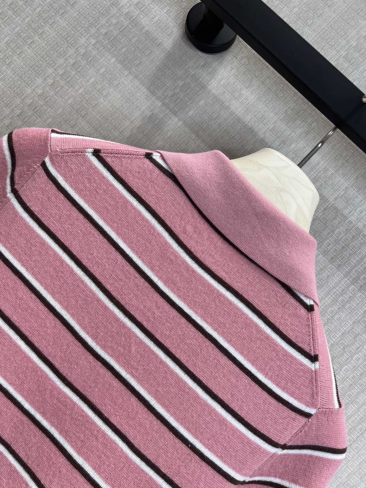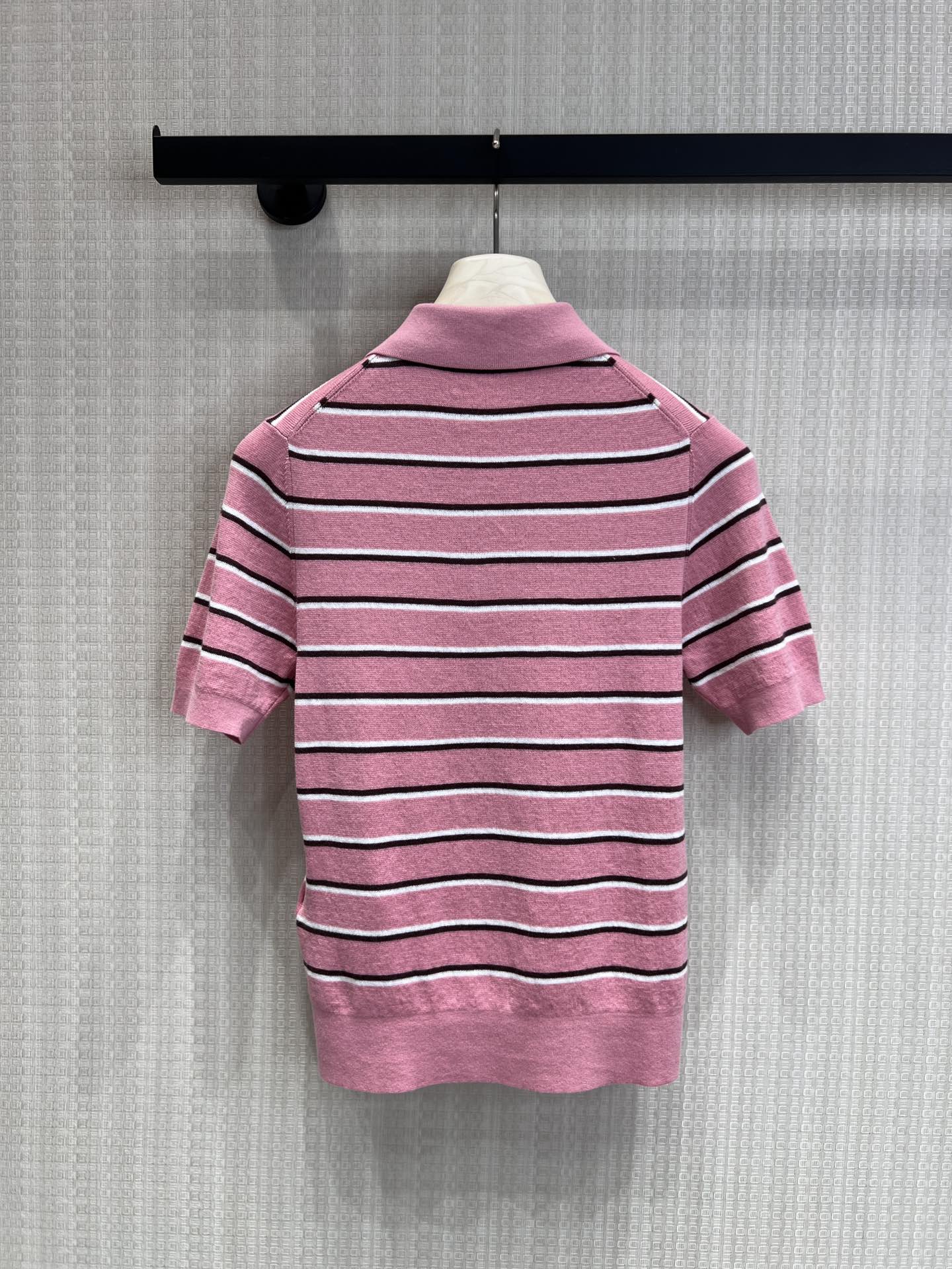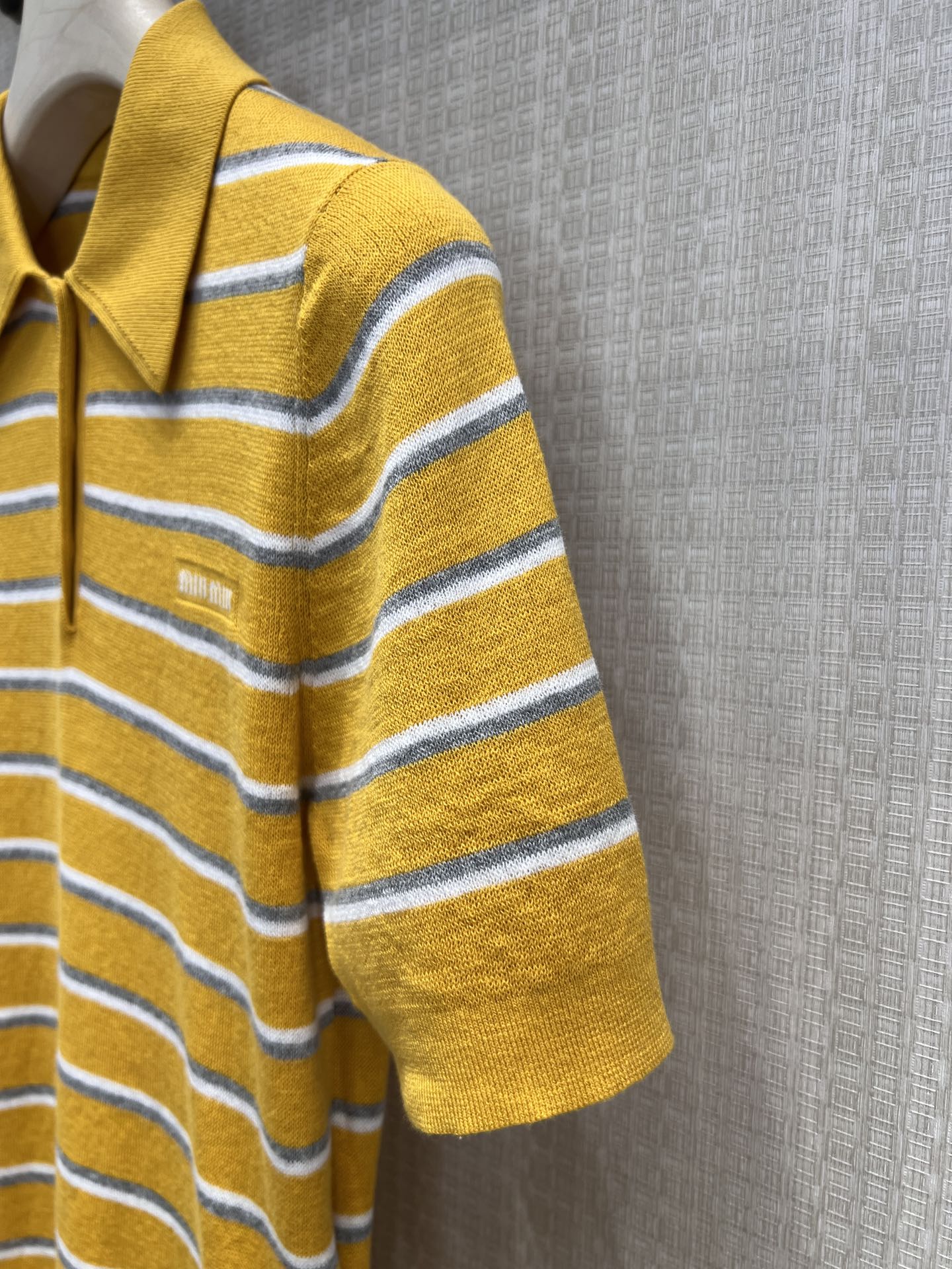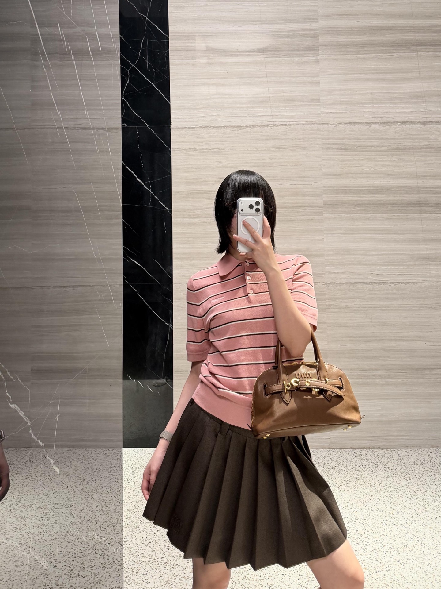 Miu* 26Ss春夏新款 撞色条纹棉质Polo短袖针织衫丨⚠独家yb开发!顶级高版出品!面料选用透气棉质针织材质,软糯亲肤,垂坠感十足,经典Polo翻领+半开扣设计,巧妙修饰脖颈线条,拉长比例,利落又显精神;衣身采用撞色条纹设计,清新配色自带春日滤镜,视觉上显瘦又减龄,对各种身材都友好。微收腰的修身版型,贴合身形却不紧绷,凸显腰线,轻松打造三七分比例。现货发售S/M/L