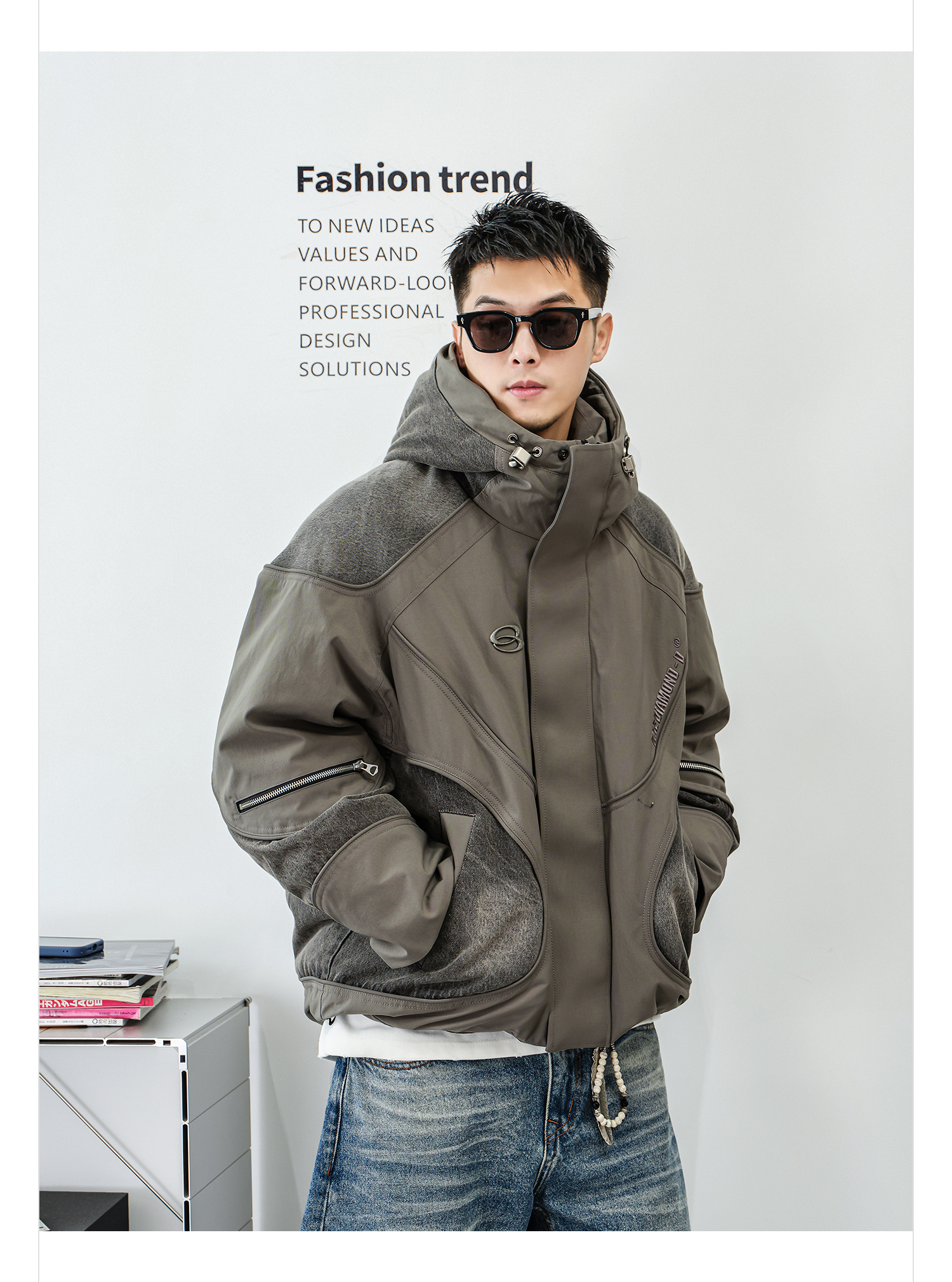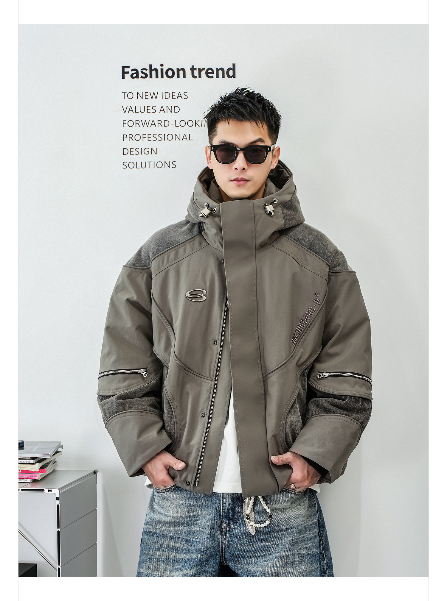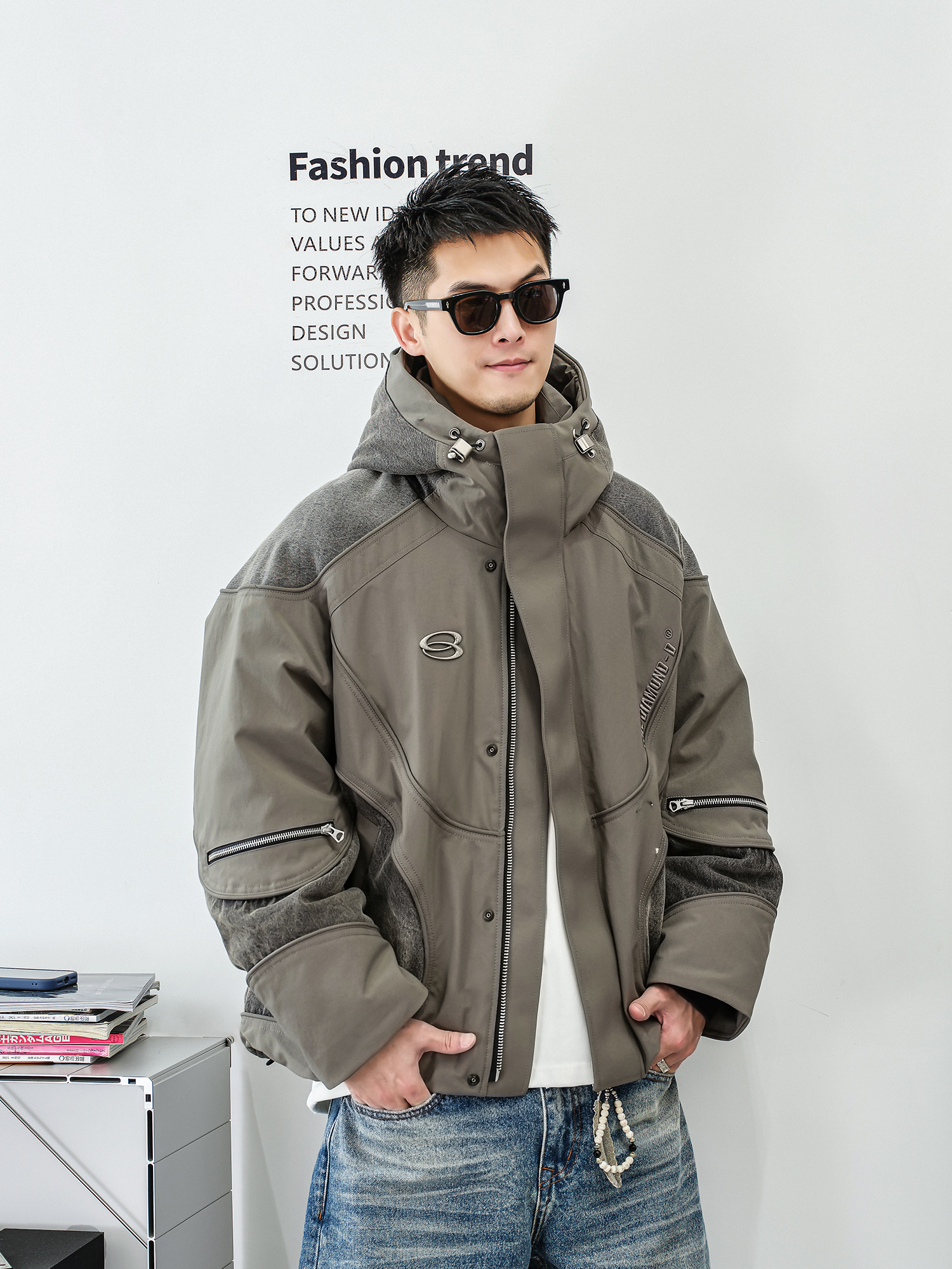 徐太浪【白鹅绒 拼接工装】抽绳连帽羽绒服男冬季防寒服拉链外套