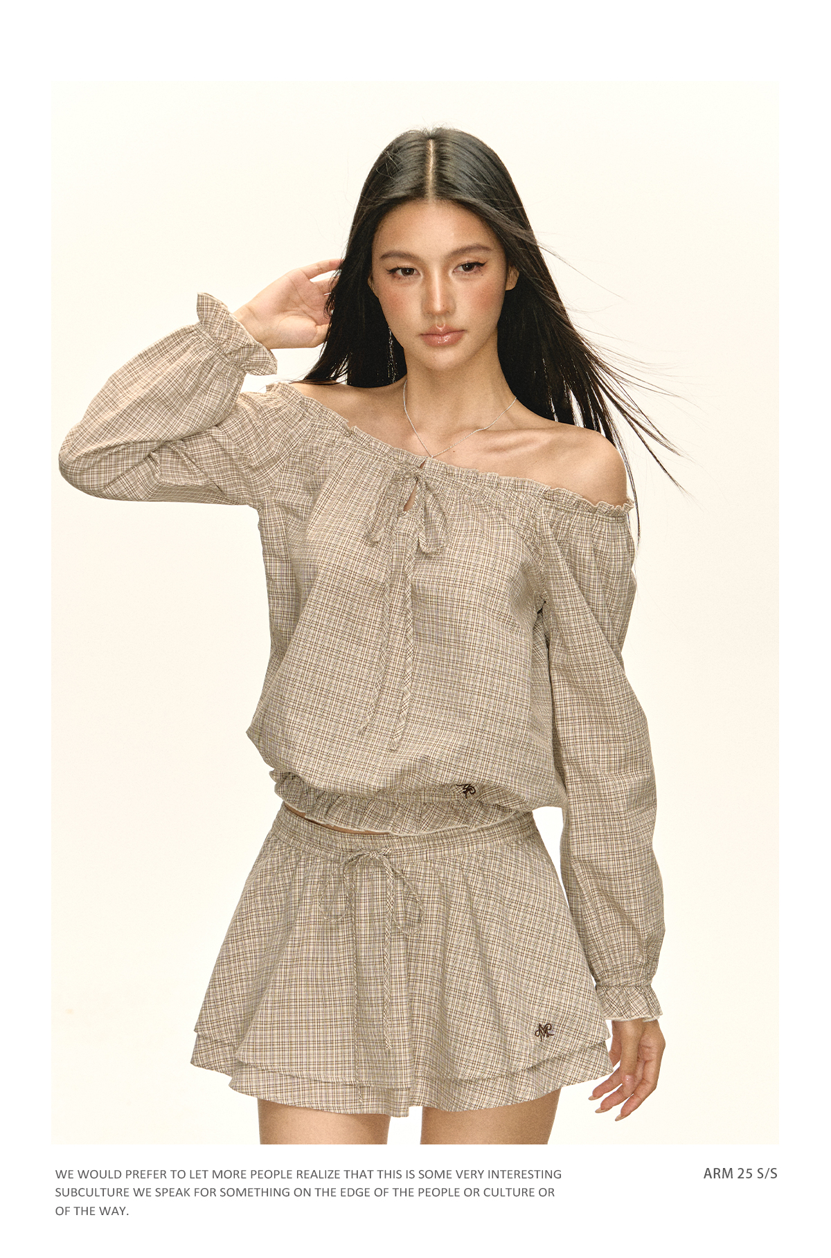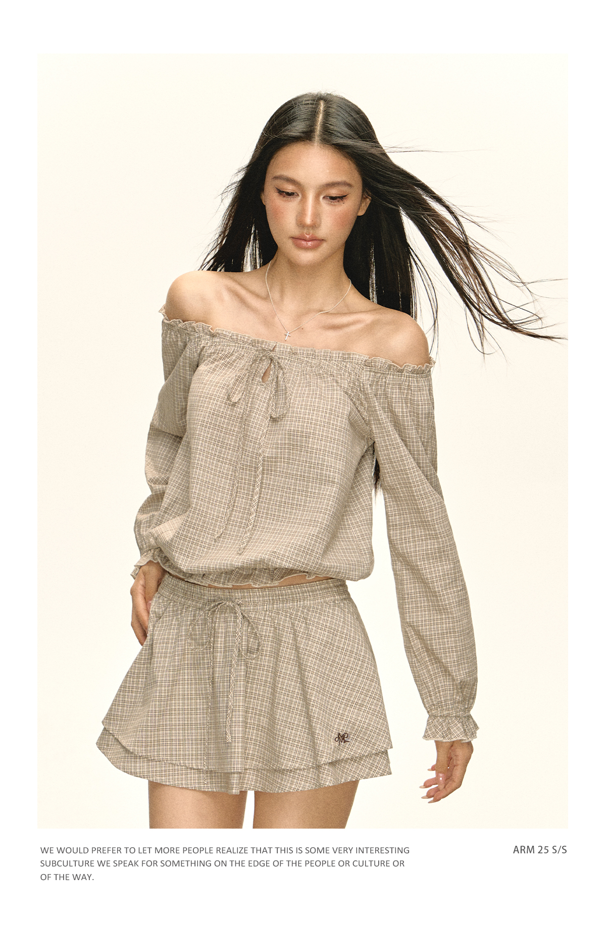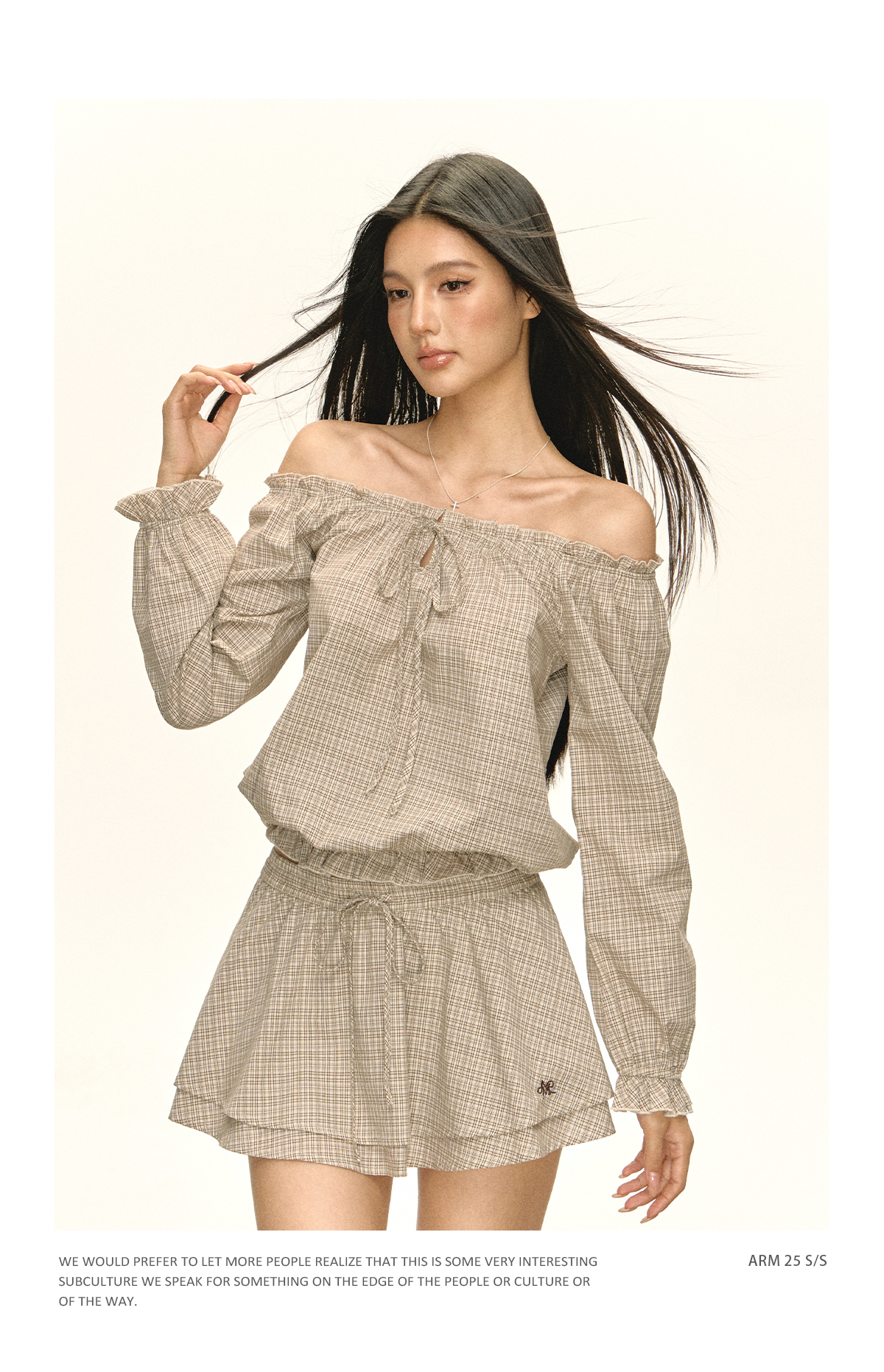 Ariseism 美式复古一字肩上衣+短裙两件套套装女秋季新款