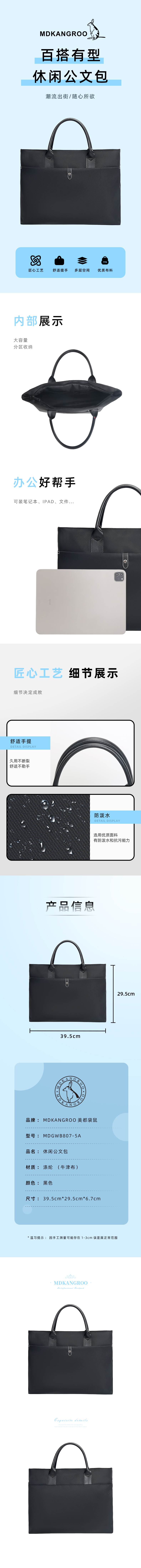 美都袋鼠/MDKANGROO 休闲黑色牛津布手提电脑包会议包可放15.6寸笔记本电脑MDGWB807-5A