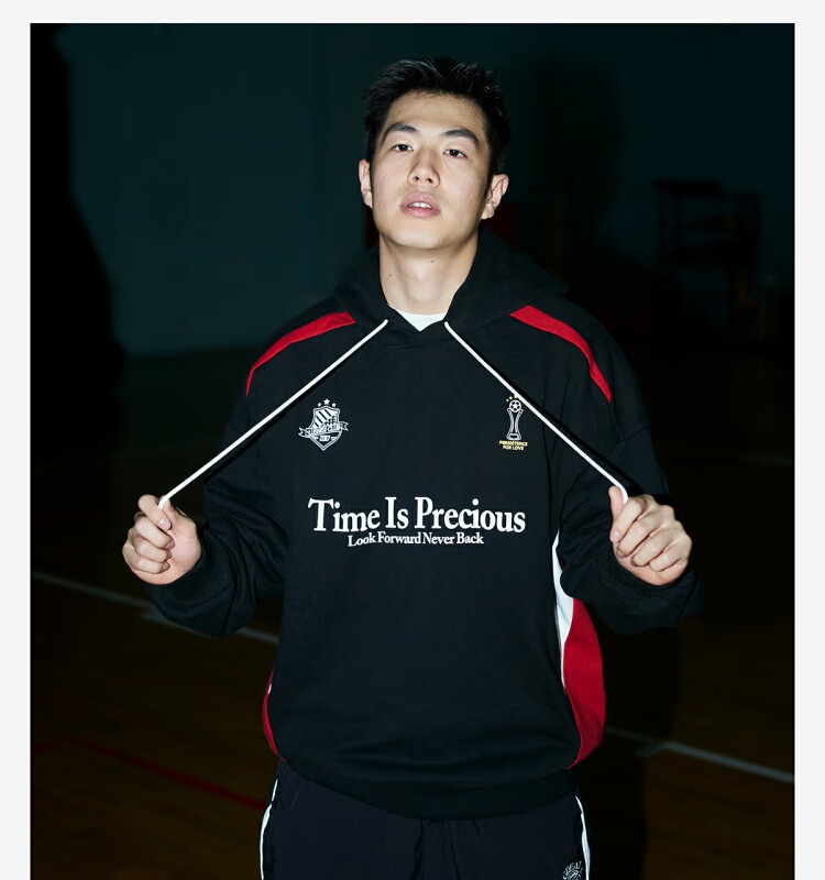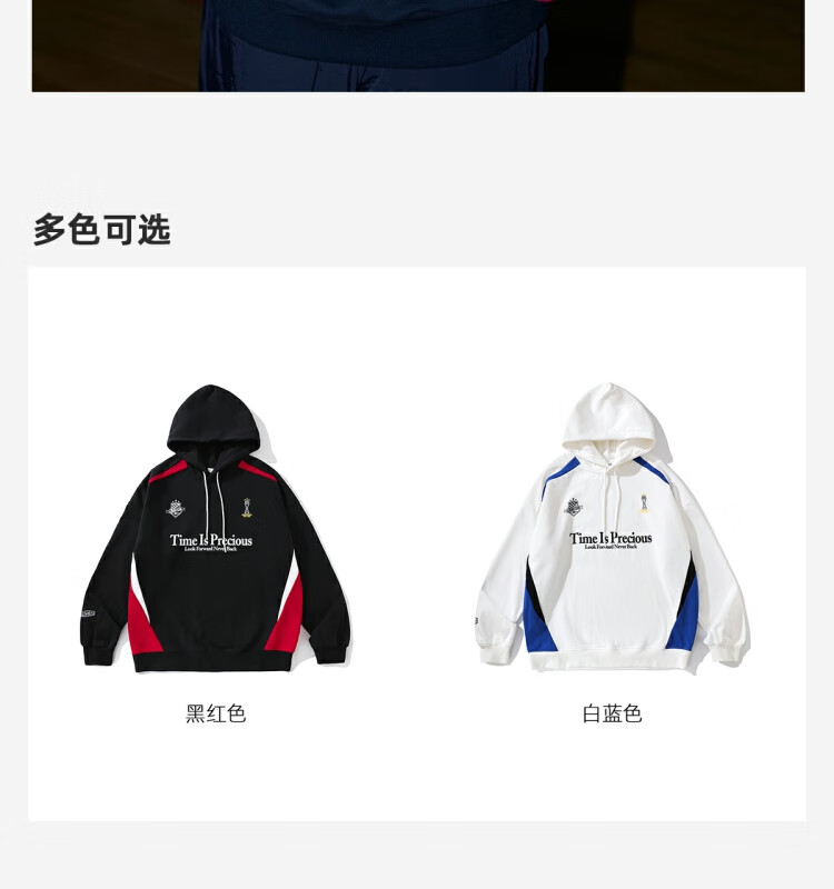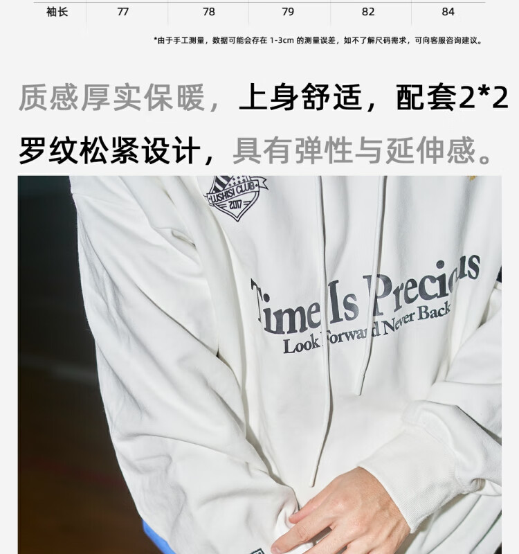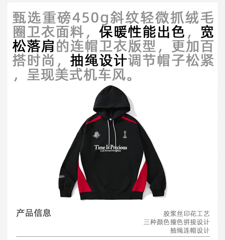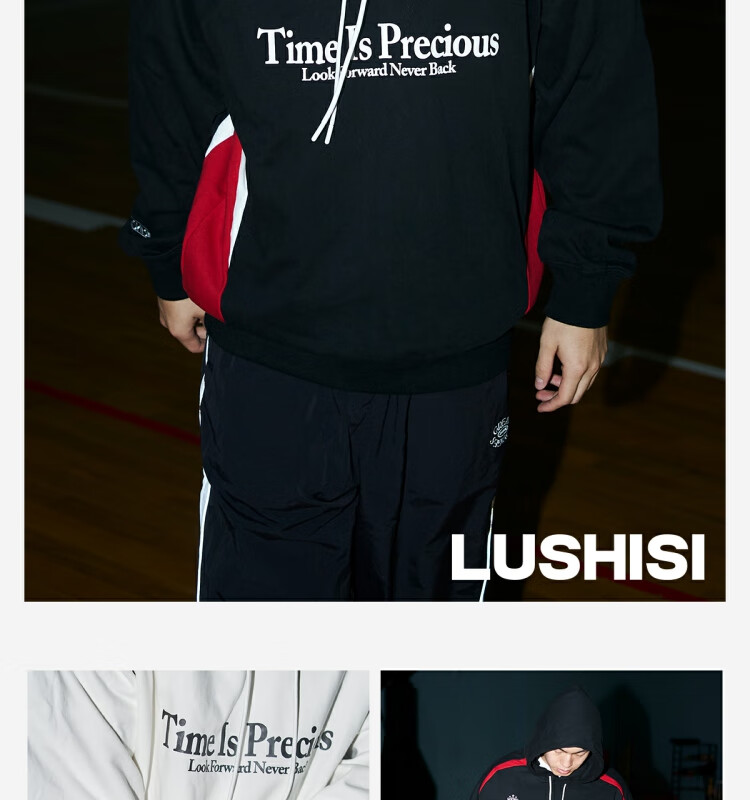 LUSHISILUSHISI时间可贵主题450g重磅微抓绒毛圈厚保暖复古拼接连帽卫衣