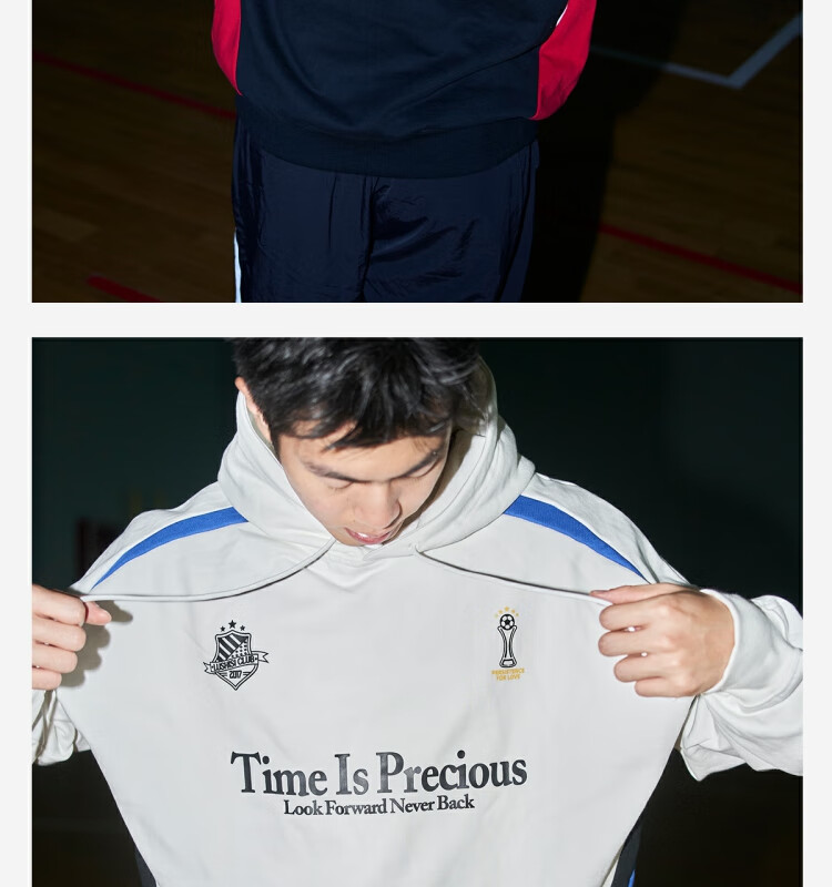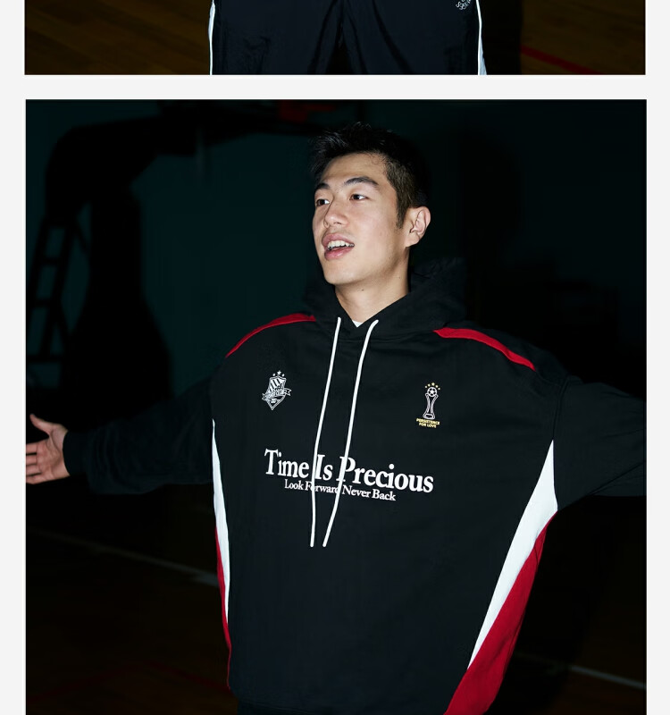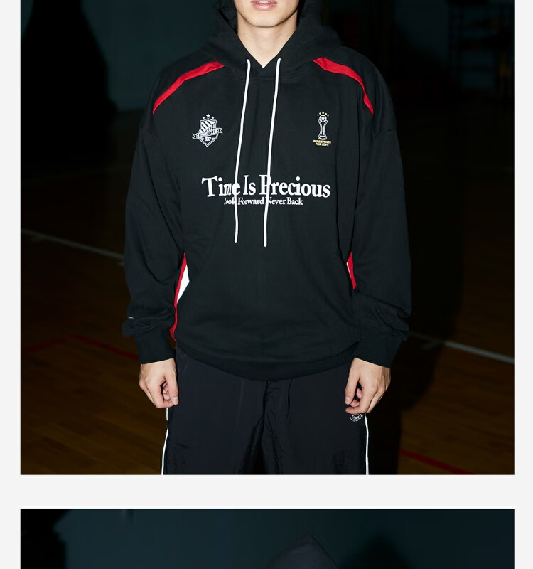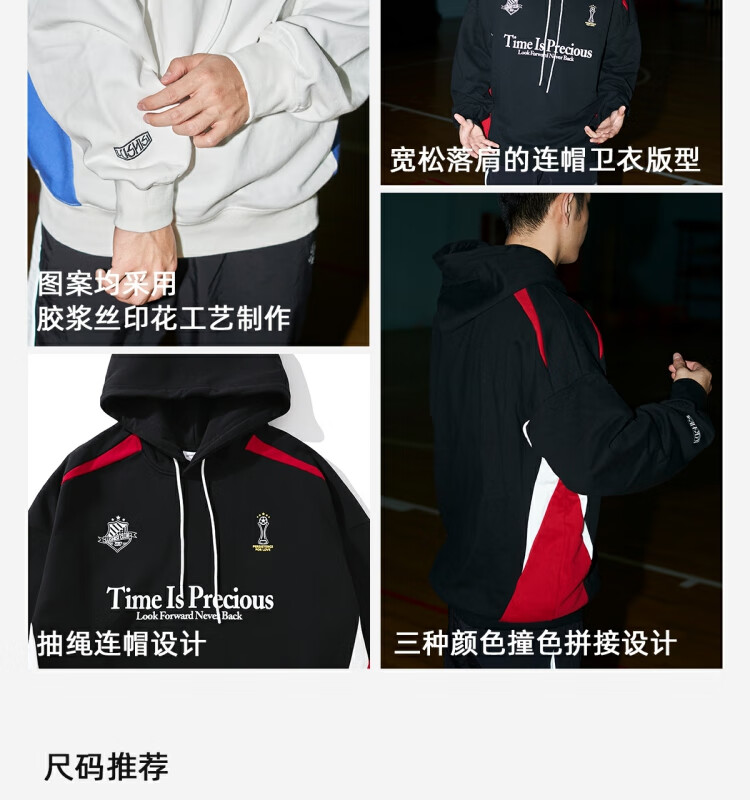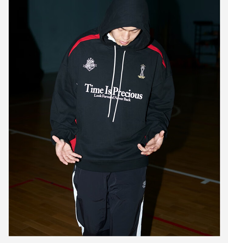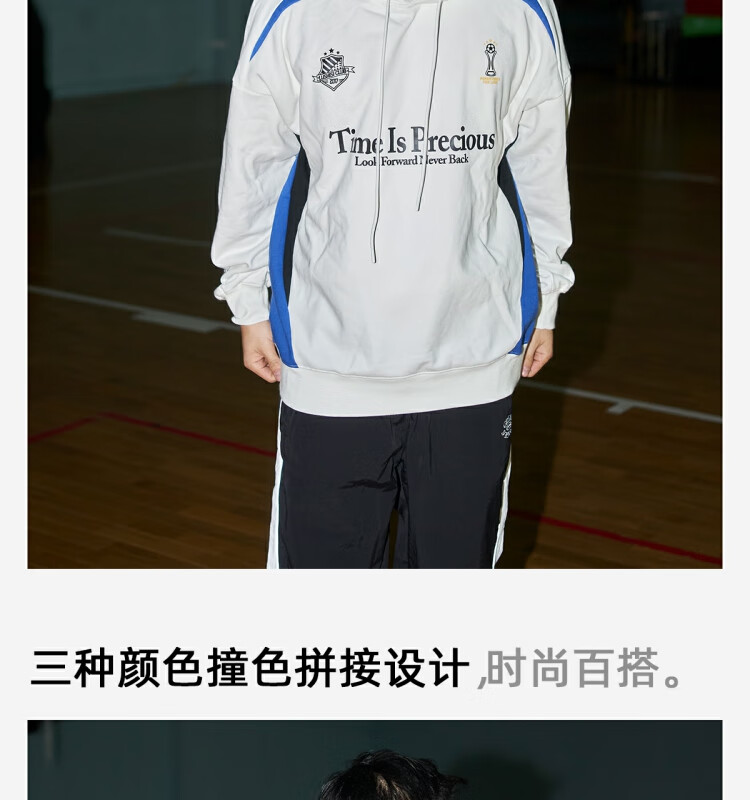 LUSHISILUSHISI时间可贵主题450g重磅微抓绒毛圈厚保暖复古拼接连帽卫衣