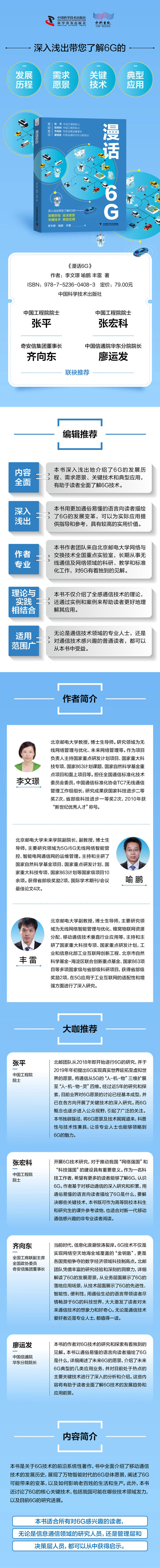 本书是关于6G技术的前沿系统性著作,书中全面介绍了移动通信技术的发展历史,展现了万物智能时代的6G总体愿景,阐述了6G可能带来的变革,以及如何影响老百姓的生活和生产。此外,本书还讨论了6G的核心关键技术,包括我国可能在哪些技术领域发力,以及目前6G的研究进展。本书适合所有对6G感兴趣的读者,无论是信息通信领域的研究人员,还是管理层和决策层人员,都可以从中获得启示。