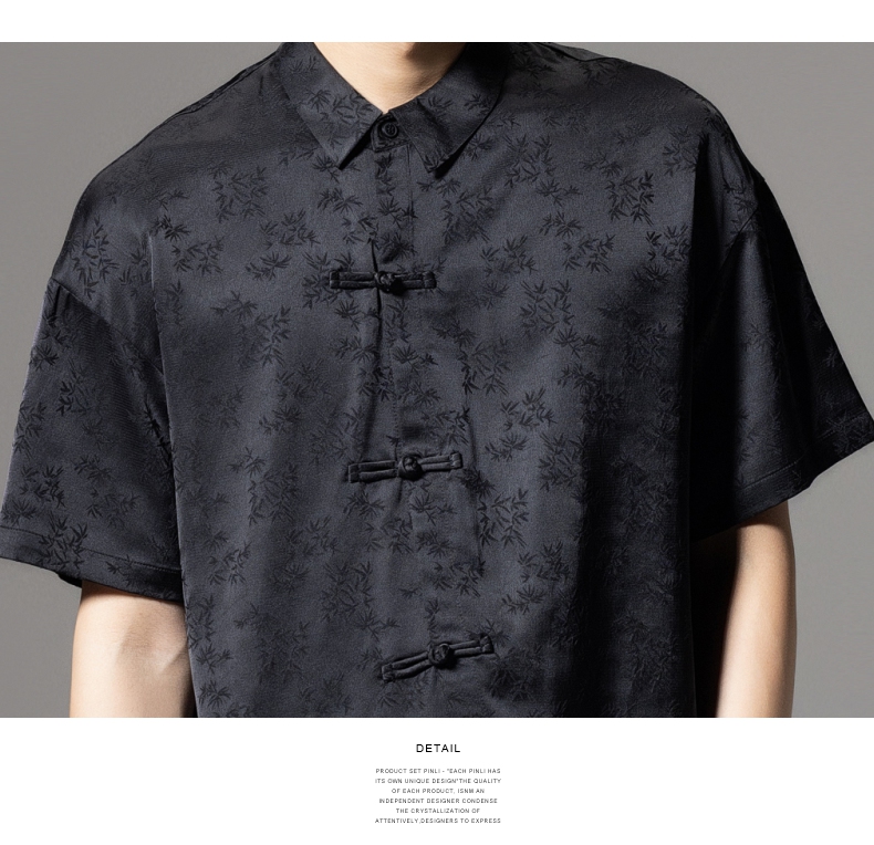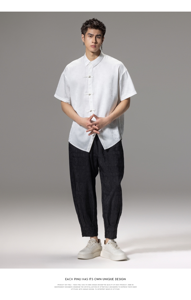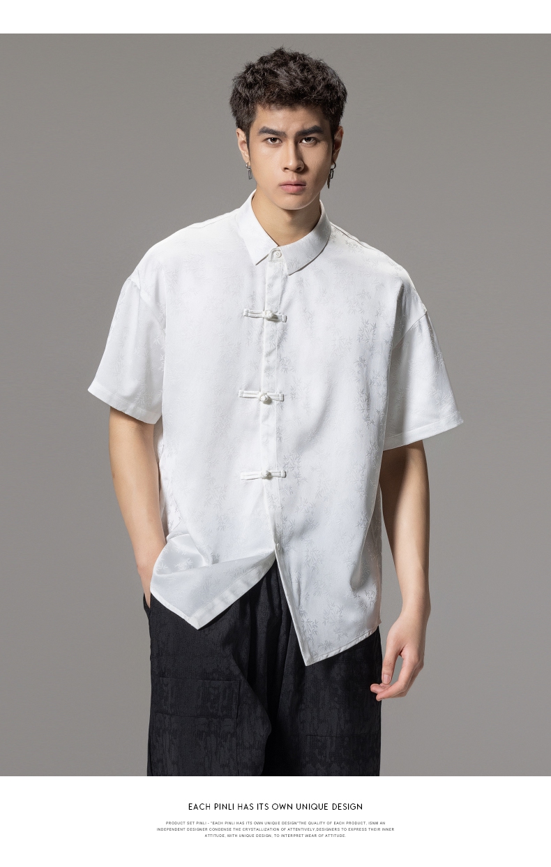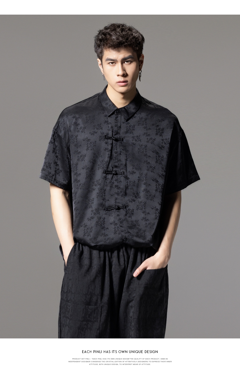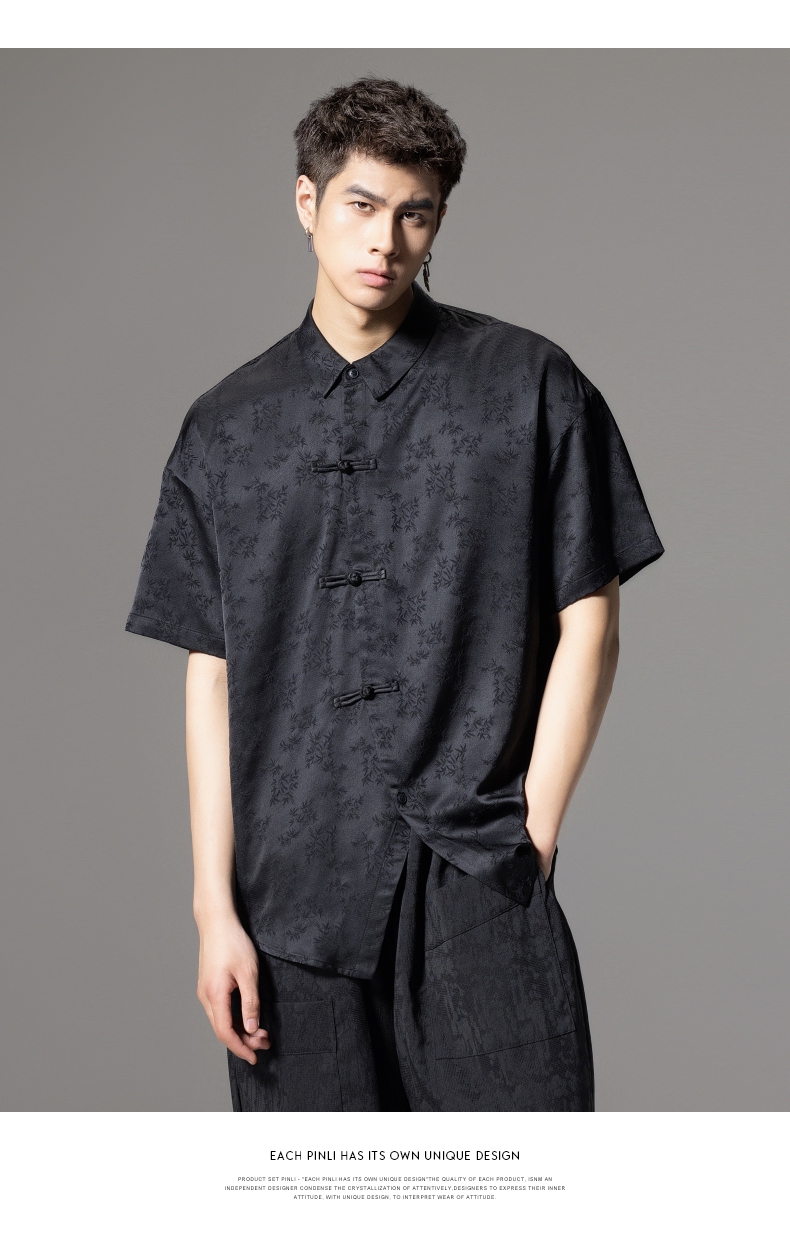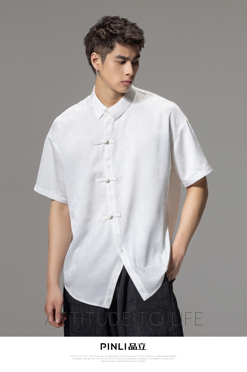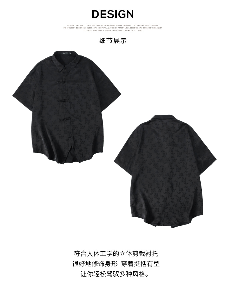 PINLI品立夏季新款新中式盘扣短袖衬衫男提花宽松中国风衬衣B242113084