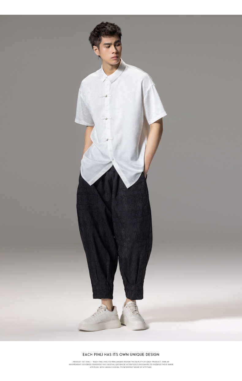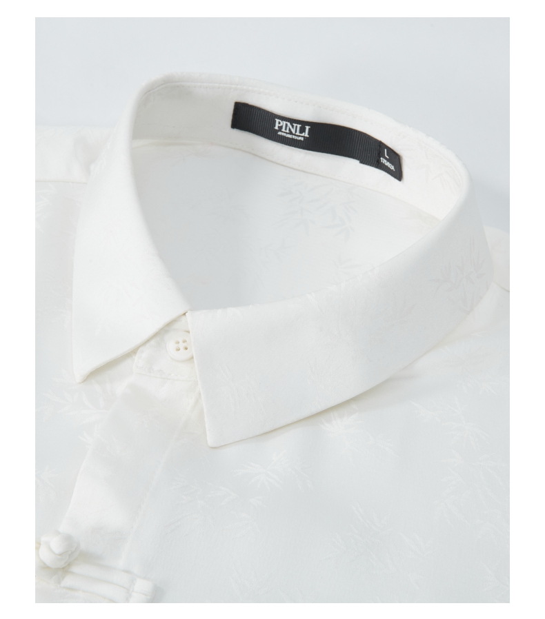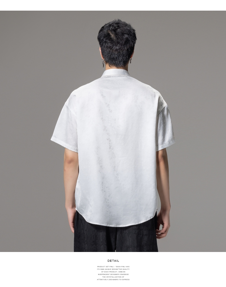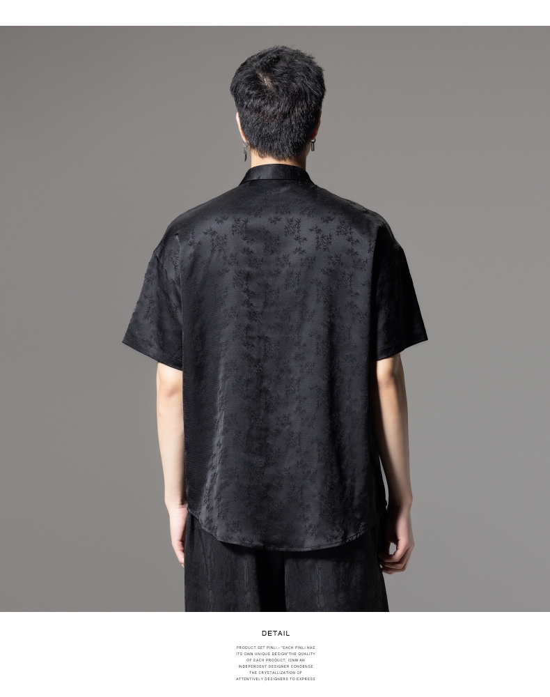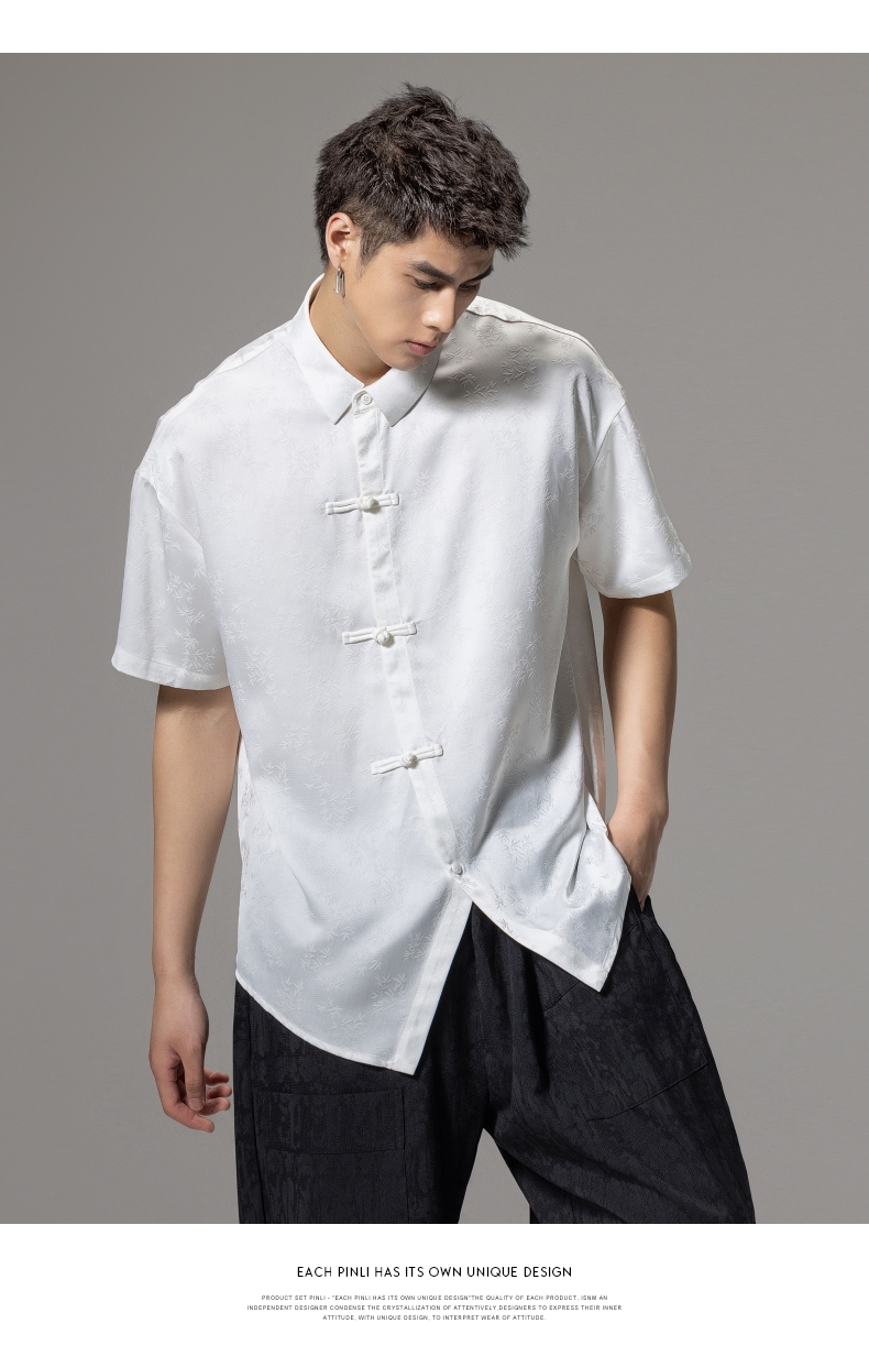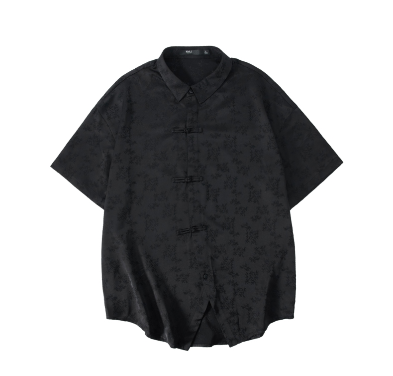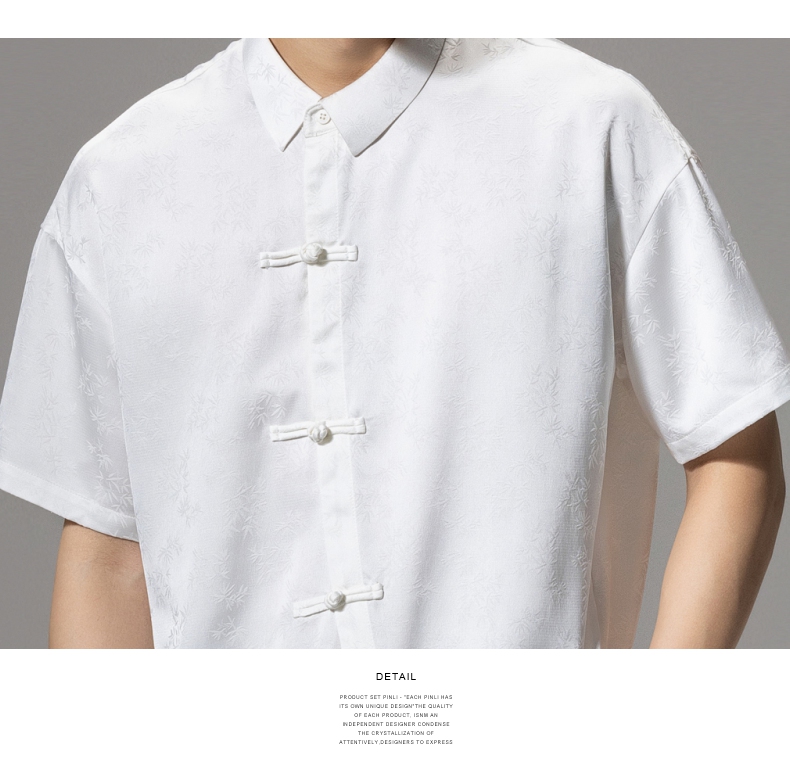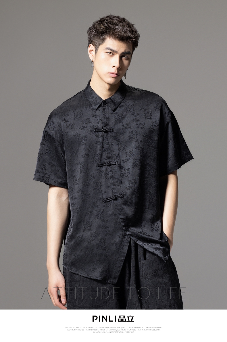 PINLI品立夏季新款新中式盘扣短袖衬衫男提花宽松中国风衬衣B242113084