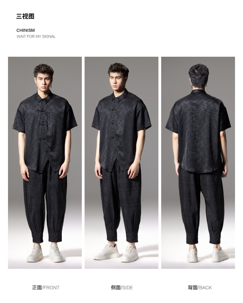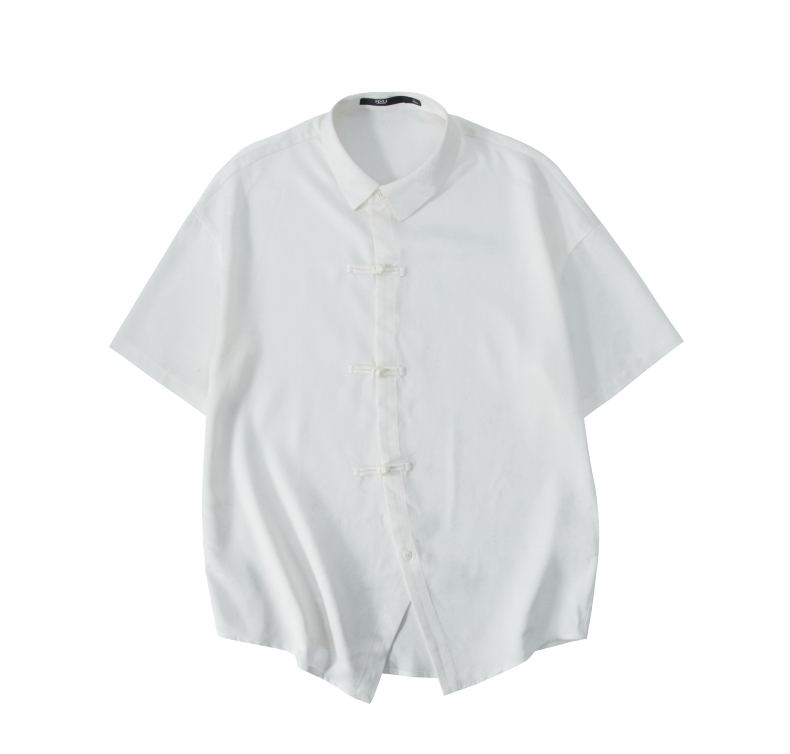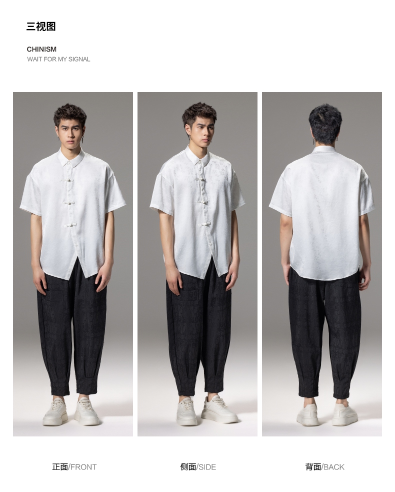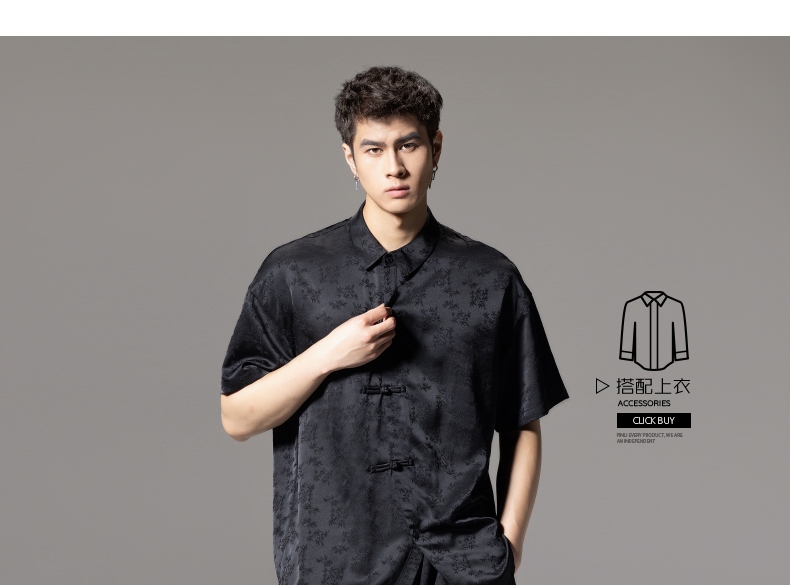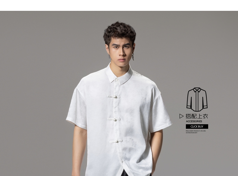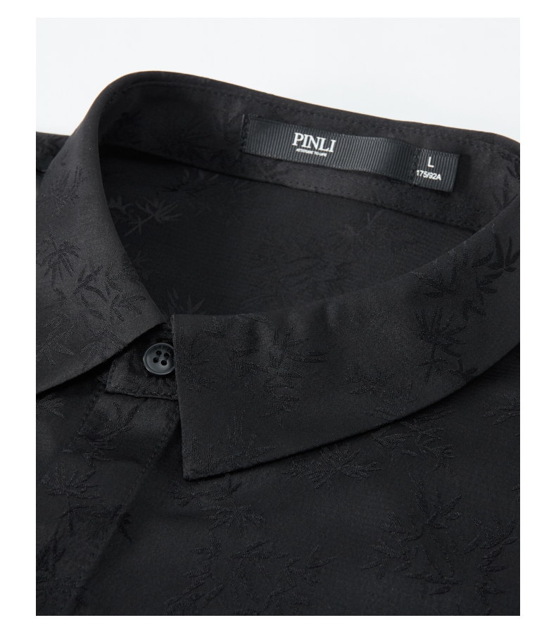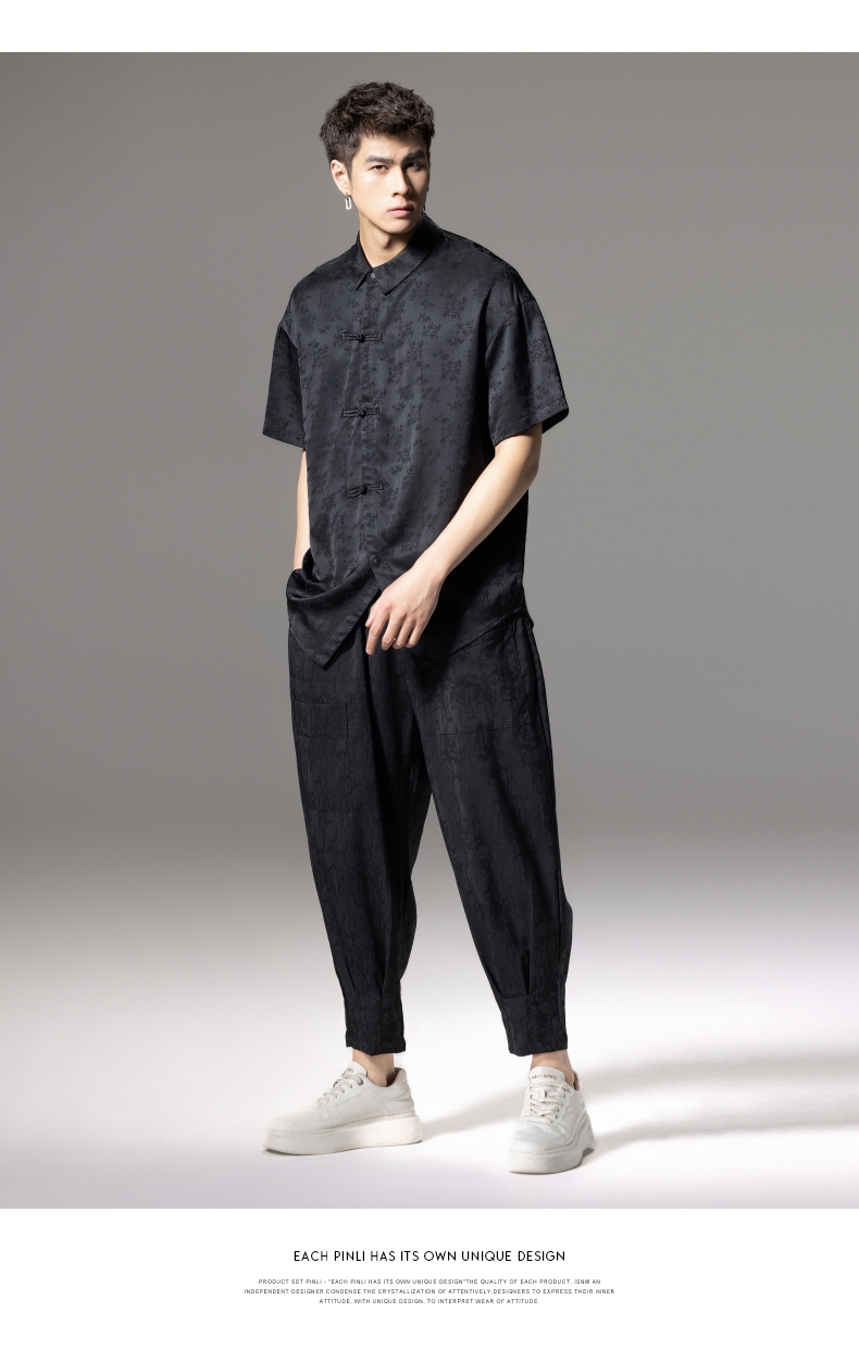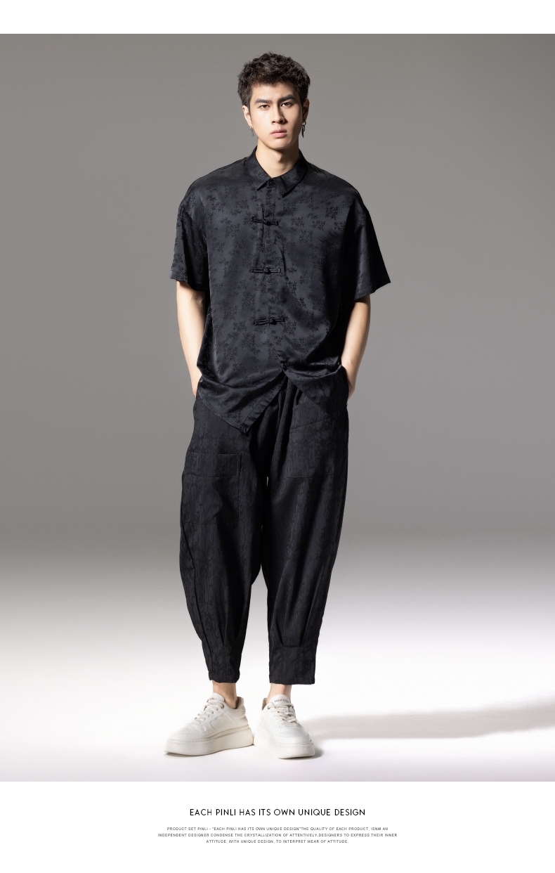 PINLI品立夏季新款新中式盘扣短袖衬衫男提花宽松中国风衬衣B242113084