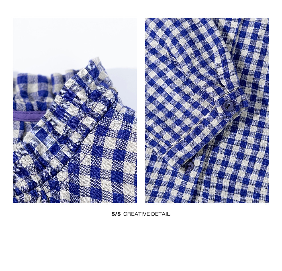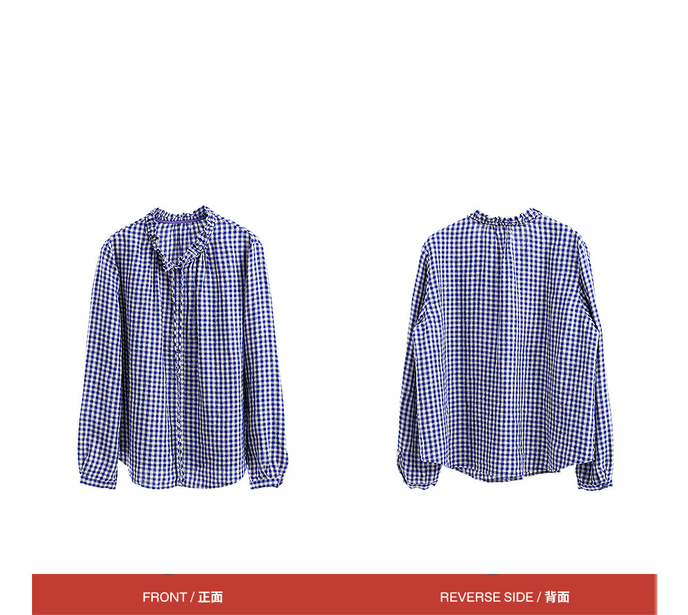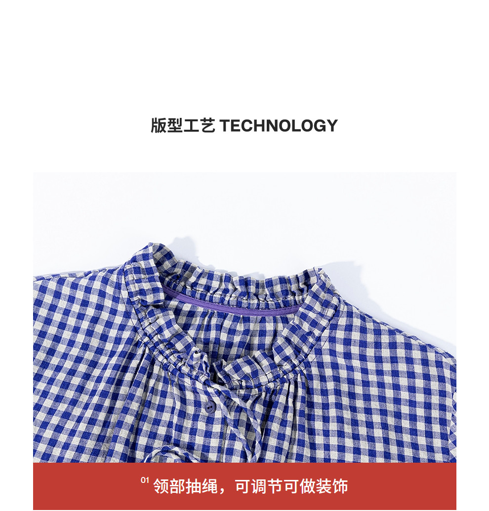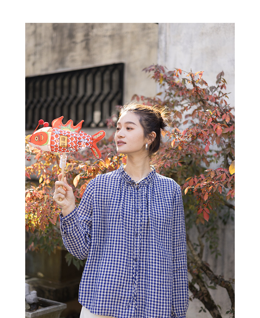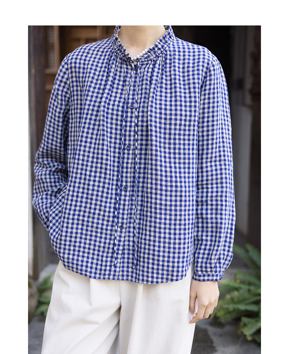 绽放071朵/春序·纯亚麻蓝白格子小立领抽绳衬衫休闲长袖小衫女春