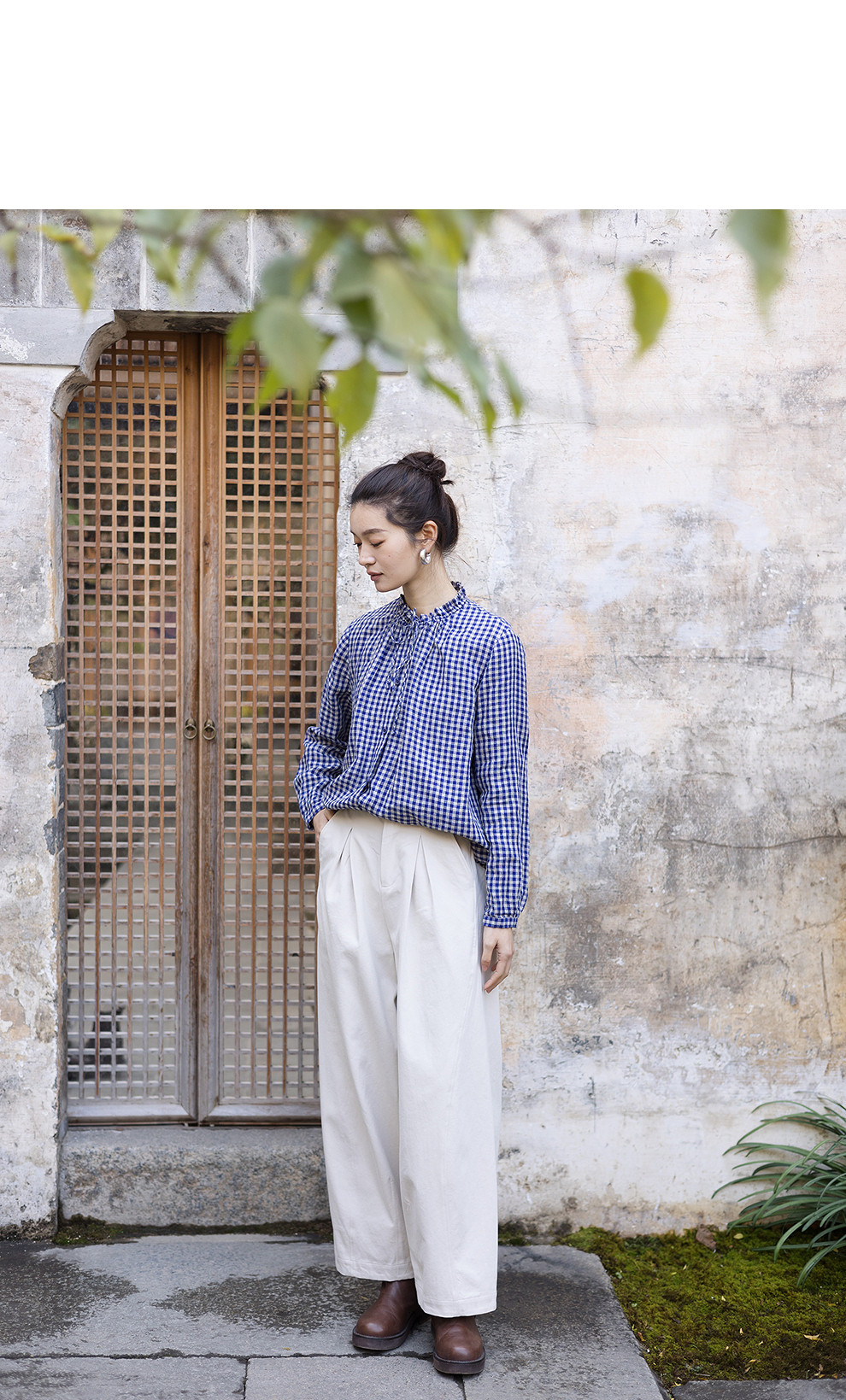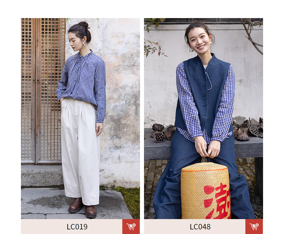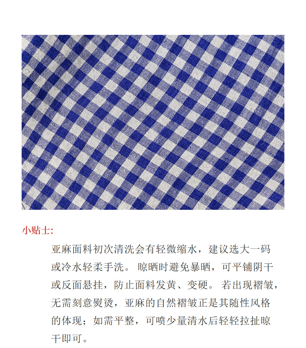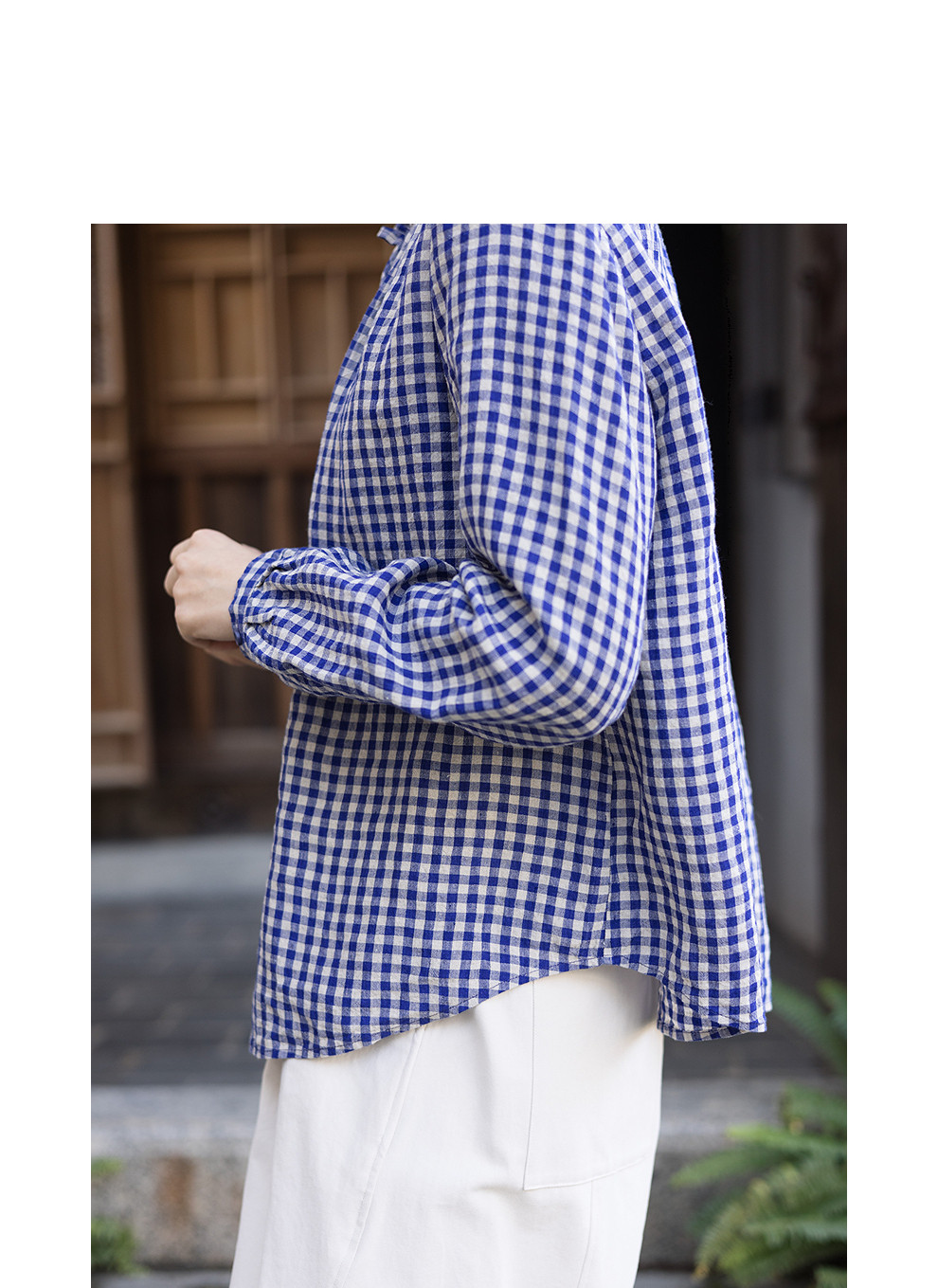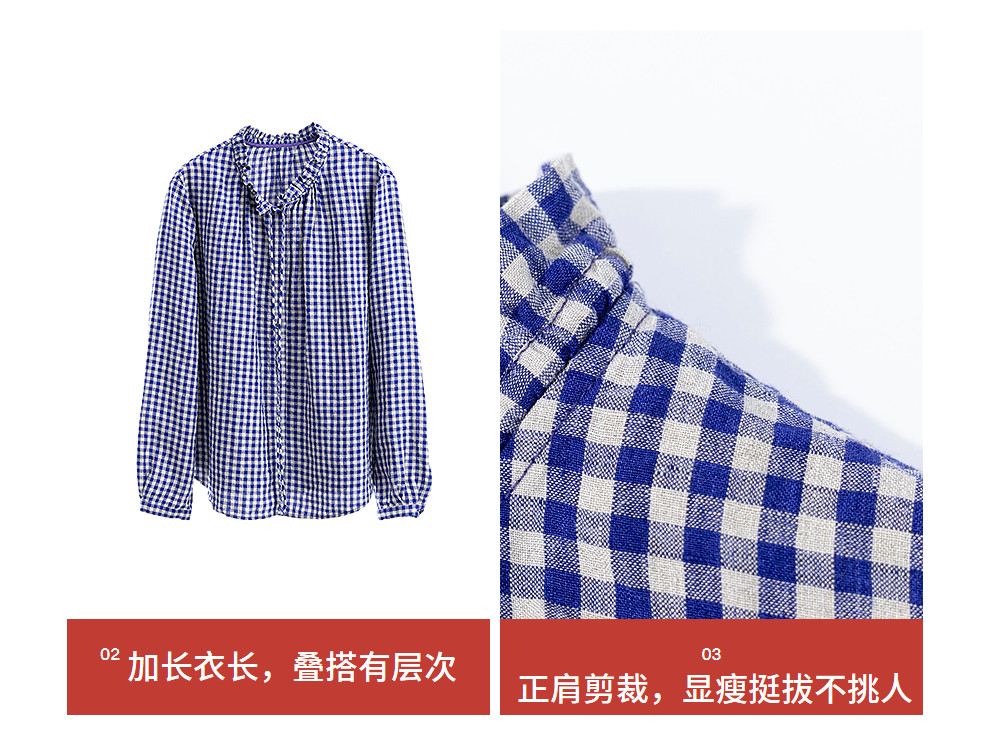 绽放071朵/春序·纯亚麻蓝白格子小立领抽绳衬衫休闲长袖小衫女春