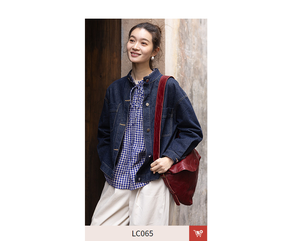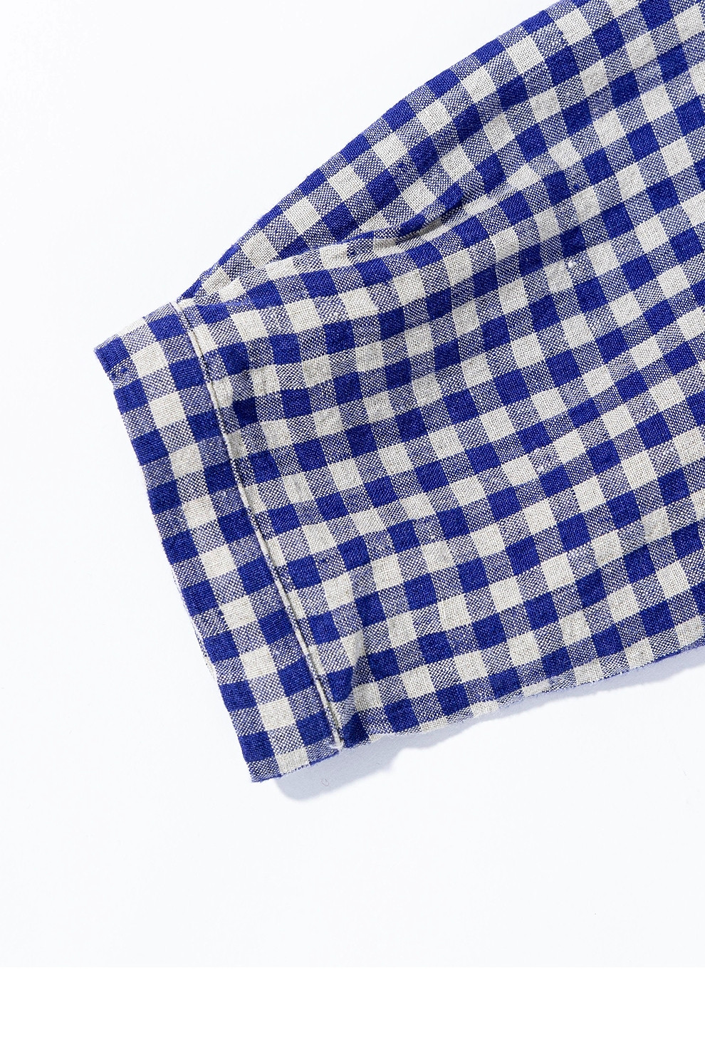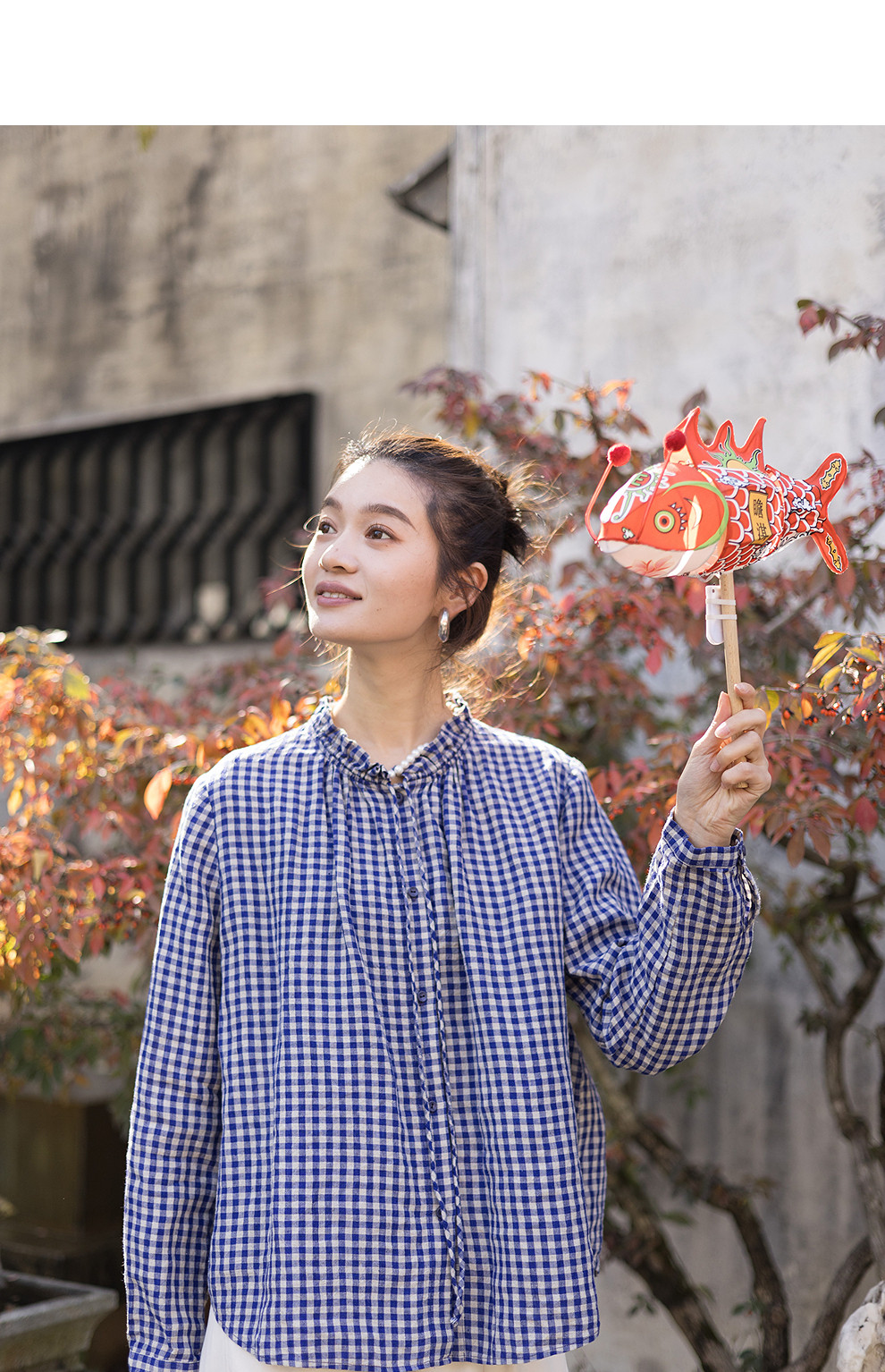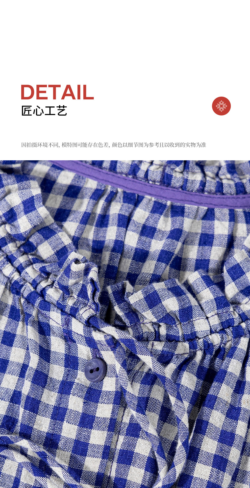 绽放071朵/春序·纯亚麻蓝白格子小立领抽绳衬衫休闲长袖小衫女春