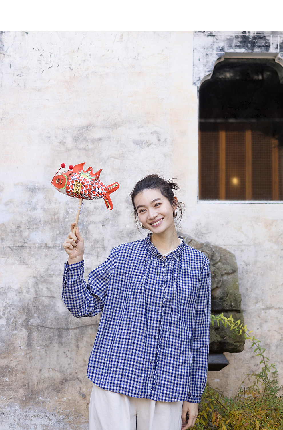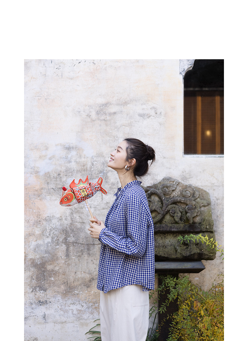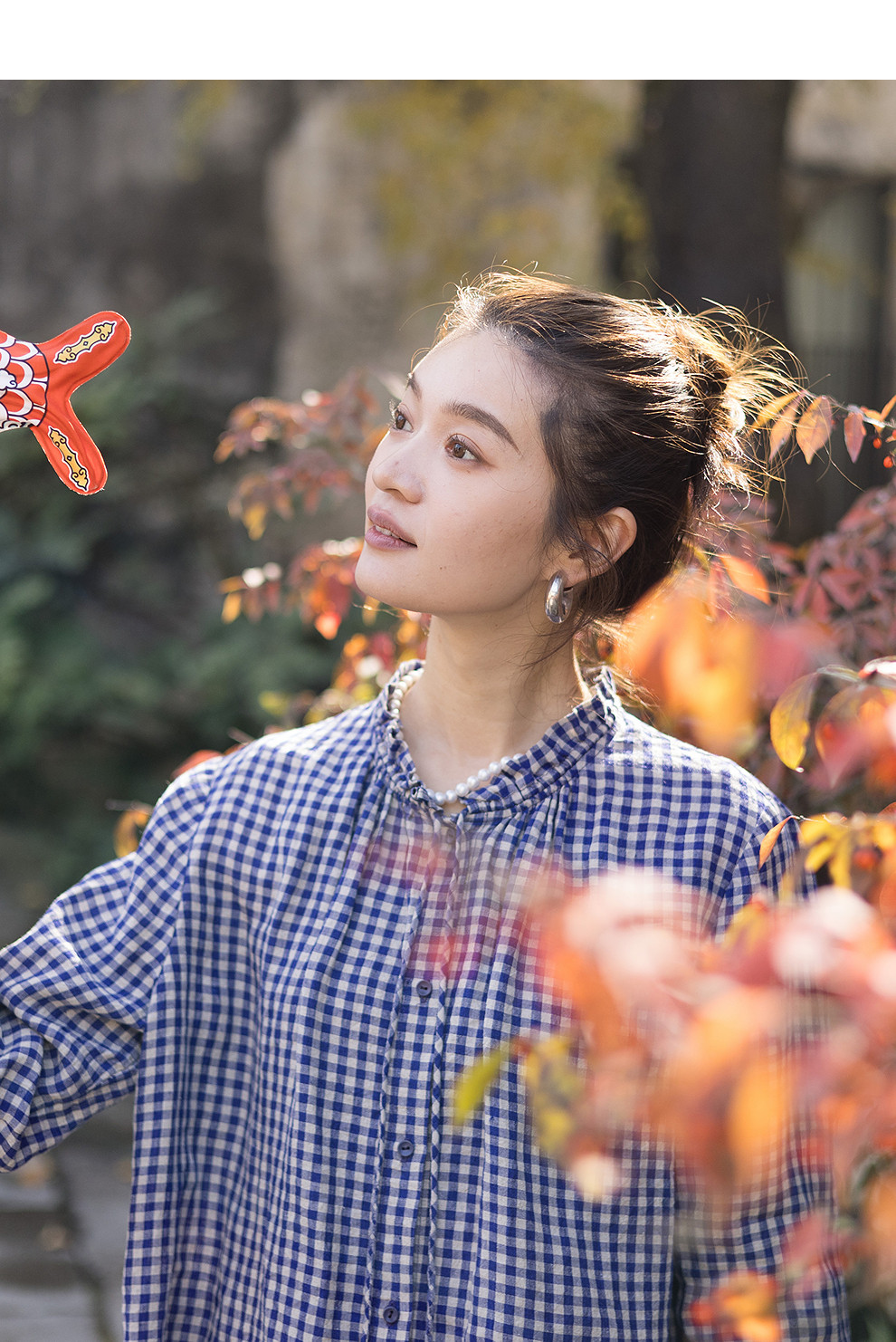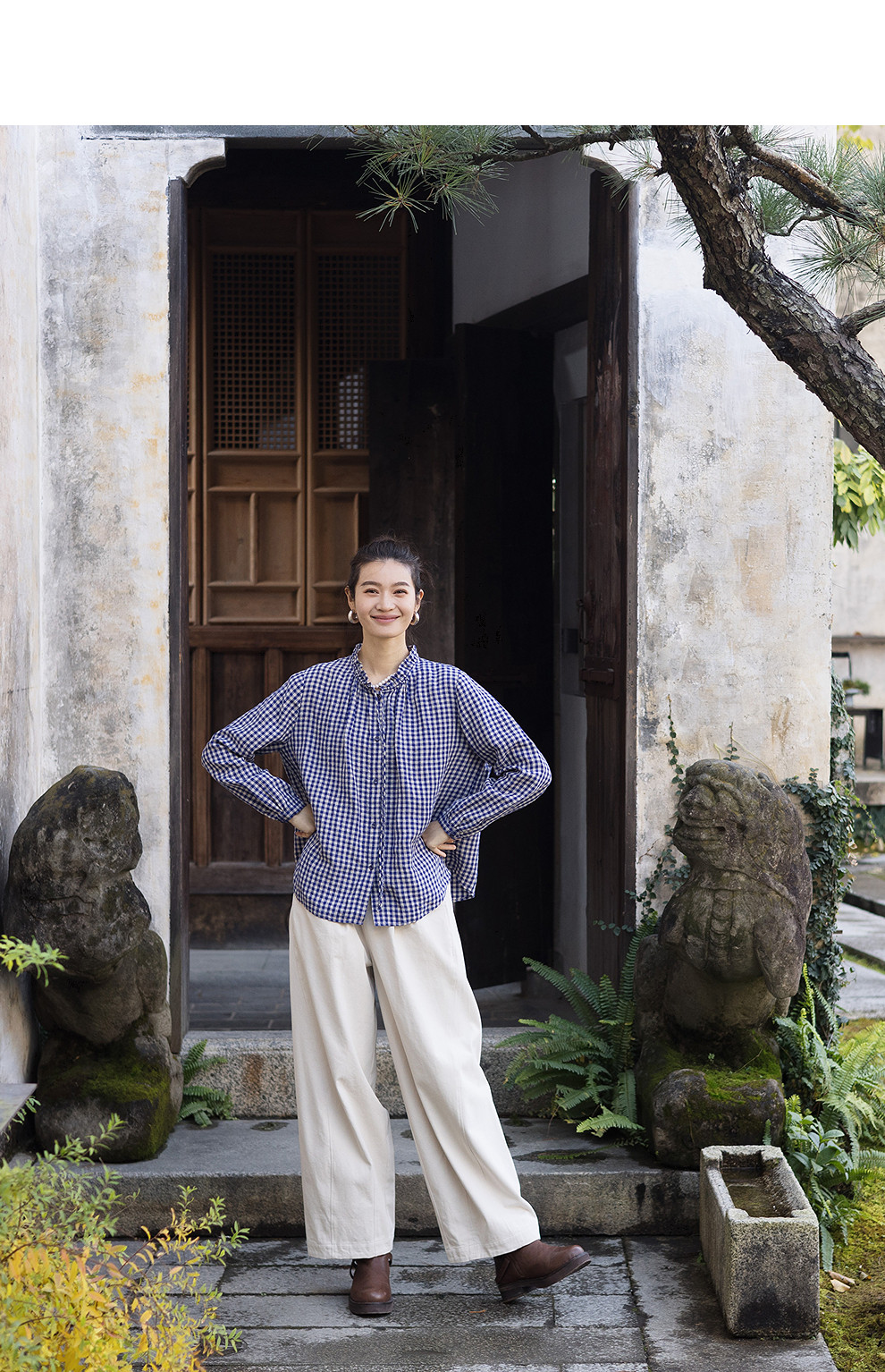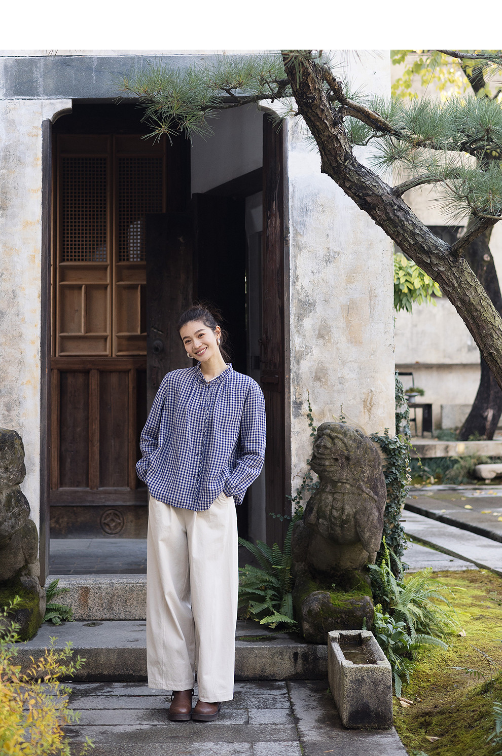 绽放071朵/春序·纯亚麻蓝白格子小立领抽绳衬衫休闲长袖小衫女春