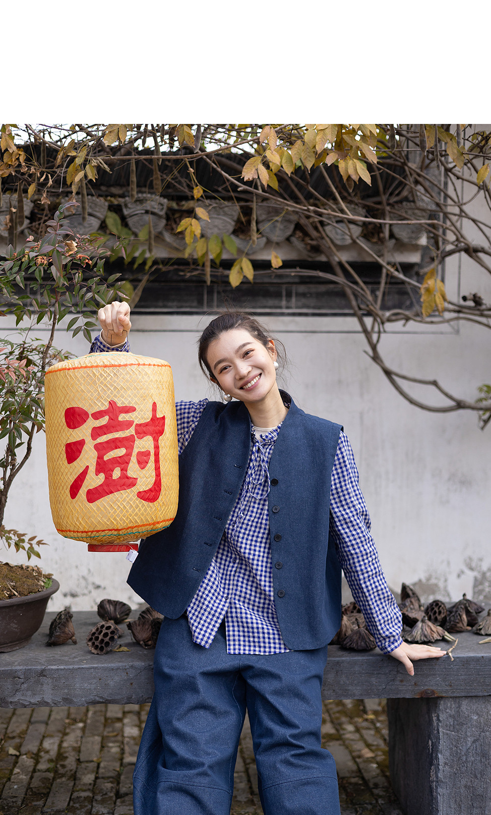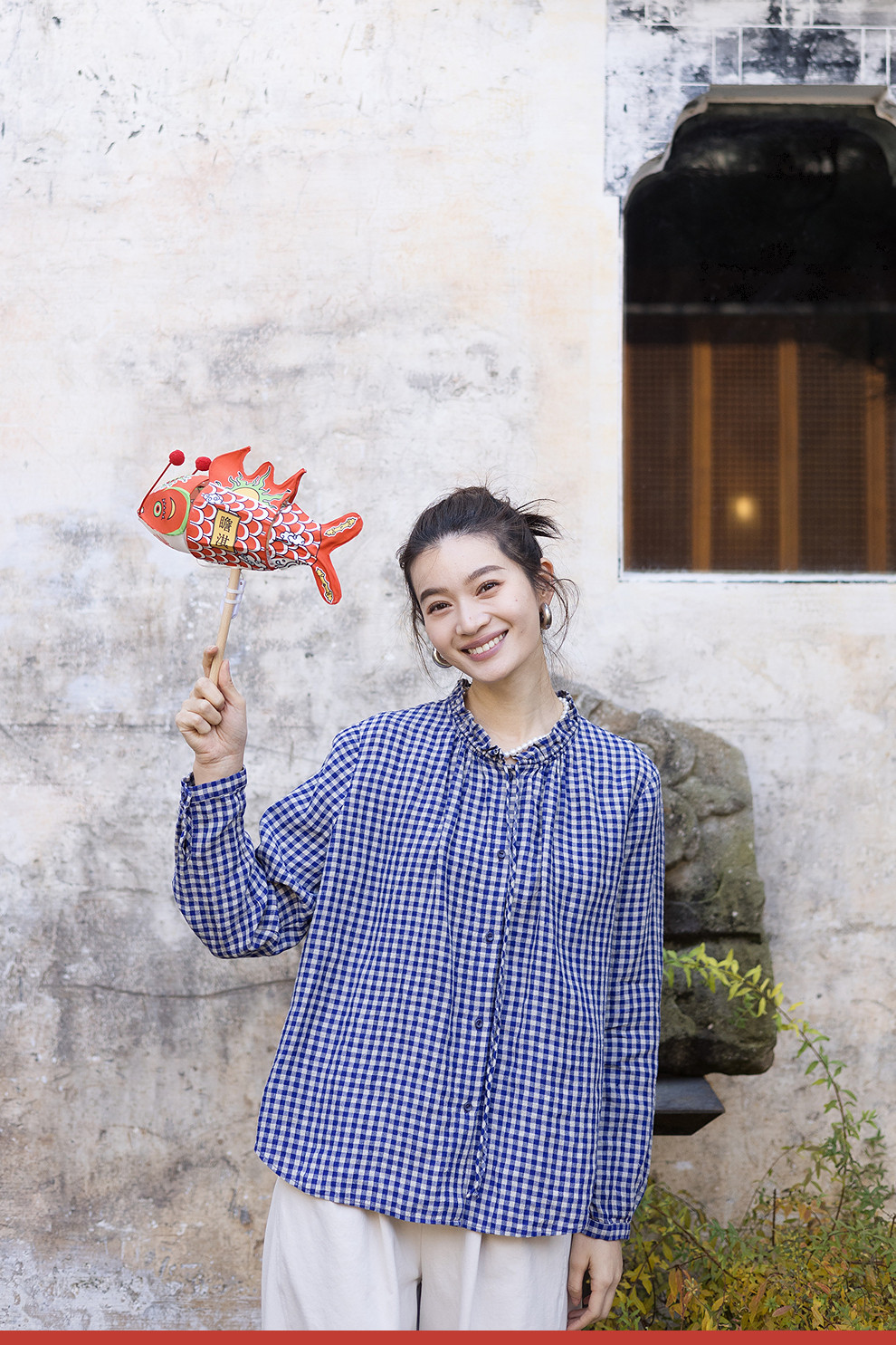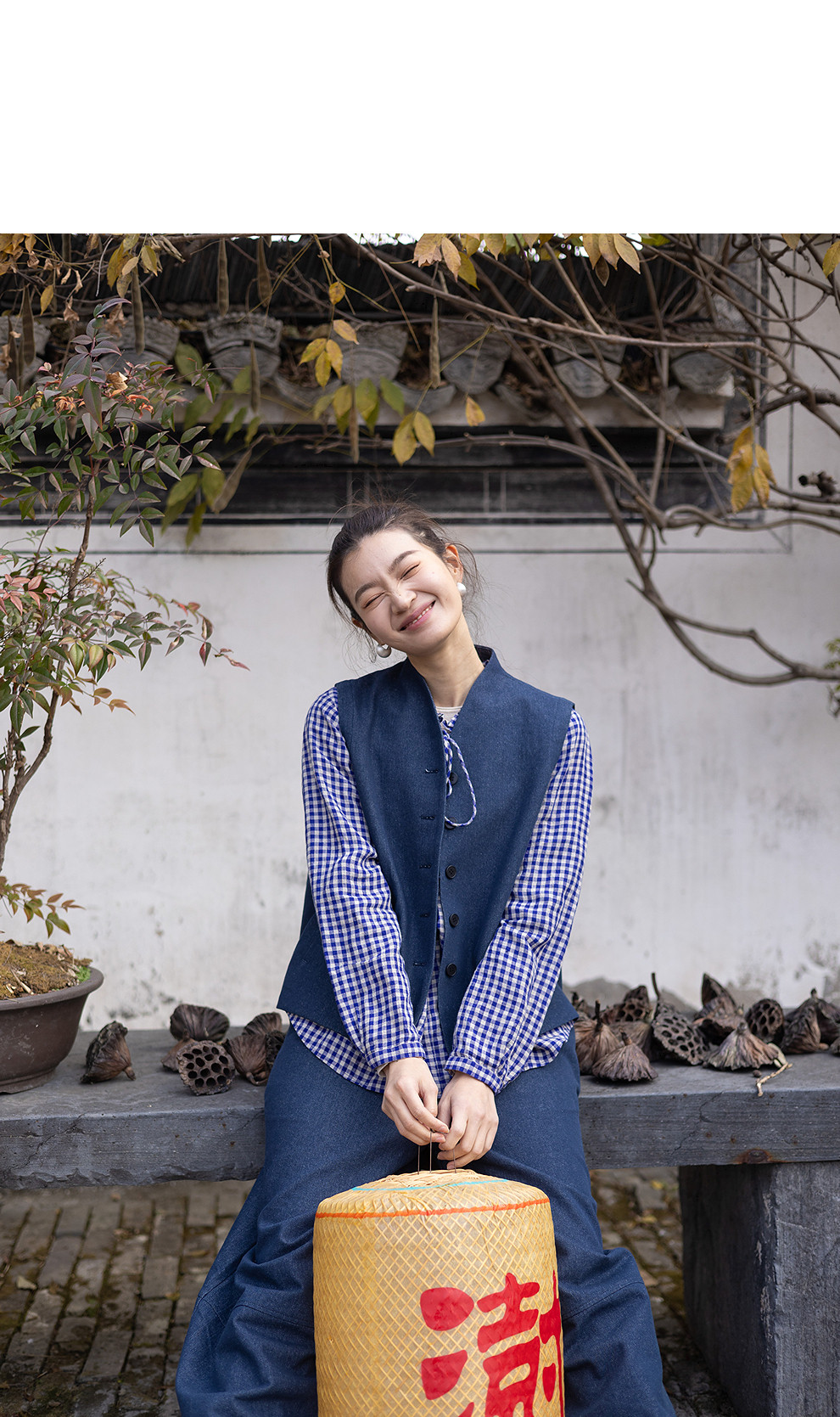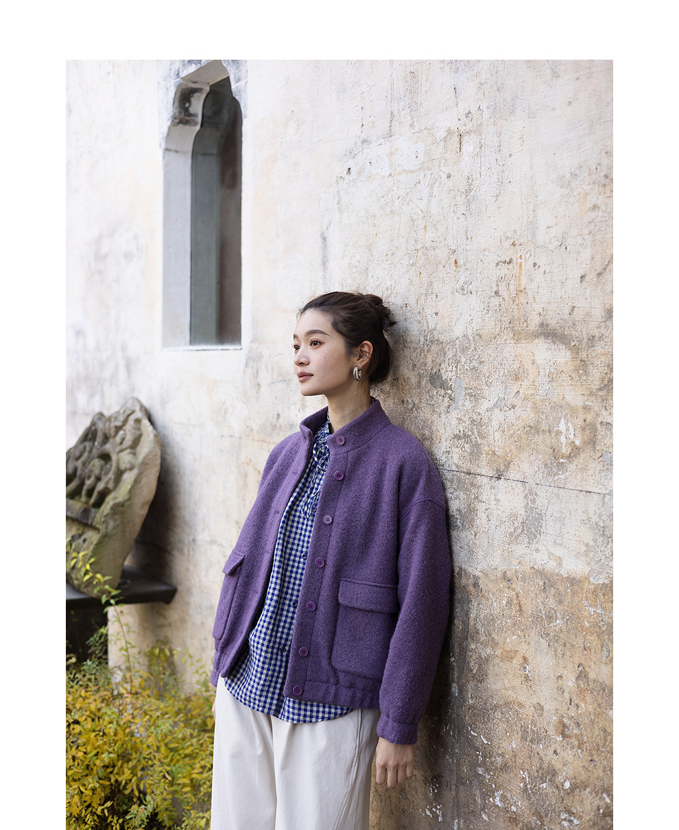 绽放071朵/春序·纯亚麻蓝白格子小立领抽绳衬衫休闲长袖小衫女春