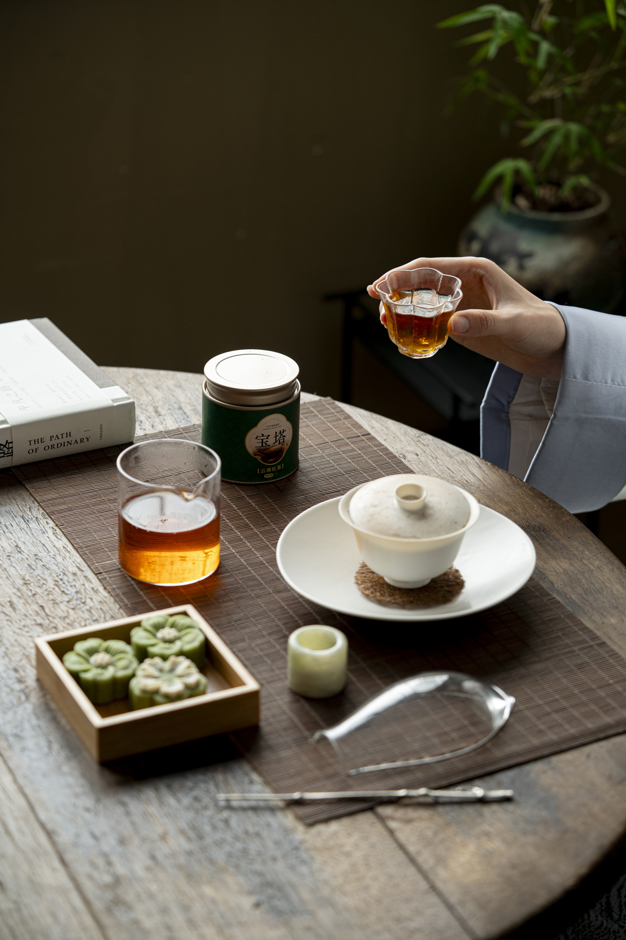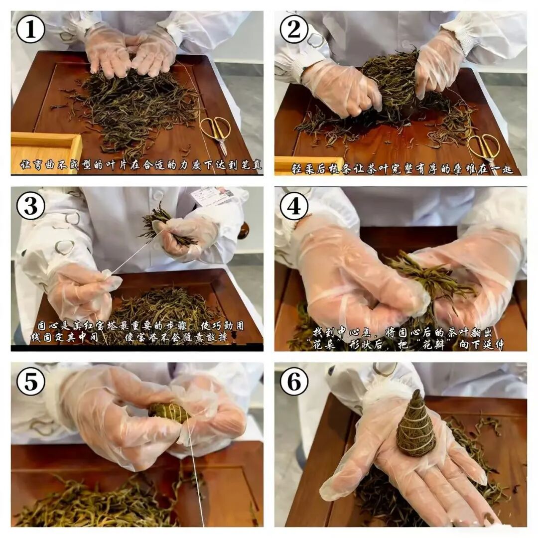 太松,冲泡后散掉;太紧,影响茶叶舒展。收口时线头要藏进缝隙,既美观又不影响口感。经过 60℃、8-10 小时的文火复烘,每一颗宝塔误差不超过 0.2 克,紧实匀整、线条流畅。