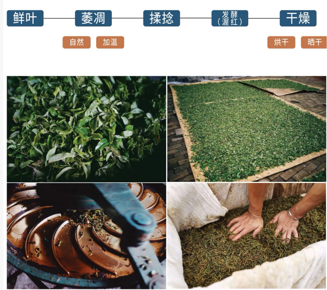 萎凋程度更重,叶片柔软到极致;揉捻采用三段式,轻揉、重压、轻揉结合,整整 30-40 分钟,让细胞充分破碎,茶多酚、茶黄素大量溢出,卷曲成螺。