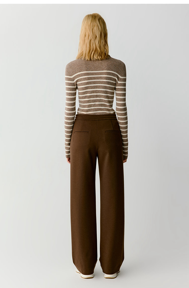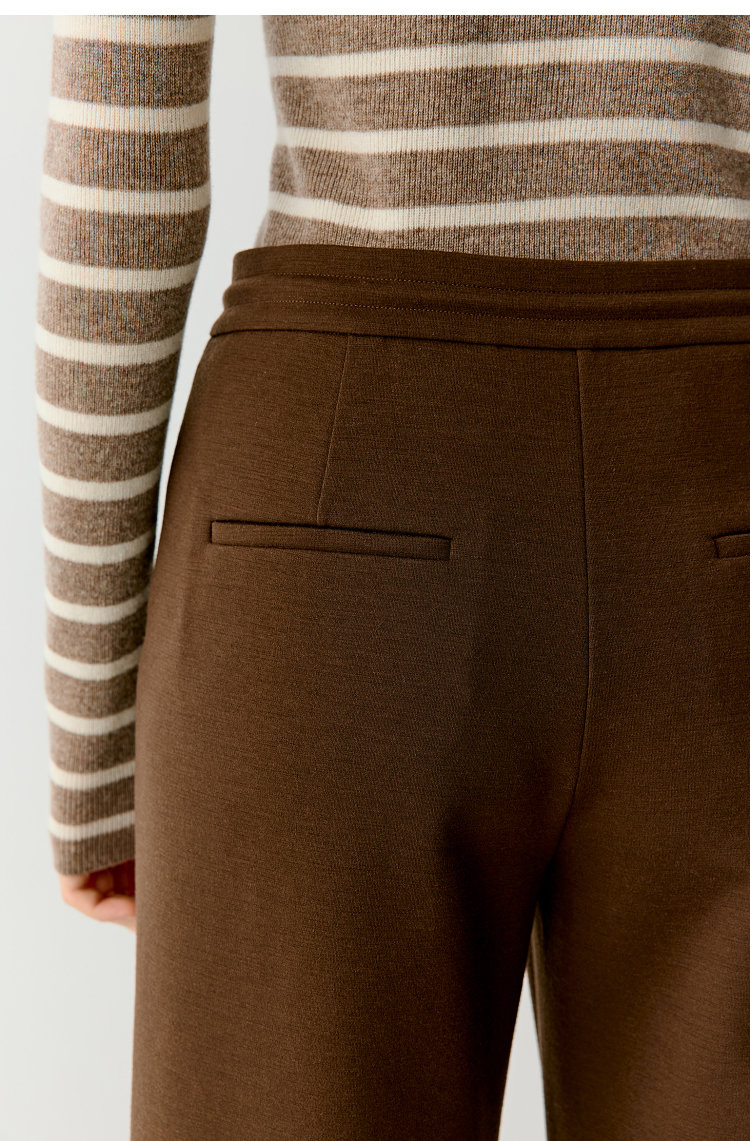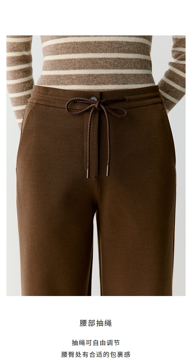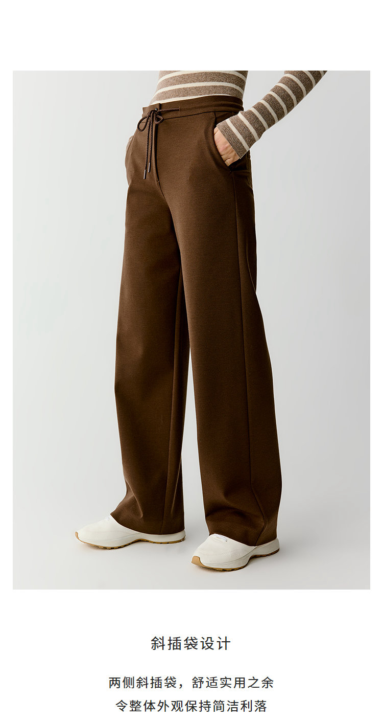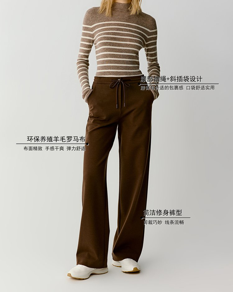 羊毛混纺罗马布抽绳裤直筒裤 简洁修身裤型 罗马布结构稳定 穿着舒适 松紧抽绳腰带设计 自由调节松紧度 简约大气 高腰宽松版型
