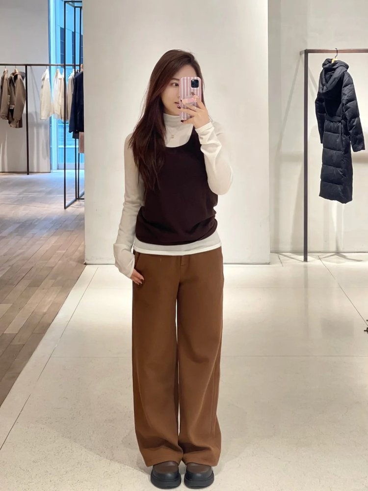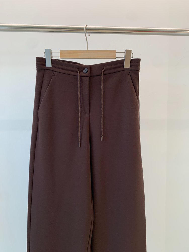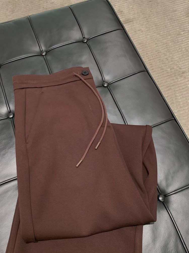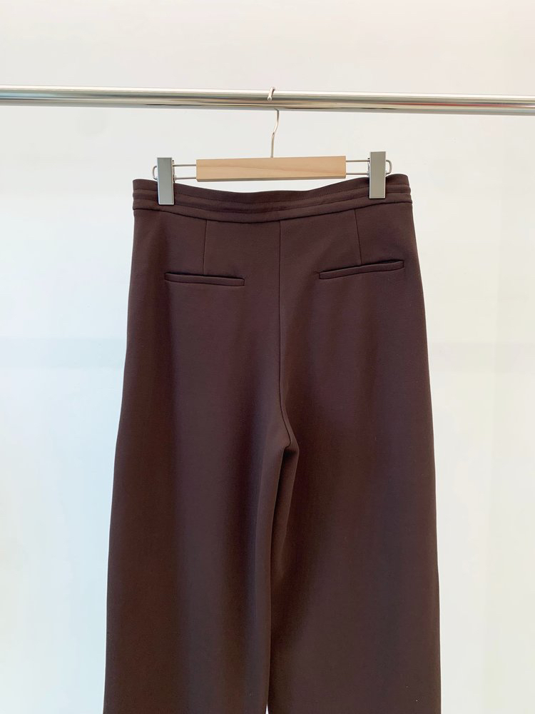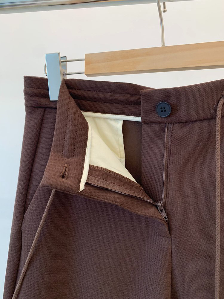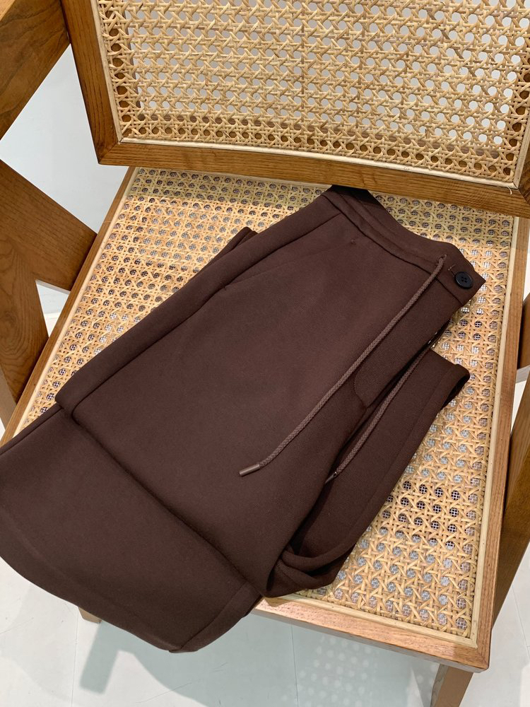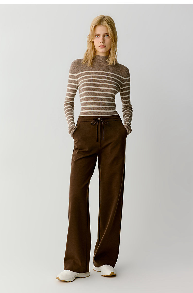 羊毛混纺罗马布抽绳裤直筒裤 简洁修身裤型 罗马布结构稳定 穿着舒适 松紧抽绳腰带设计 自由调节松紧度 简约大气 高腰宽松版型