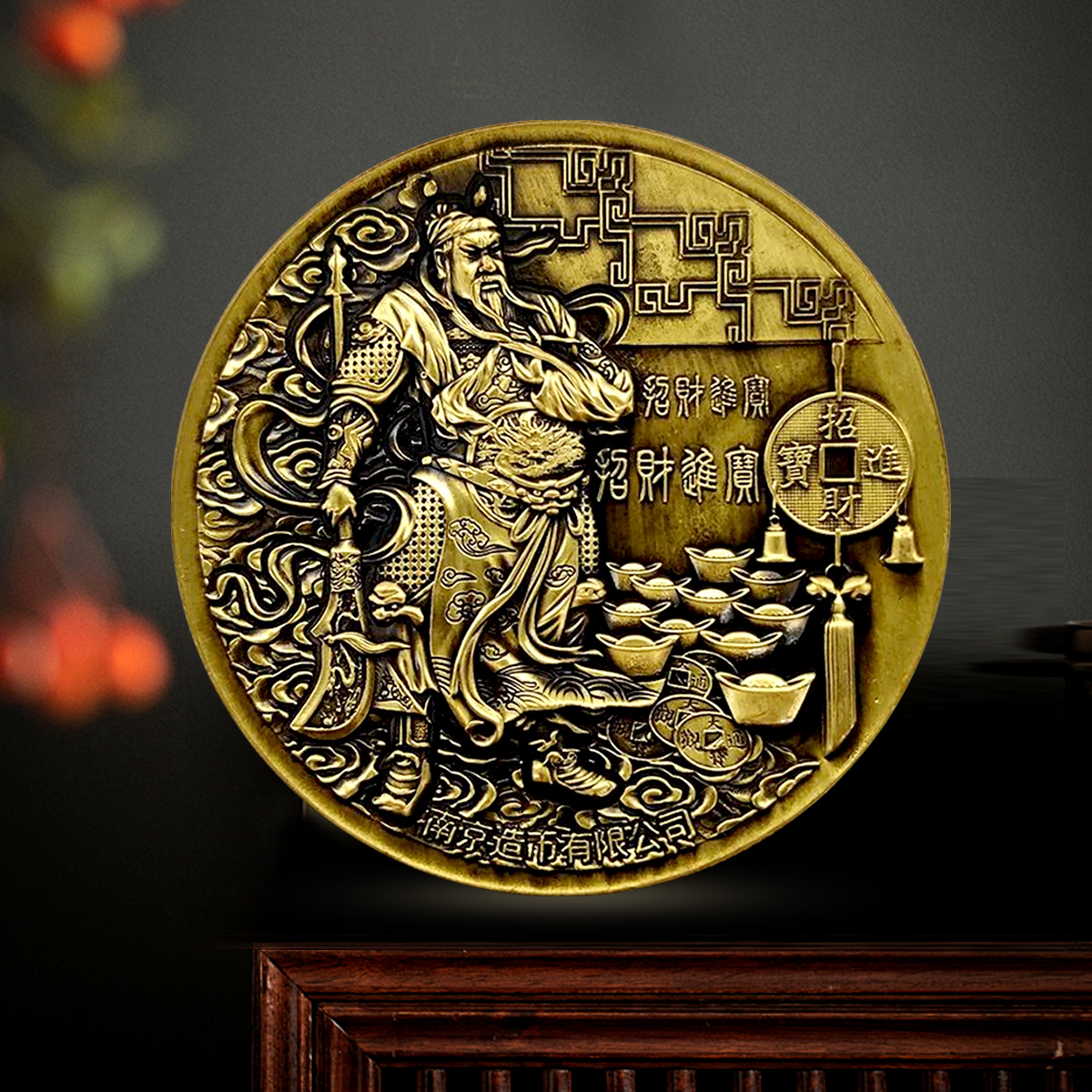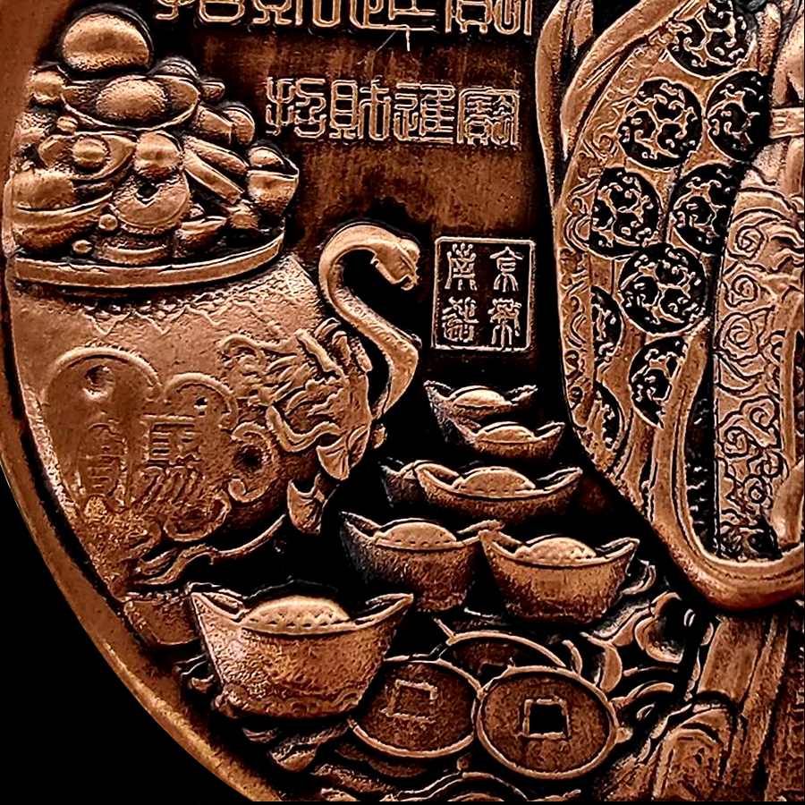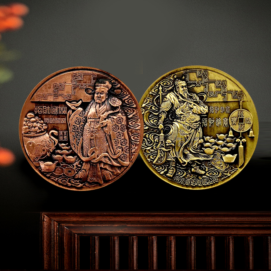 这枚纪念章采用了双金属压印工艺,正面是黄铜材质的武财神,背面则是紫铜材质的文财神,文武双全,寓意美好。