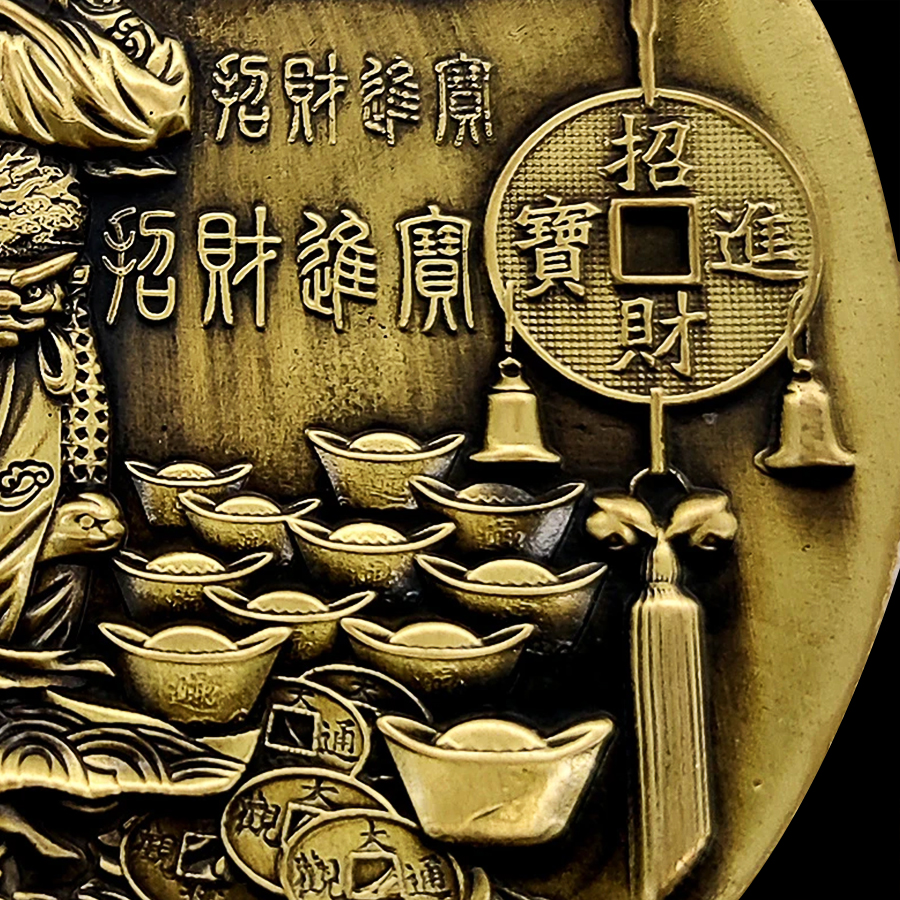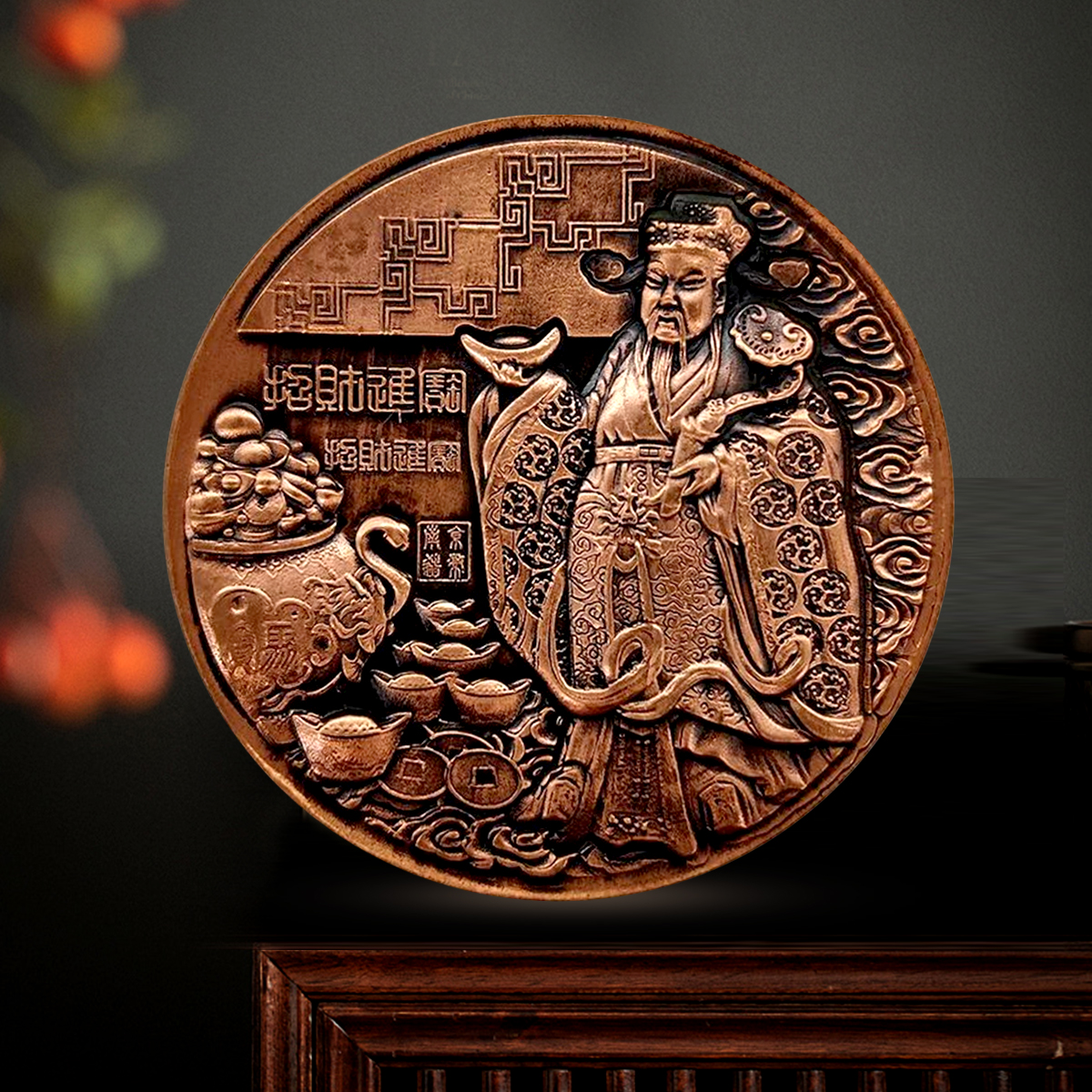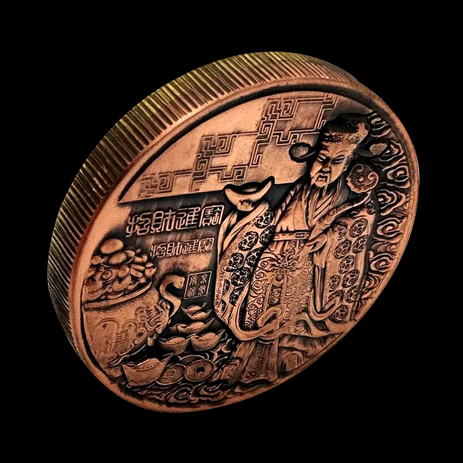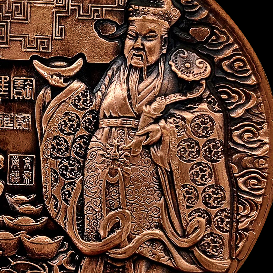 这枚纪念章采用了双金属压印工艺,正面是黄铜材质的武财神,背面则是紫铜材质的文财神,文武双全,寓意美好。