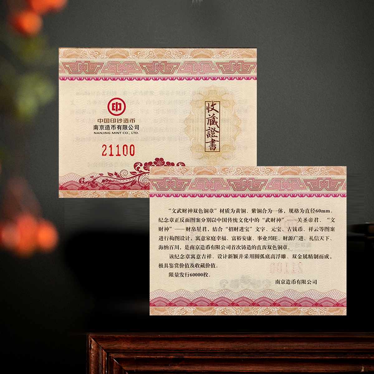 南京造币有限公司铸造的文武财神双色纪念章!限量发行仅60000枚!