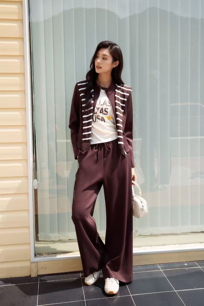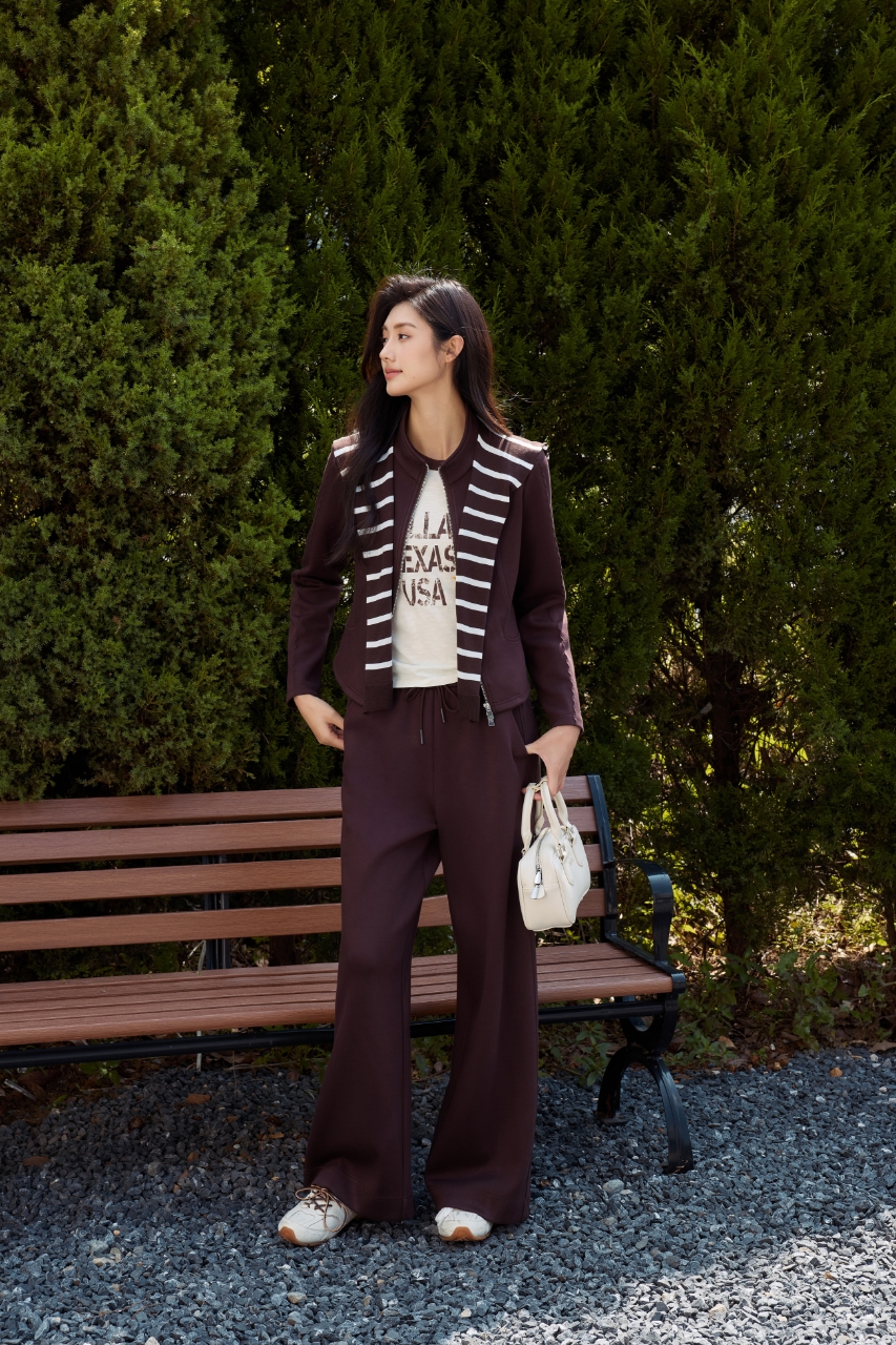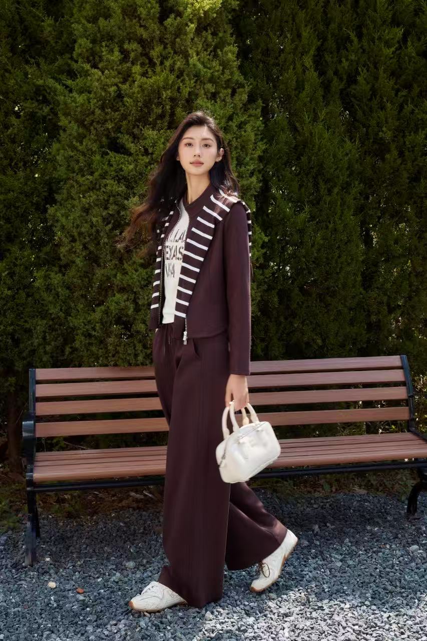 伯妮斯茵 | 简约休闲 栗壳色针织拼接外套 立领拉链设计 搭配条纹撞色披肩 日常通勤款 SZ3WAL66 - 栗壳色外套