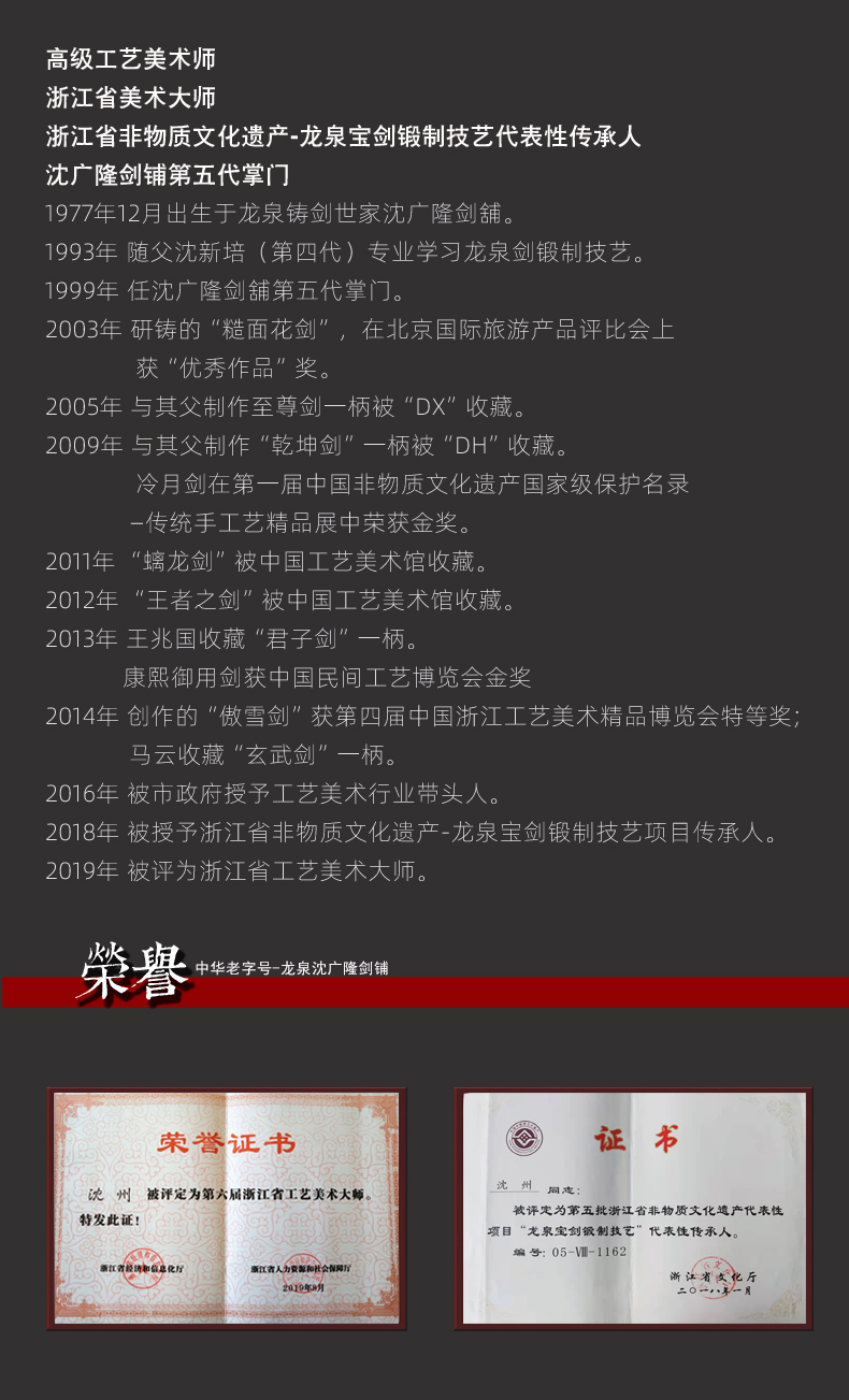 - 龙泉沈广隆剑舖创始于1885年(清光绪)位于浙江省龙泉市,是当地唯一一家“子承父业”一脉相承的中华老字号宝剑生产企业,是国家级非物质文化遗产龙泉宝剑项目保护单位,并以“天下第一剑”闻名于海内外....