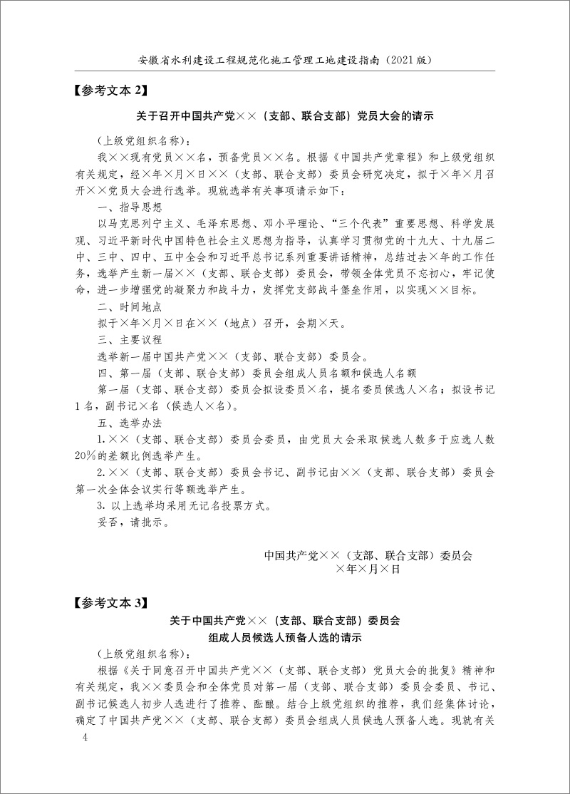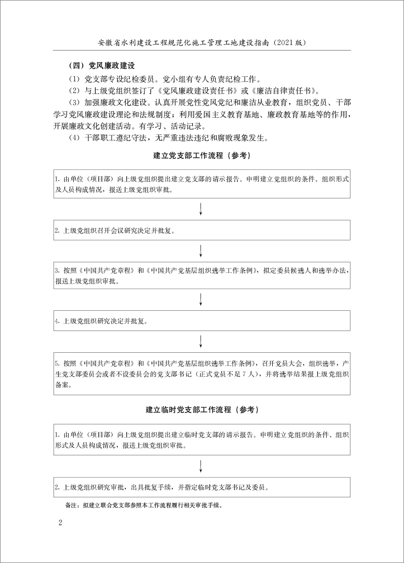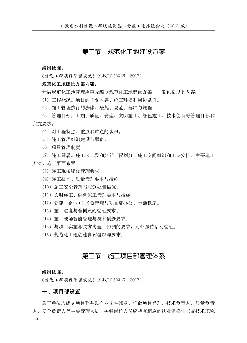本指南系对《安徽省水利建设工程规范化施工管理工地建设评选标准》的进一步分解和细化,共分8章,包括工程建设施工中的综合管理、文明施工、质量管理、安全管理、技术管理、进度管理、绿色施工和信息化管理的具体要求。