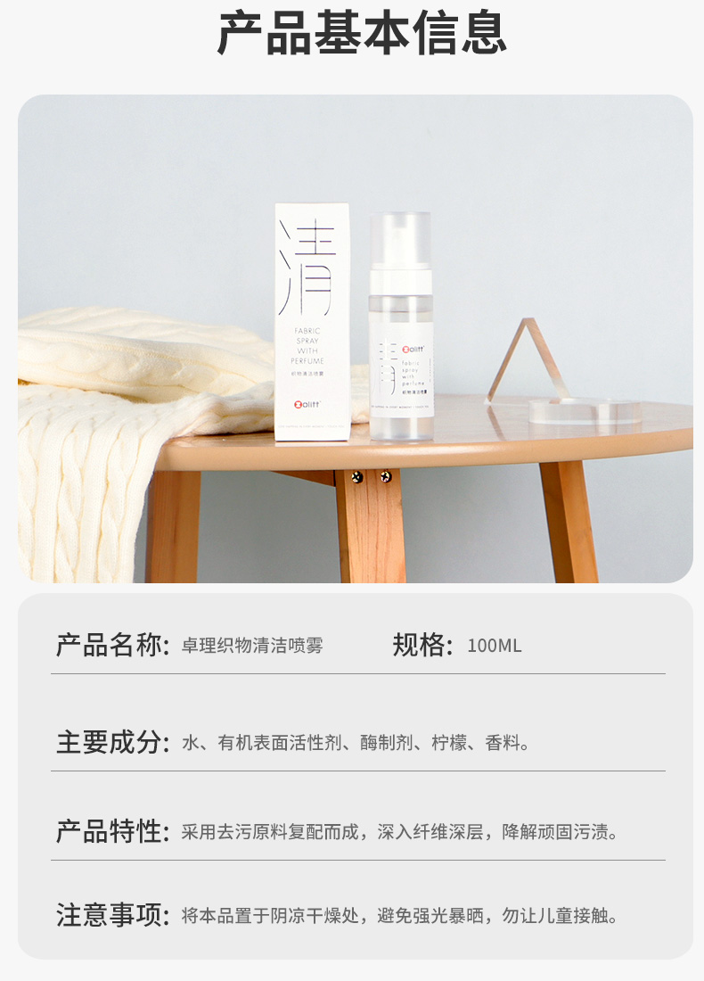 卓理护衣精华喷雾去渍剂去污喷雾衣物免洗抗皱除味抑菌除螨100ml