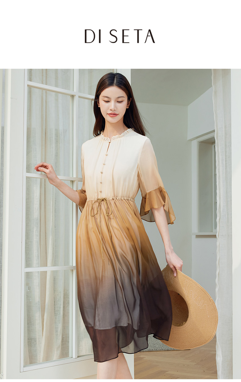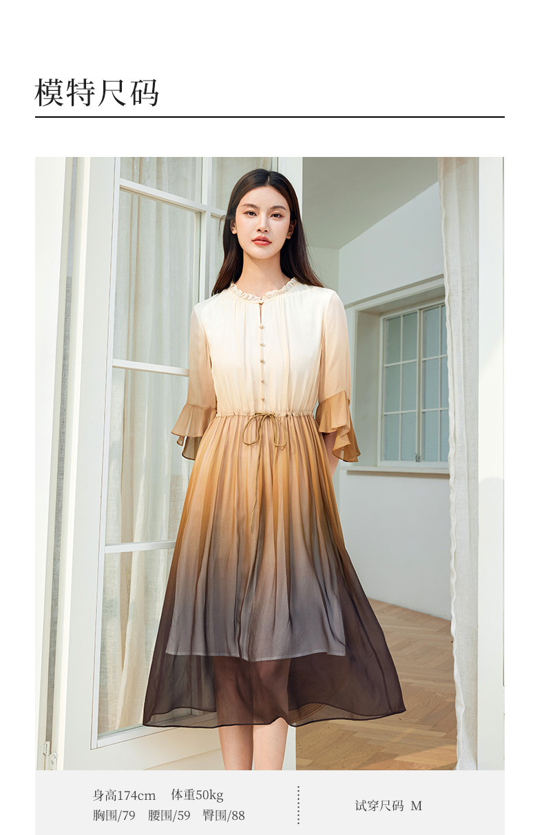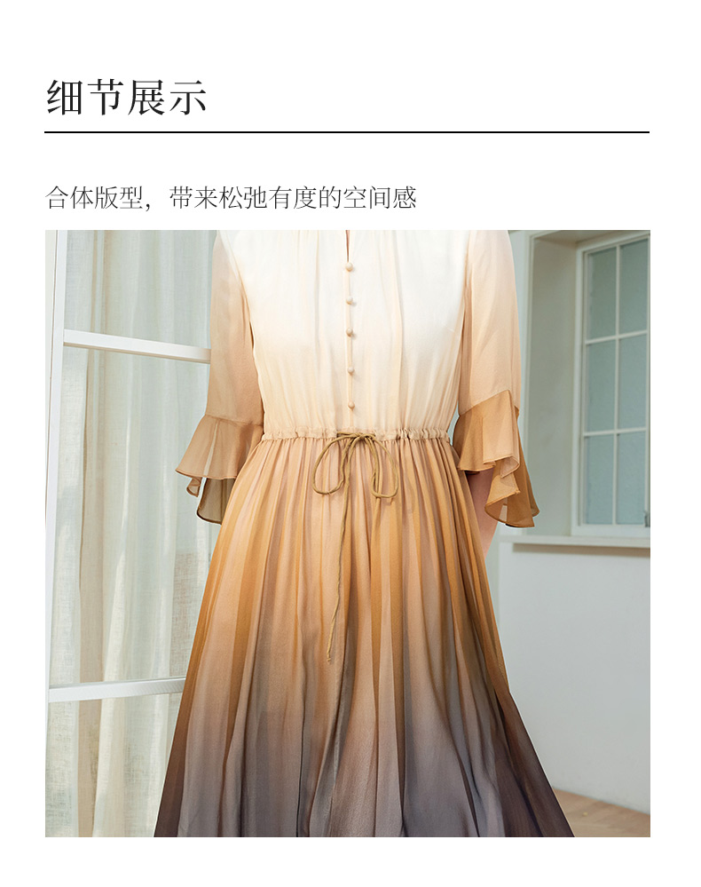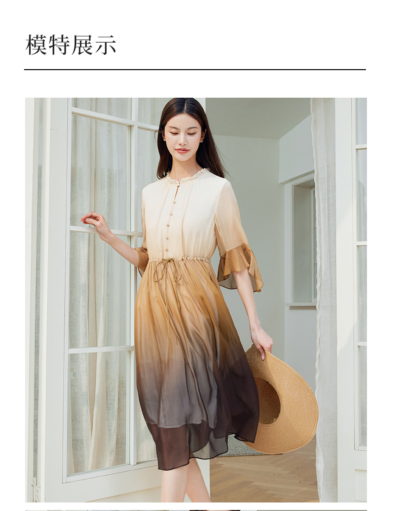 玳莎渐变印花乔其真丝连衣裙2024夏季新款系带抽褶拼接五分袖裙子 EB35309