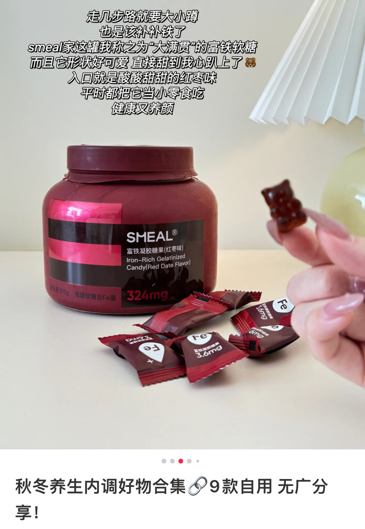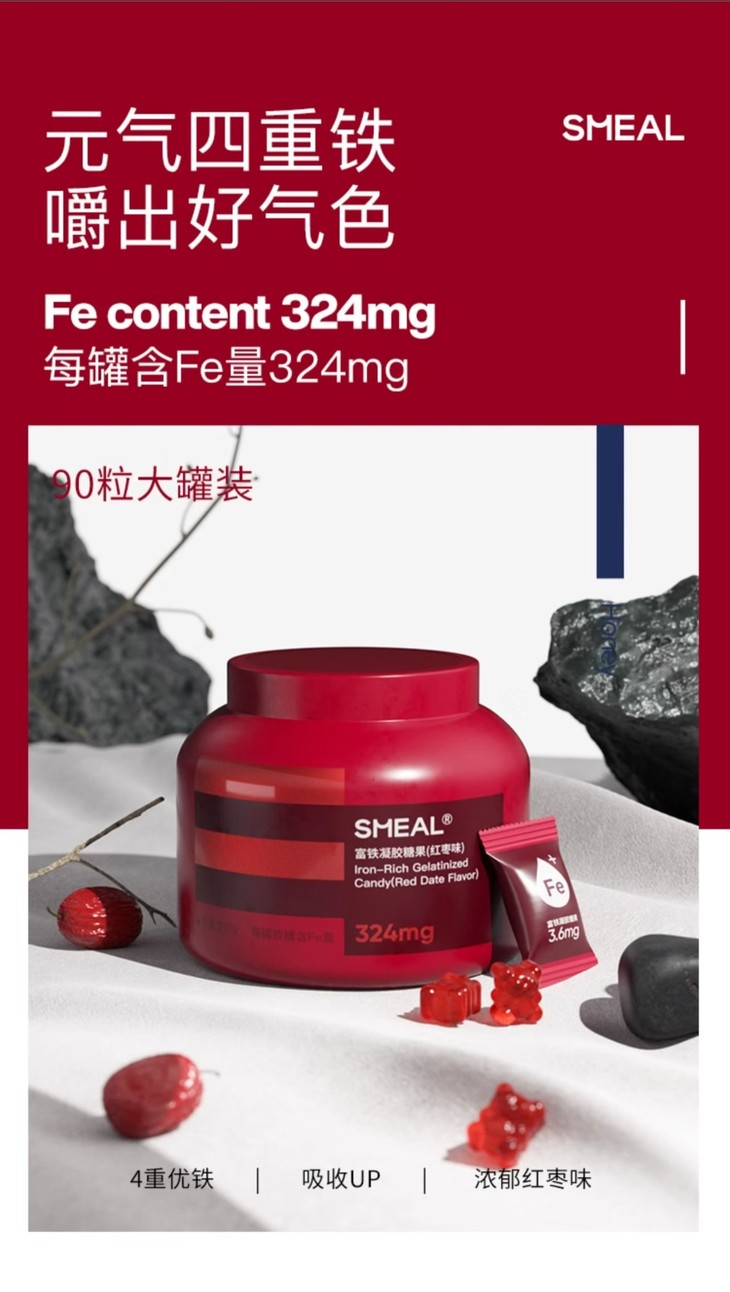 在中国,每5个人中就可能有1人正被缺铁性贫血困扰,尤其是婴幼儿、女性、老年人更是重点目标。而偏爱素食、少食红肉的朋友,面对铁摄入渠道的减少,更需要额外小补一下,除了上了很久的红铁元和镁铁宝,SMEAL富铁凝胶软糖也不错,Q弹软糯,好吃,也方便,既能解馋,又能给身体来点铁能量!