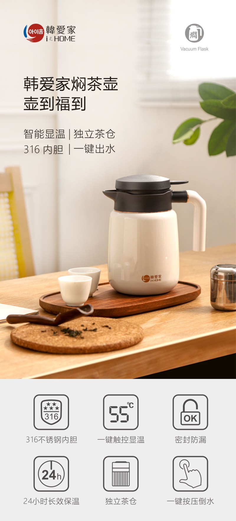 永利汇1升焖茶壶温显保温壶家用316不锈钢闷泡壶老白茶泡茶壶小型
