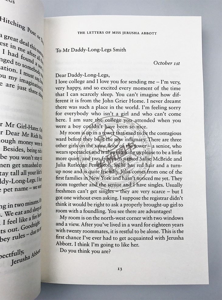 One of the classics of American children's literature, Daddy-Long-Legs tells the tale of Judy Abbott – an ebullient orphan beginning a college degree with the aim of becoming a writer – through her letters to the anonymous patron who is paying for her education.