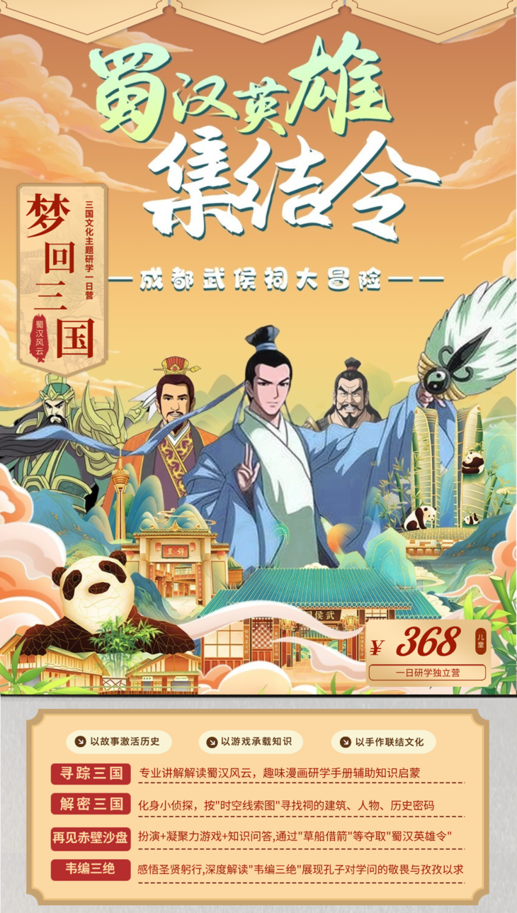 4.6已成团【蜀汉英雄集结令】三国文化主题活动研学一日营,专业讲解解读蜀汉风云,化身小侦探,按"时空线索图"寻找祠的建筑、人物、历史密码,深度解读"韦编三绝"展现孔子对学问的敬畏与孜孜以求。