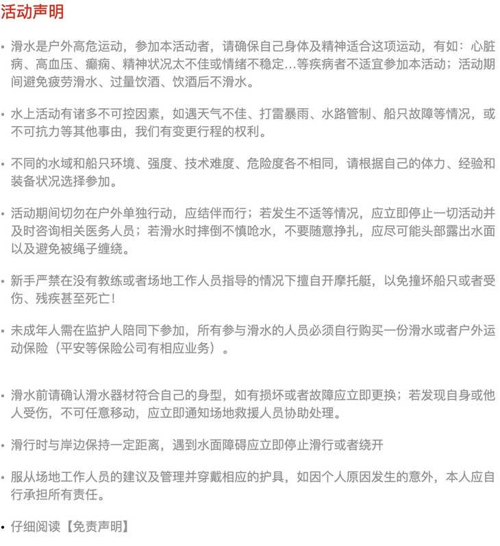 退改:由于团体统一订票,如因个人原因取消或没来,自带装备全额损