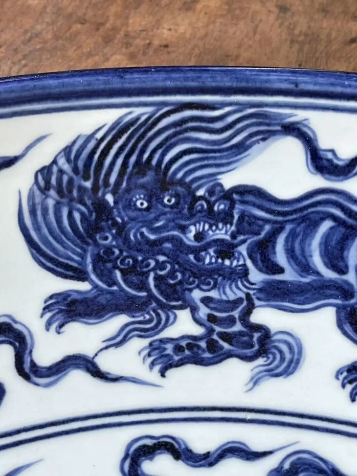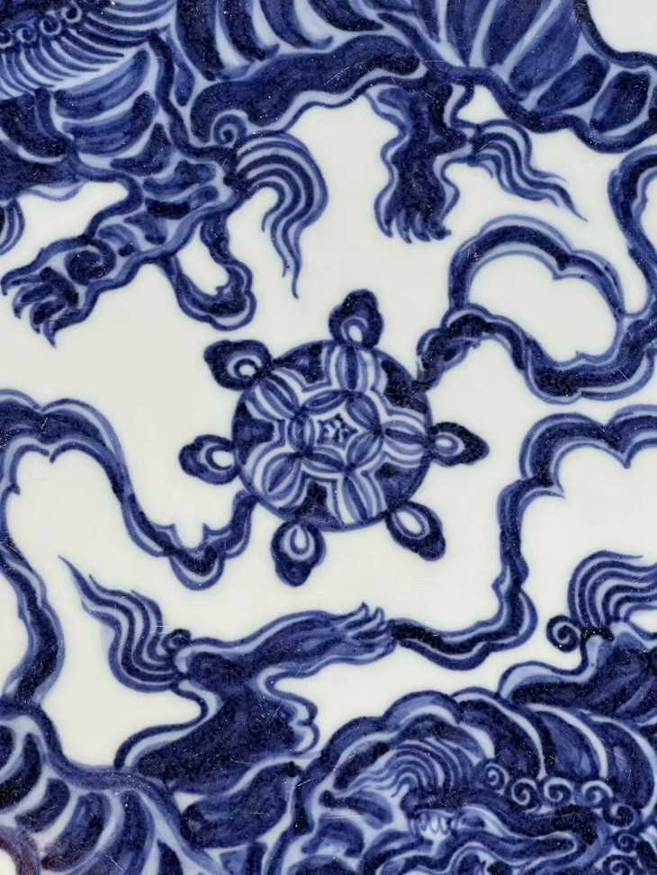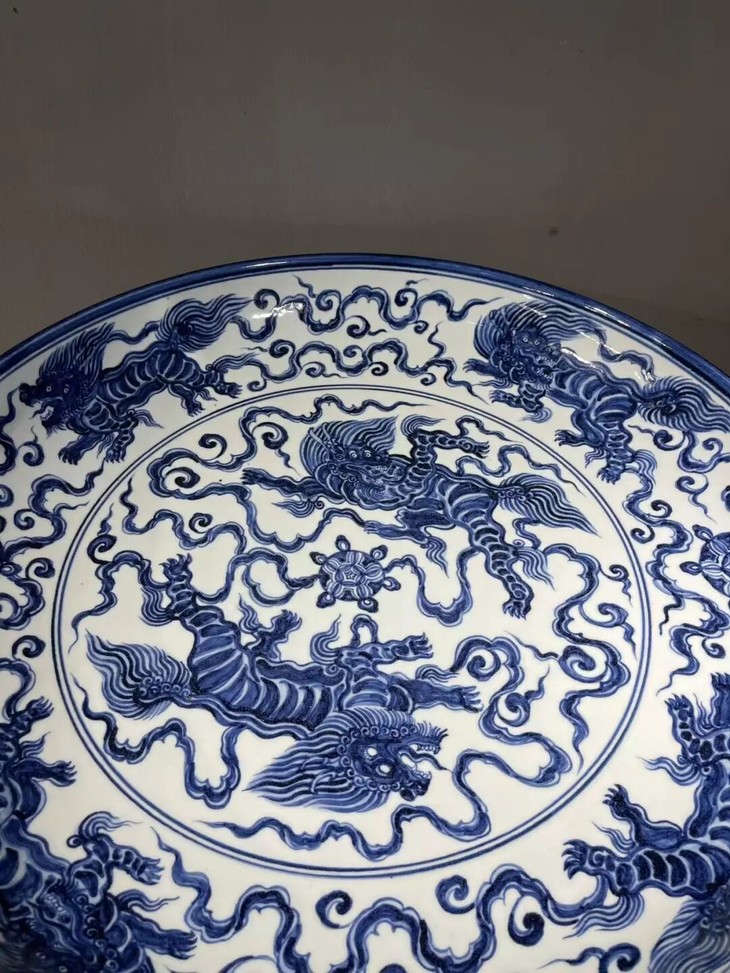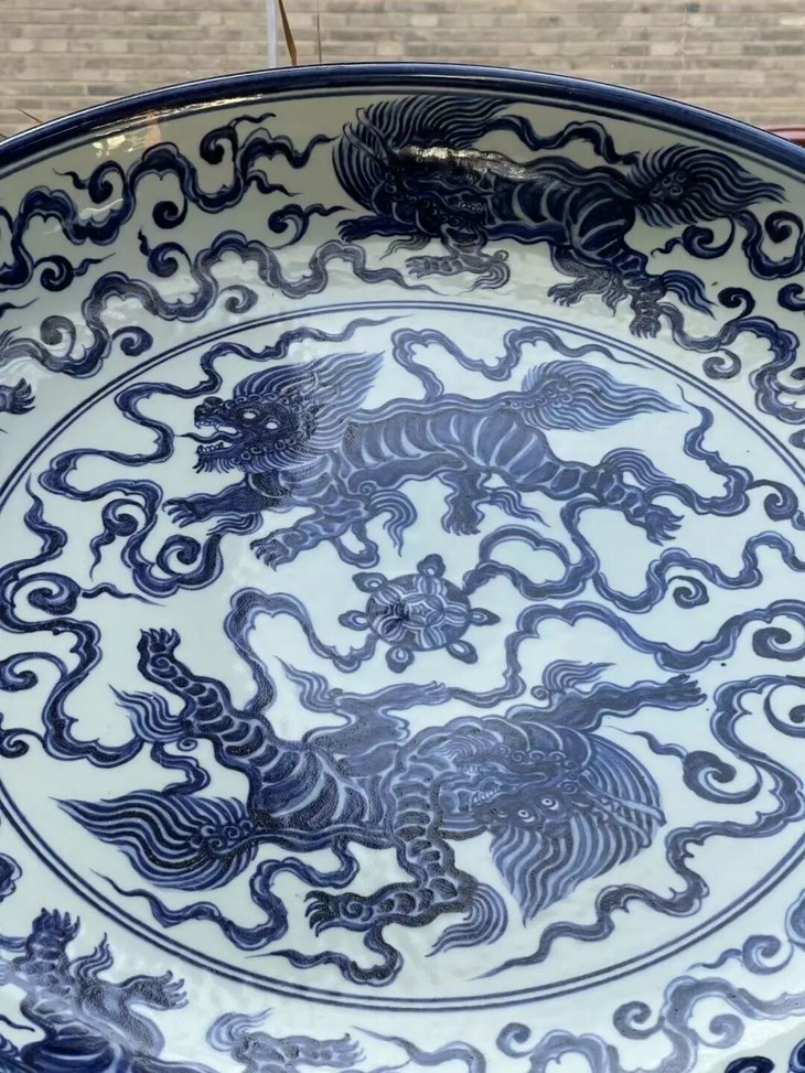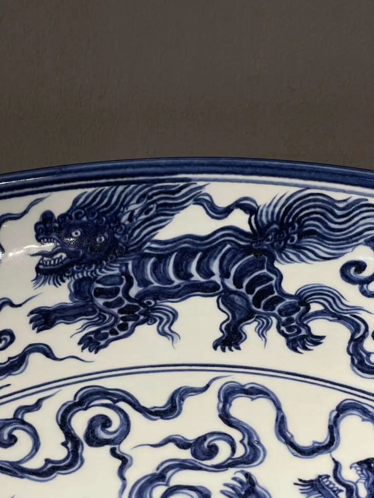 以昂贵画的高岭土及钴蓝料烧制如此碩大瓷盘,高温烧造废品率高,因此这件大盘,其烧造费用之昂贵可见一斑。