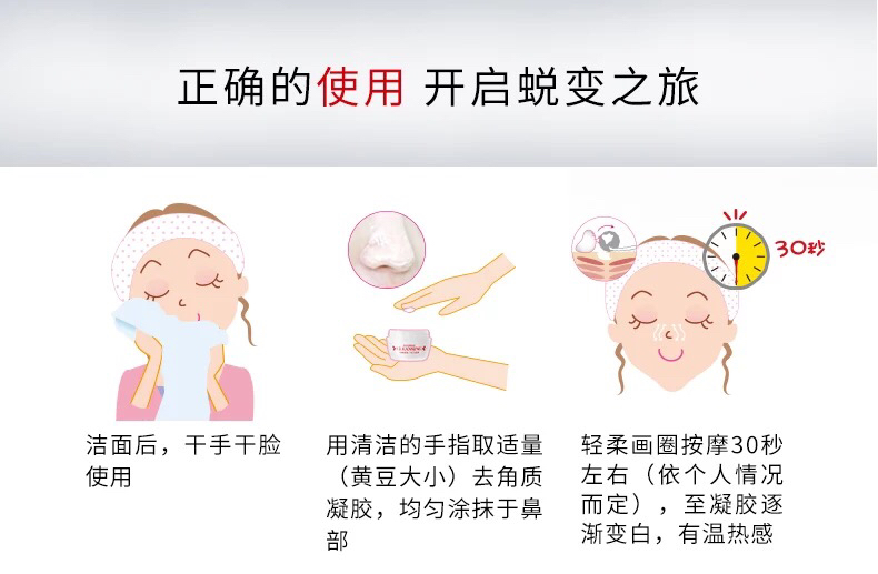 使用时有几点需要注意的,首先要确保皮肤是清洗后的,建议搭配三妆洁面和三妆去角质,按摩要轻柔温和,只要有黑头的位置都可以使用,比如常见的眉心,下巴,脸颊处。