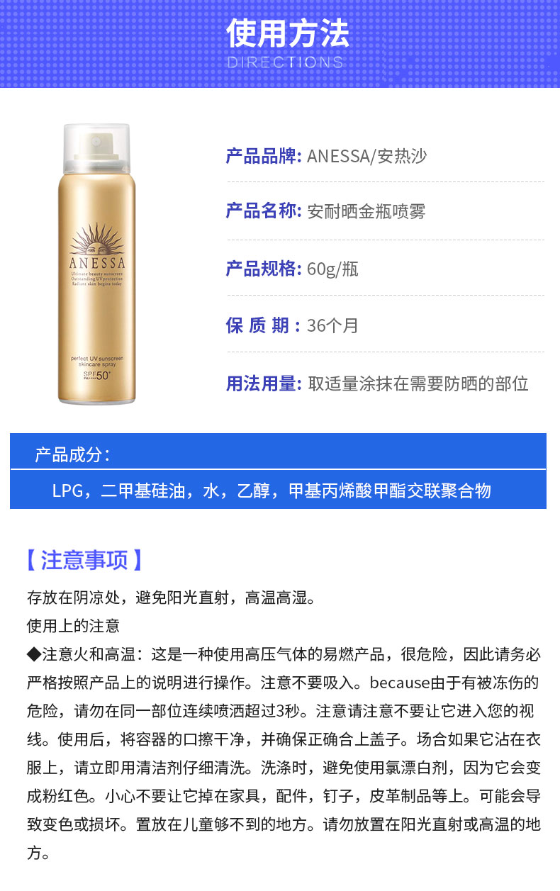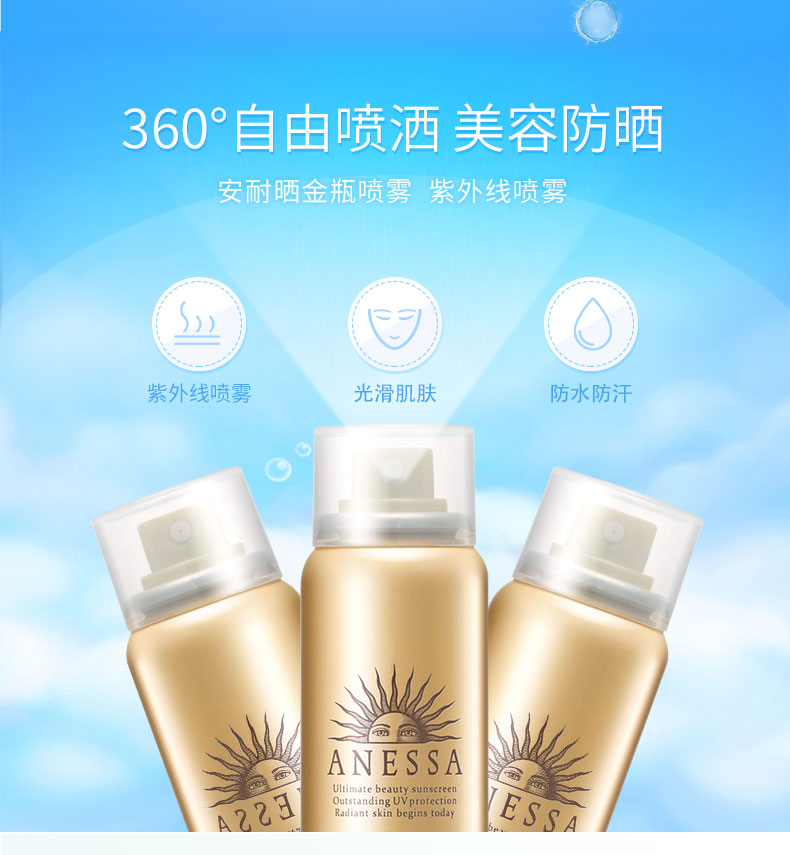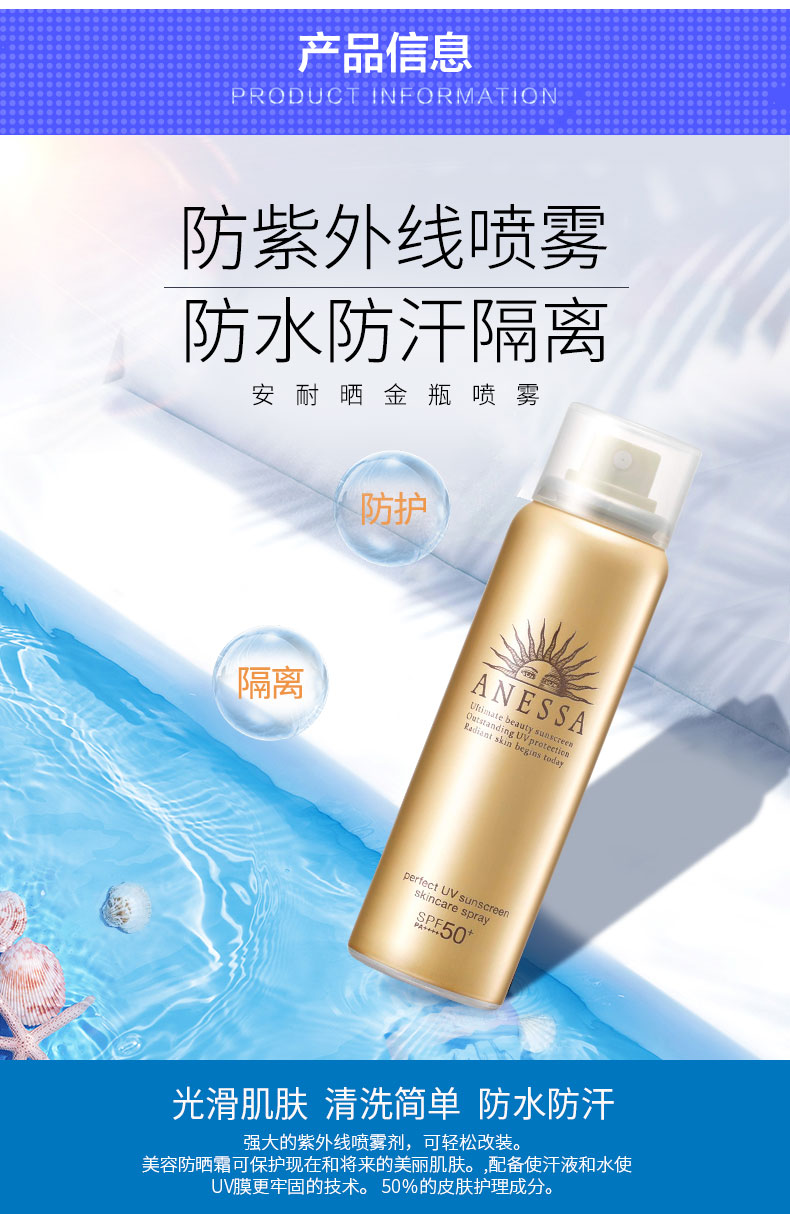 【一般贸易进口中文标】日本资生堂Shiseido 安耐晒金瓶防晒喷雾SPF50 60g