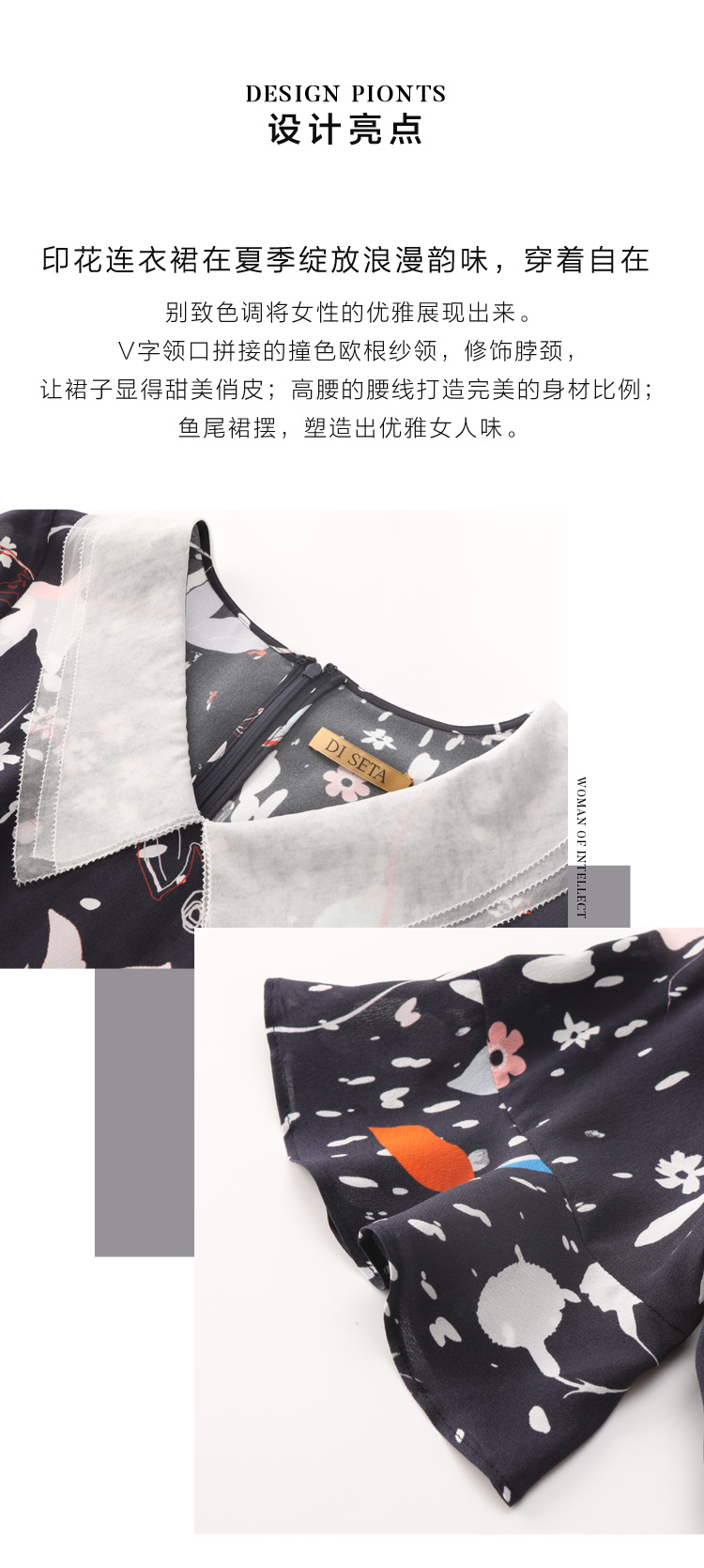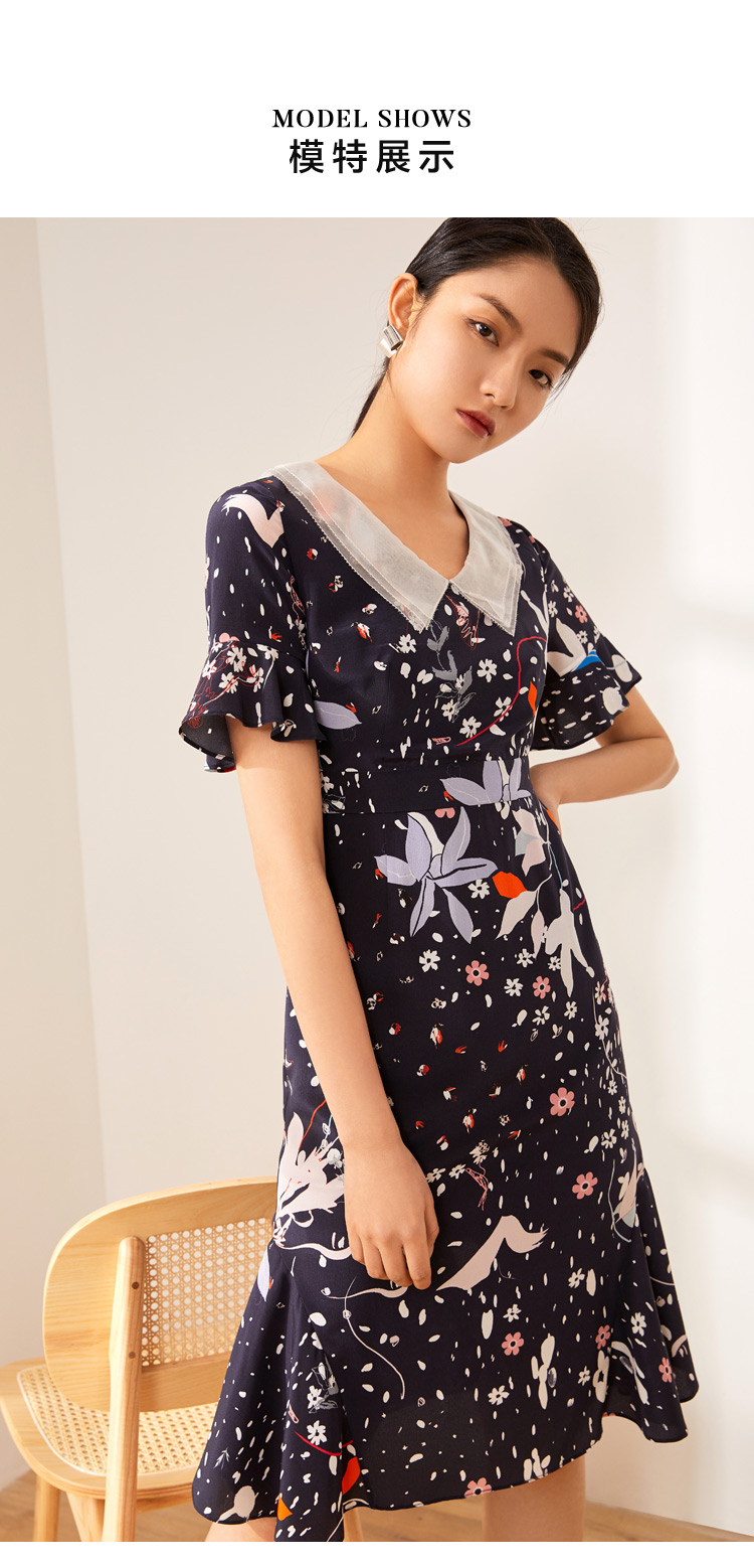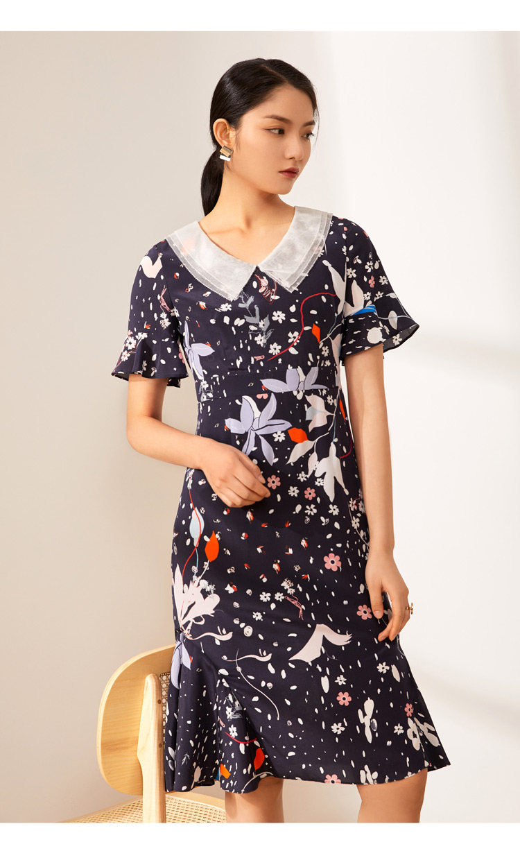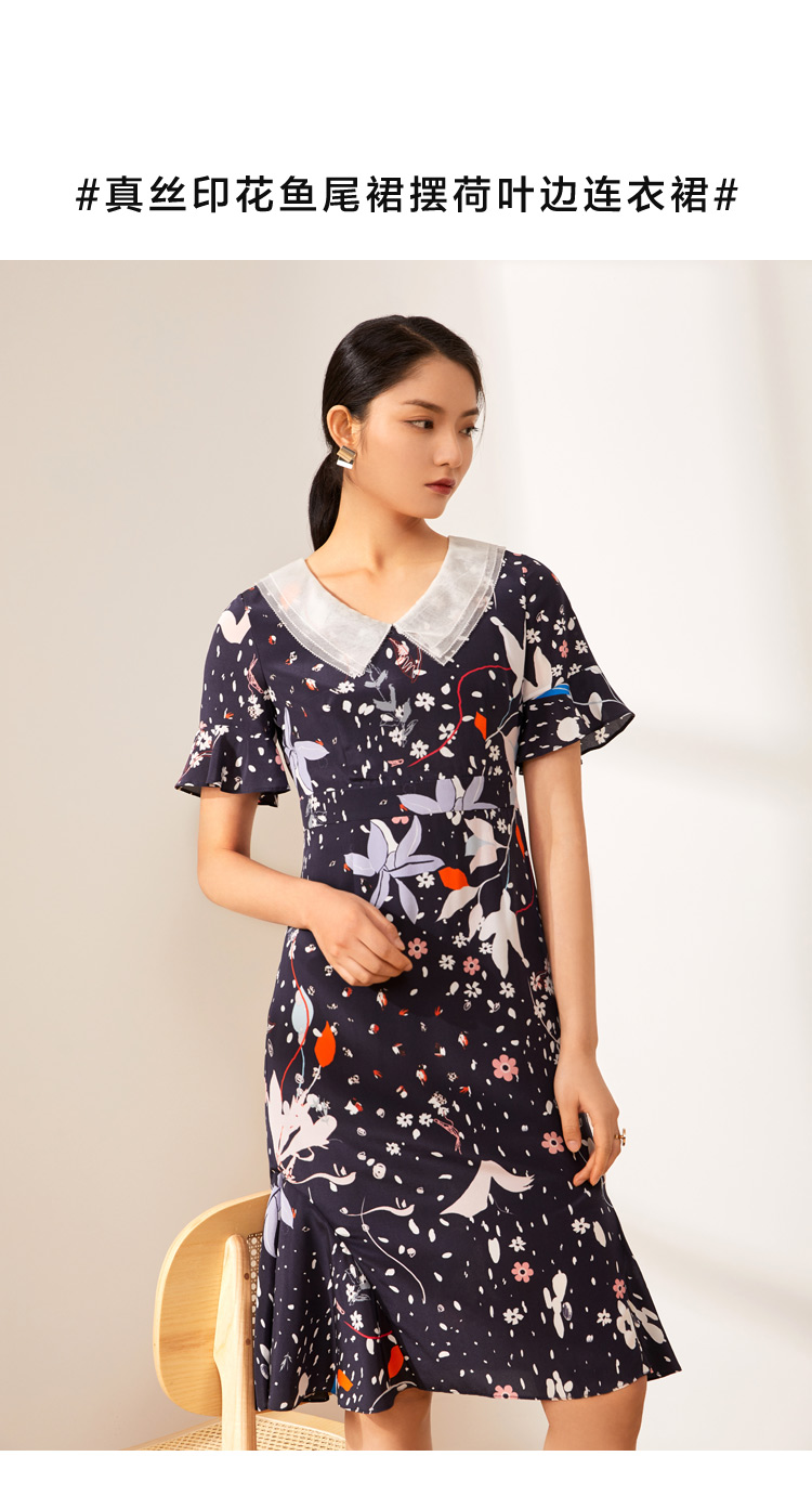 玳莎荷叶边真丝连衣裙女高端气质桑蚕丝中长款显瘦妈妈鱼尾裙 BB35102