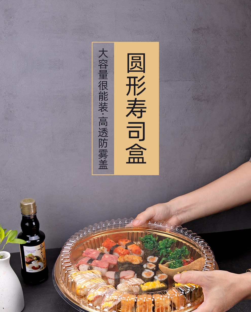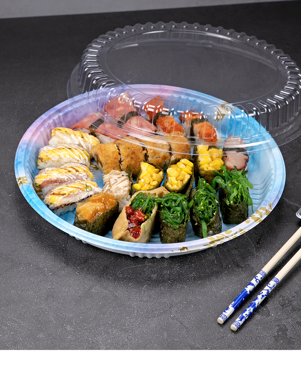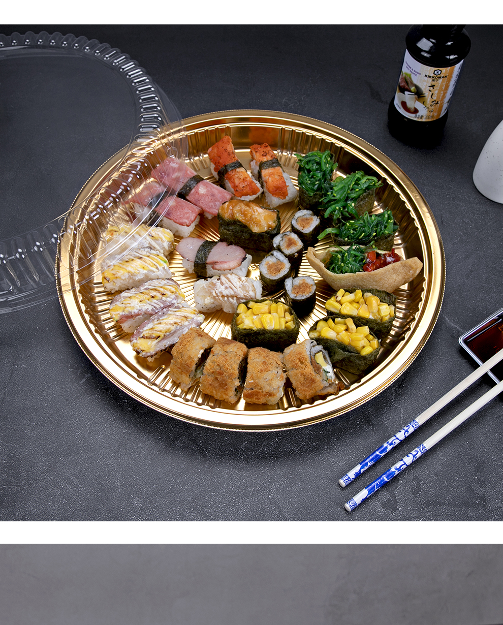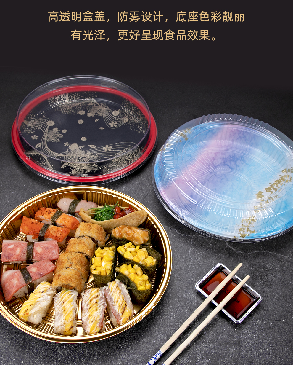 喇叭花圆形寿司盒寿喜锅拼盘海鲜烧鹅外带盒一次性外卖盒圆形刺身盒印花双层拼盘